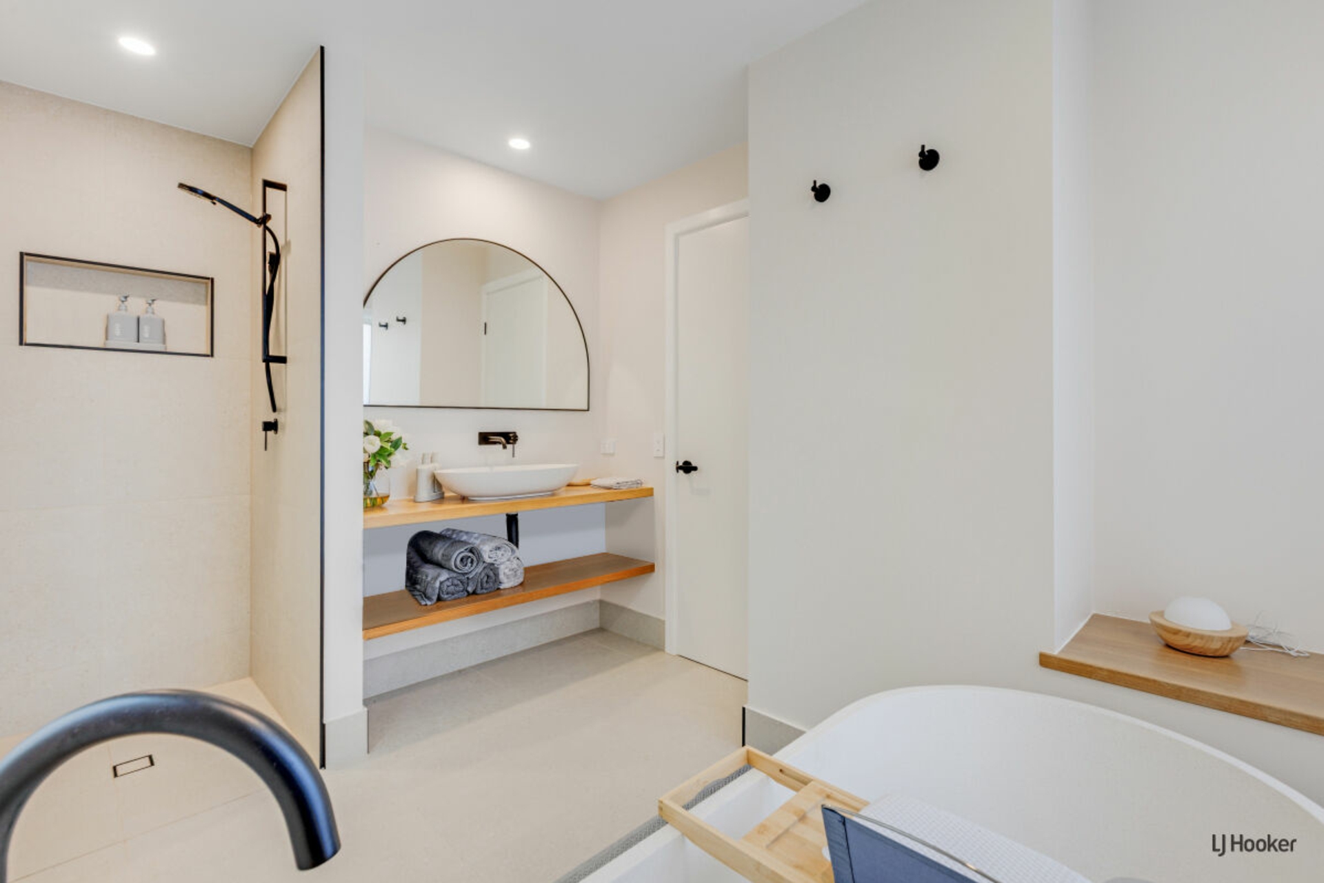 All three bathrooms are beautifully finished showcasing contemporary elegance, features include a stunning twin-basin vanity, freestanding stone bathtub and blackbutt timber accents with stylish designer touches and quality fixtures.