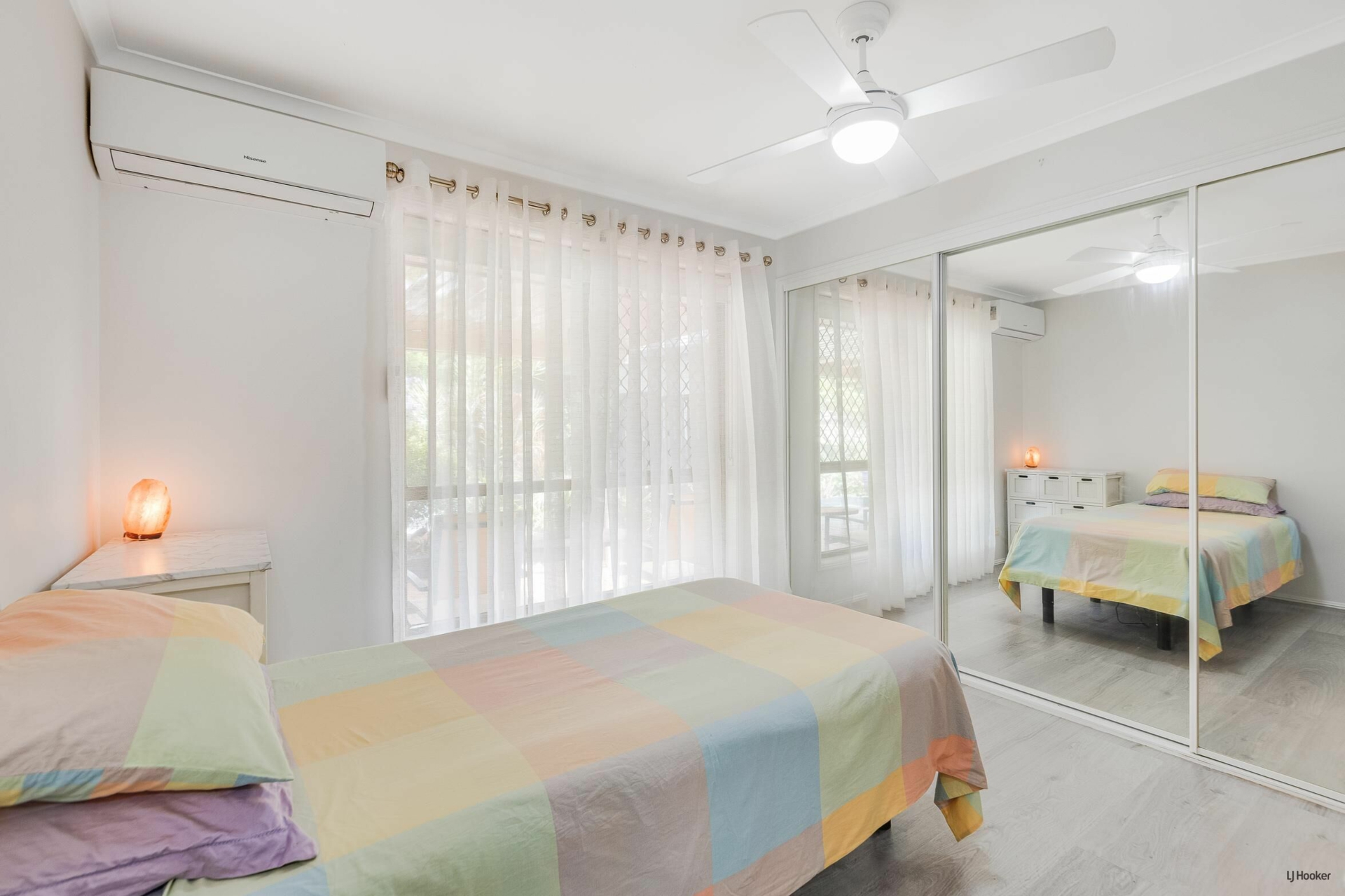 - Main bedroom with air-conditioning, mirrored built in robe and ceiling fan,