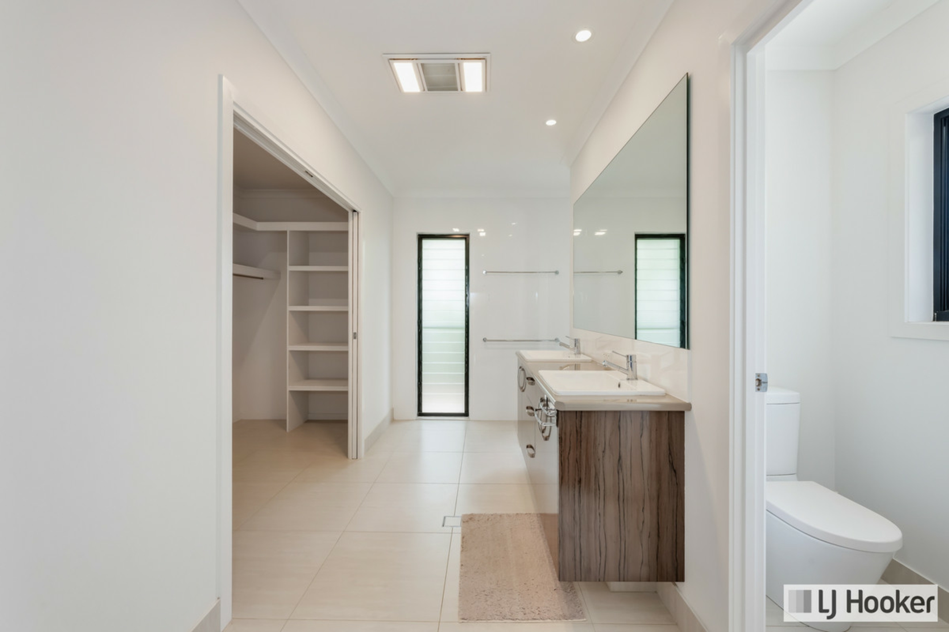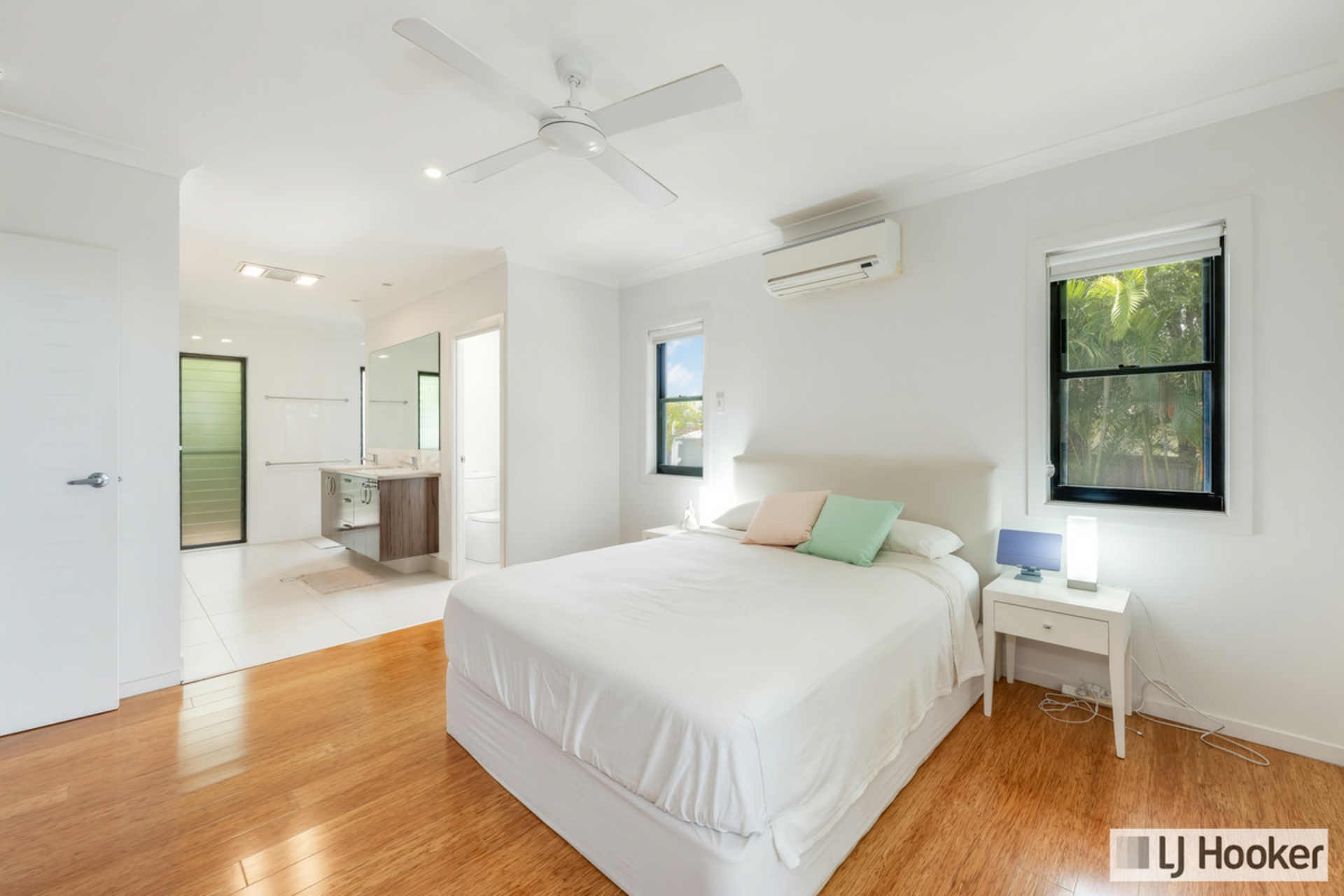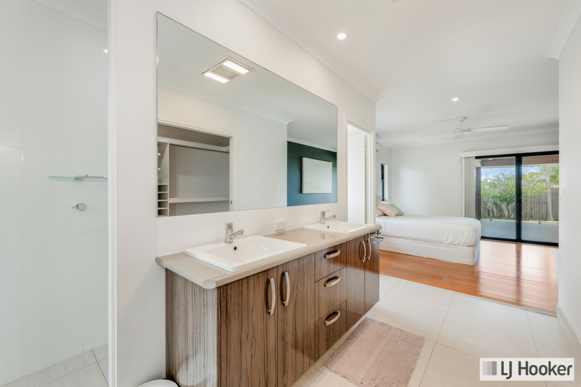 Accommodation is generous, with four well-proportioned bedrooms all featuring built-in robes, ceiling fans, and split-system air-conditioning. The master suite is impressive in size and comfort, offering direct access to the outdoor entertaining area, a large walk-in robe, and a spacious ensuite complete with dual vanities.