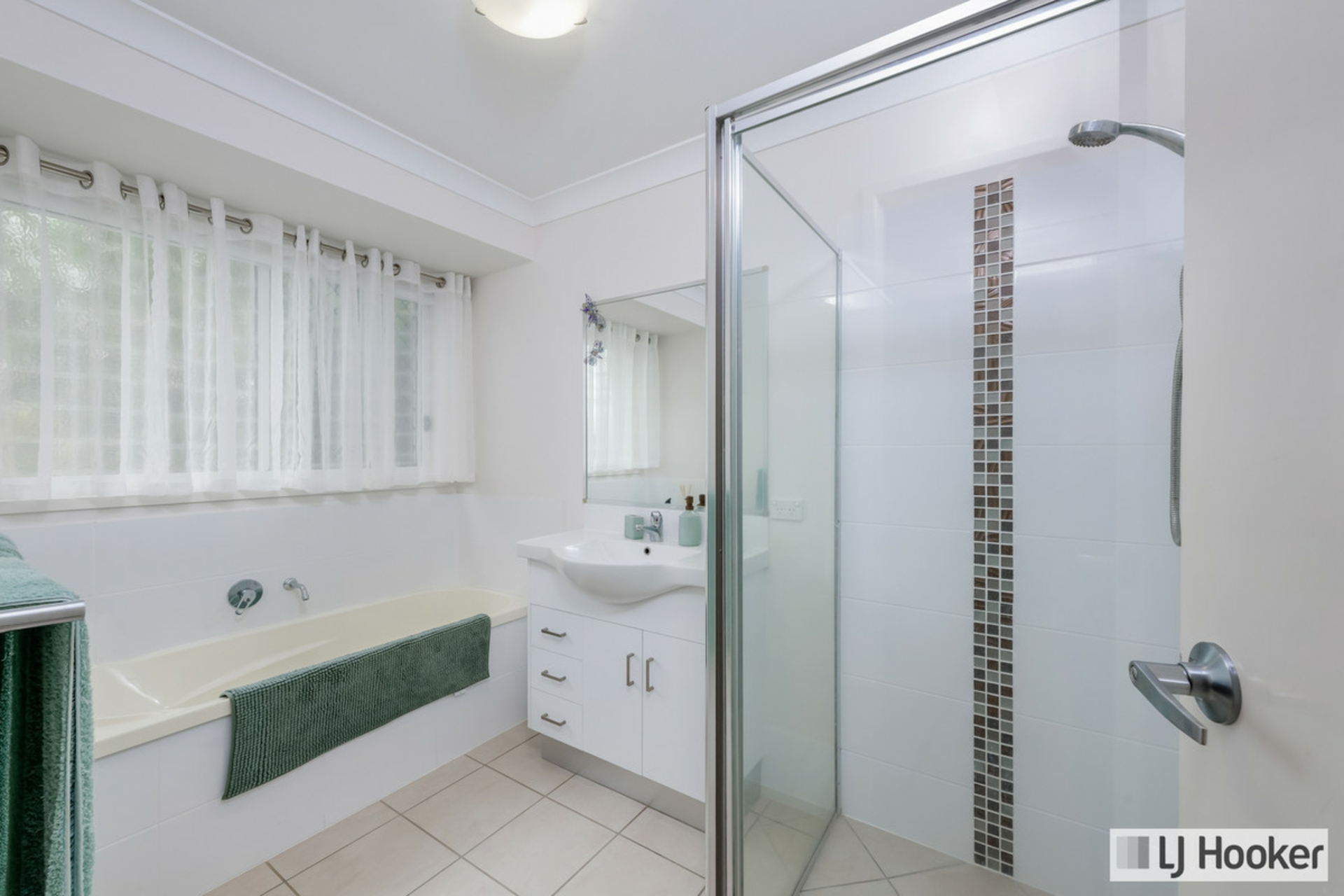 The master suite offers a peaceful private retreat, complete with air conditioning, ceiling fan, built-in storage, and its own ensuite. The additional bedrooms are all well-sized, featuring built-in wardrobes and ceiling fans, ensuring comfort for family members or guests alike. The main bathroom is well-appointed with quality finishes, a separate shower, and bathtub for added convenience.