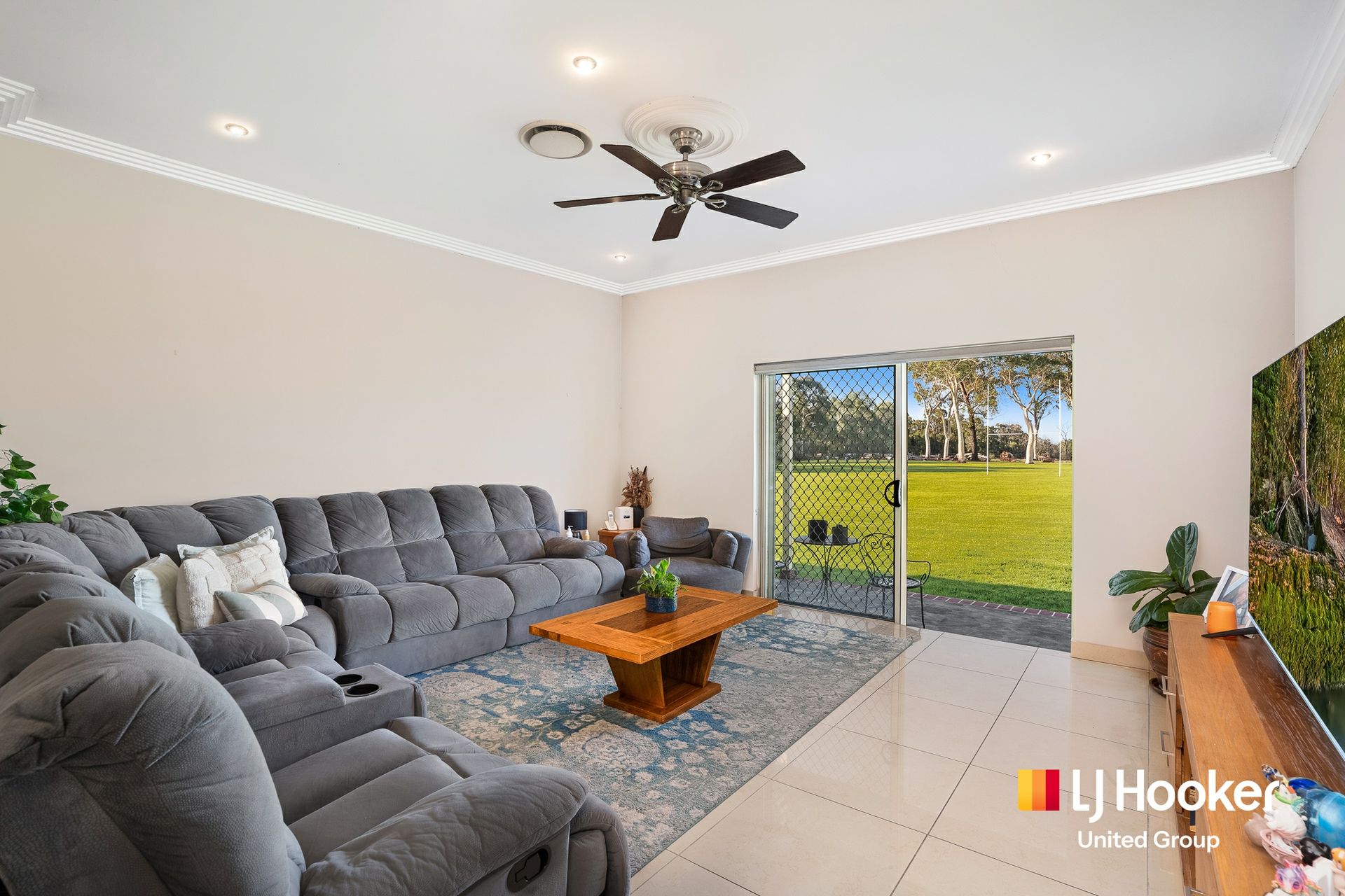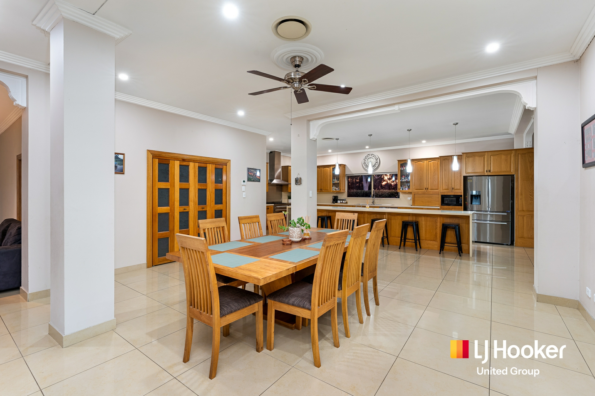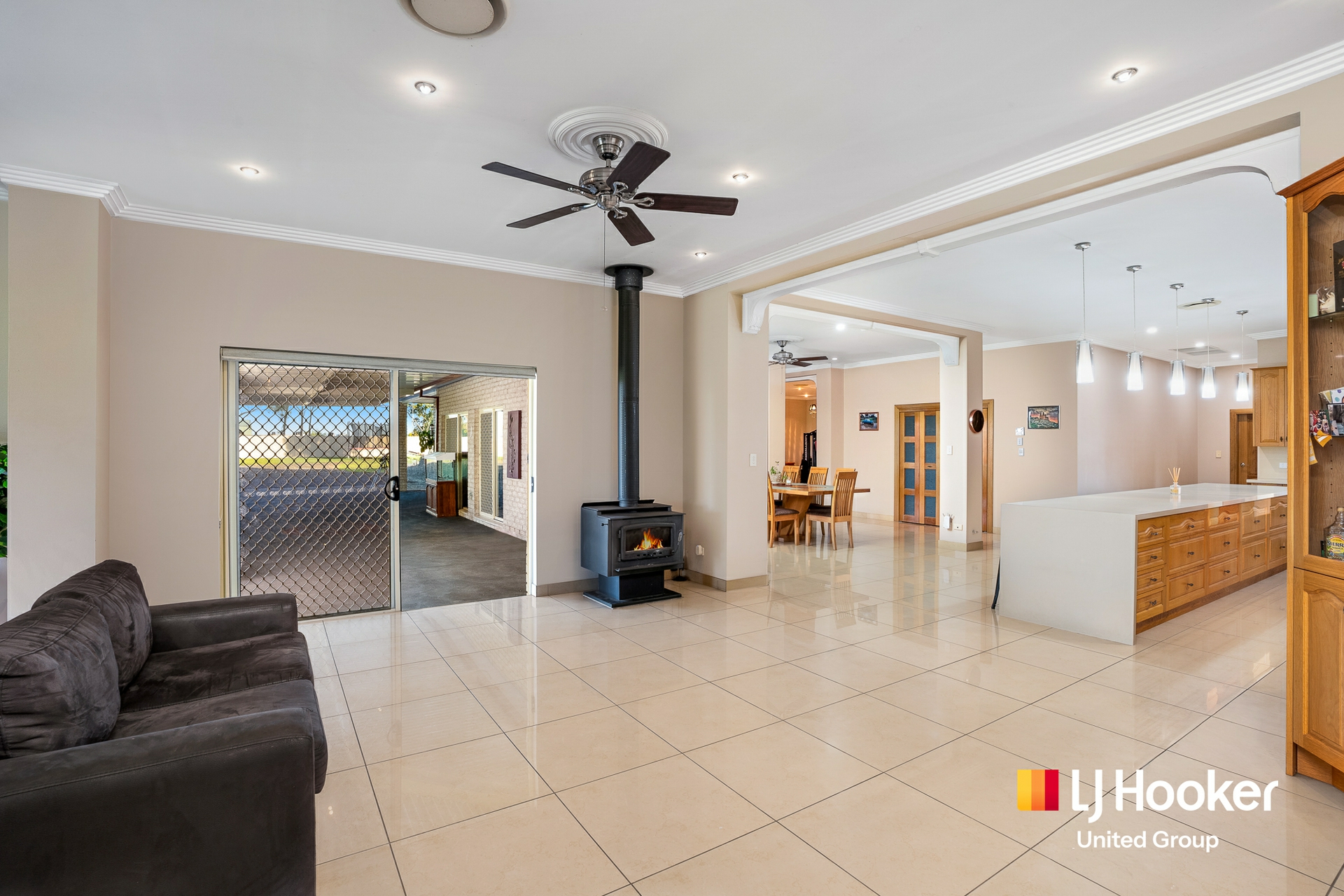 Inside, high ceilings, tiled interiors and multiple oversized living areas create a home that feels open, practical and easy to live in. The kitchen sits at the heart of it all, complete with stainless steel appliances, a huge gas oven and a large island bench where everyday life naturally gathers.