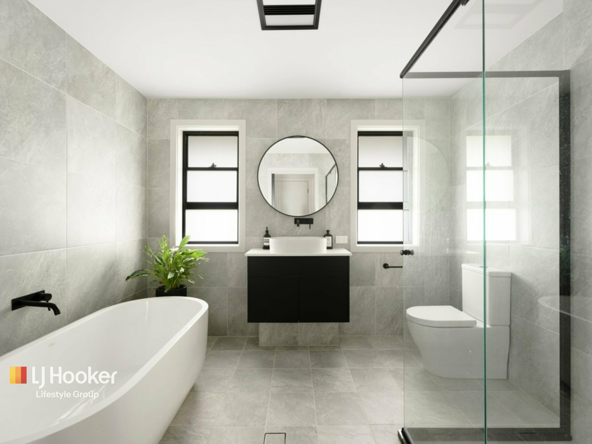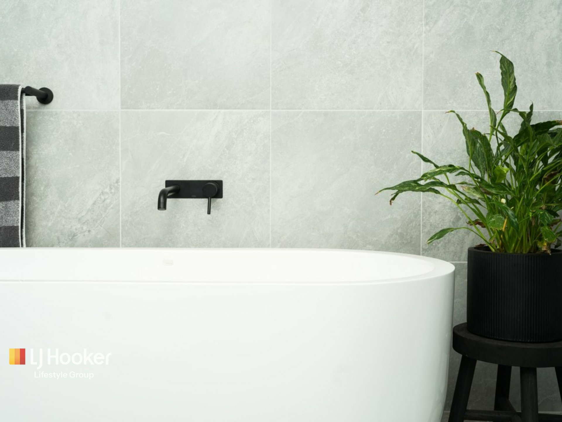 - Well-appointed main bathroom with floor-to-ceiling tiles, oversized bathtub, and Hamptons styling