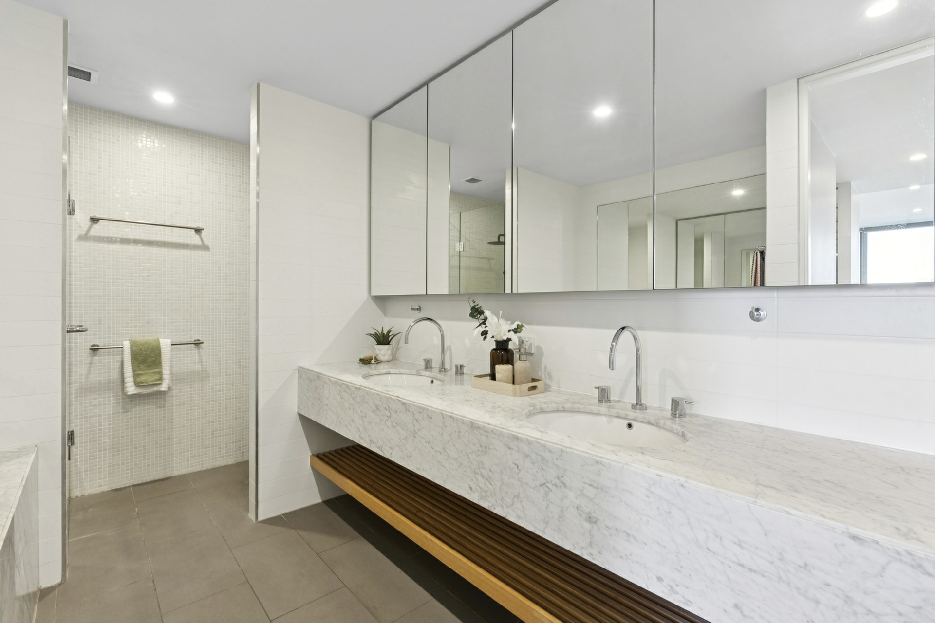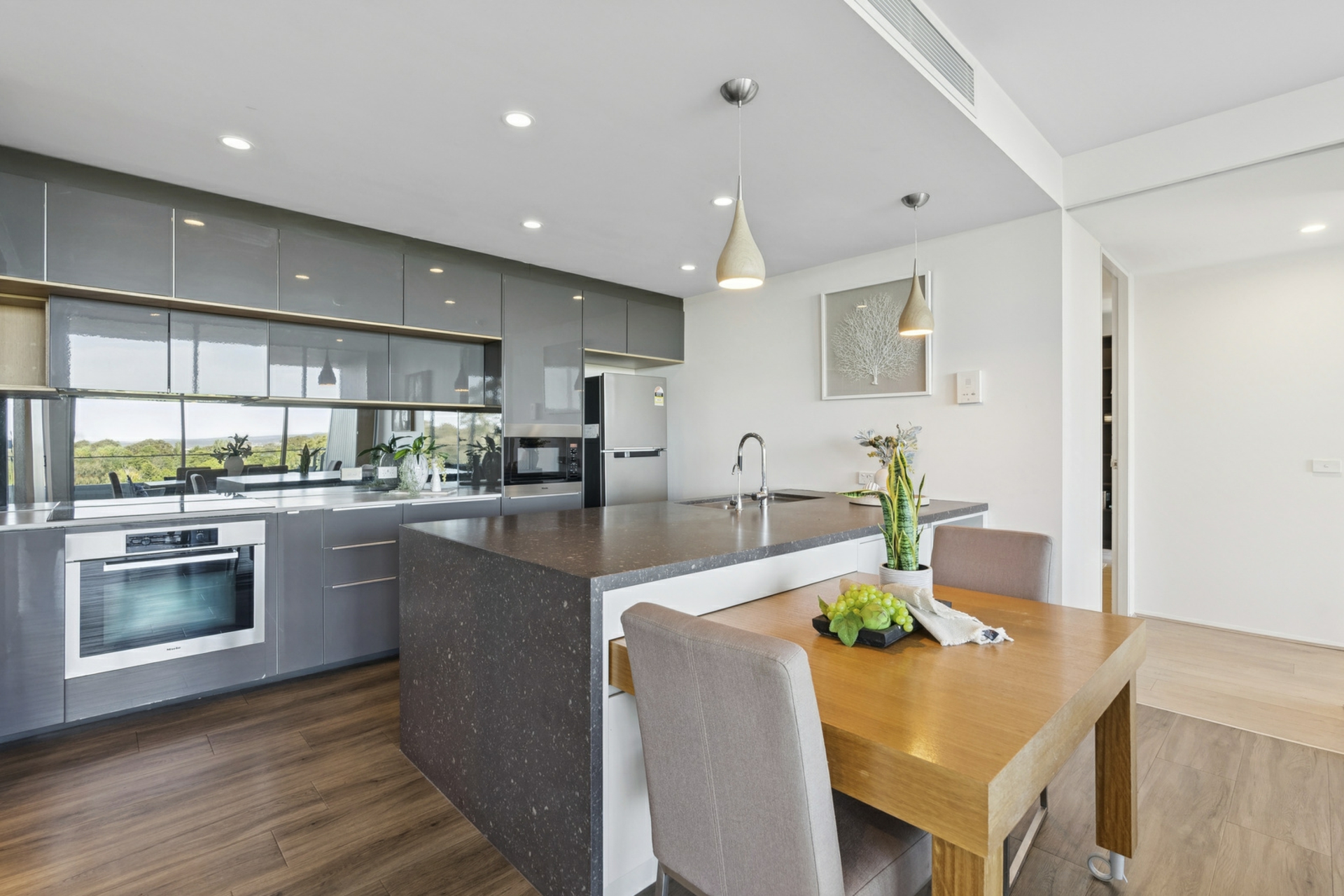 Timeless elegance envelopes you with warmth throughout a flowing layout with expansive living and dining connecting to a generous kitchen; meticulously appointed with a large butler's pantry and ample cupboard space, stone waterfall benchtops, Miele appliances including integrated microwave plus retractable dining table. Floor to ceiling glass open to a private alfresco balcony where a specular view forms the backdrop to any alfresco desire.