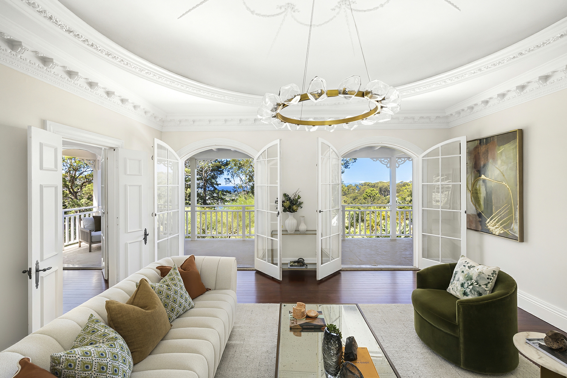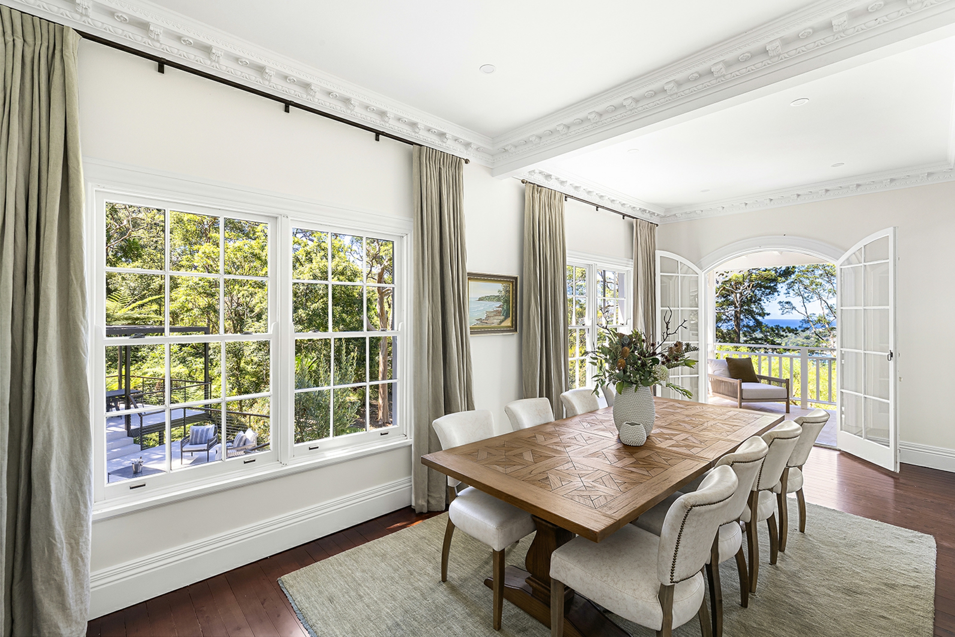 Commanding just over an acre, this exquisite single level residence embodies a sense of quiet grandeur and enduring prestige reserved for truly exceptional blue ribbon estates. Period elegance defines the interiors through ornate plasterwork and refined picture windows, while etched limestone detailing enriches the exterior, framing leafy outlooks across boat studded Pittwater to the ocean, where the moon casts its evening glow. Grand yet deeply liveable, it offers a rare sense of scale without excess, inviting long lunches on the verandah or alfresco pavilion, unhurried afternoons in the sun drenched garden and an immediate exhale on arrival. Privacy is complete and nature feels ever present, with wallabies a familiar sight, while village shops and cafés remain close at hand. A unique coastal home for those unwilling to compromise on style, serenity or address.