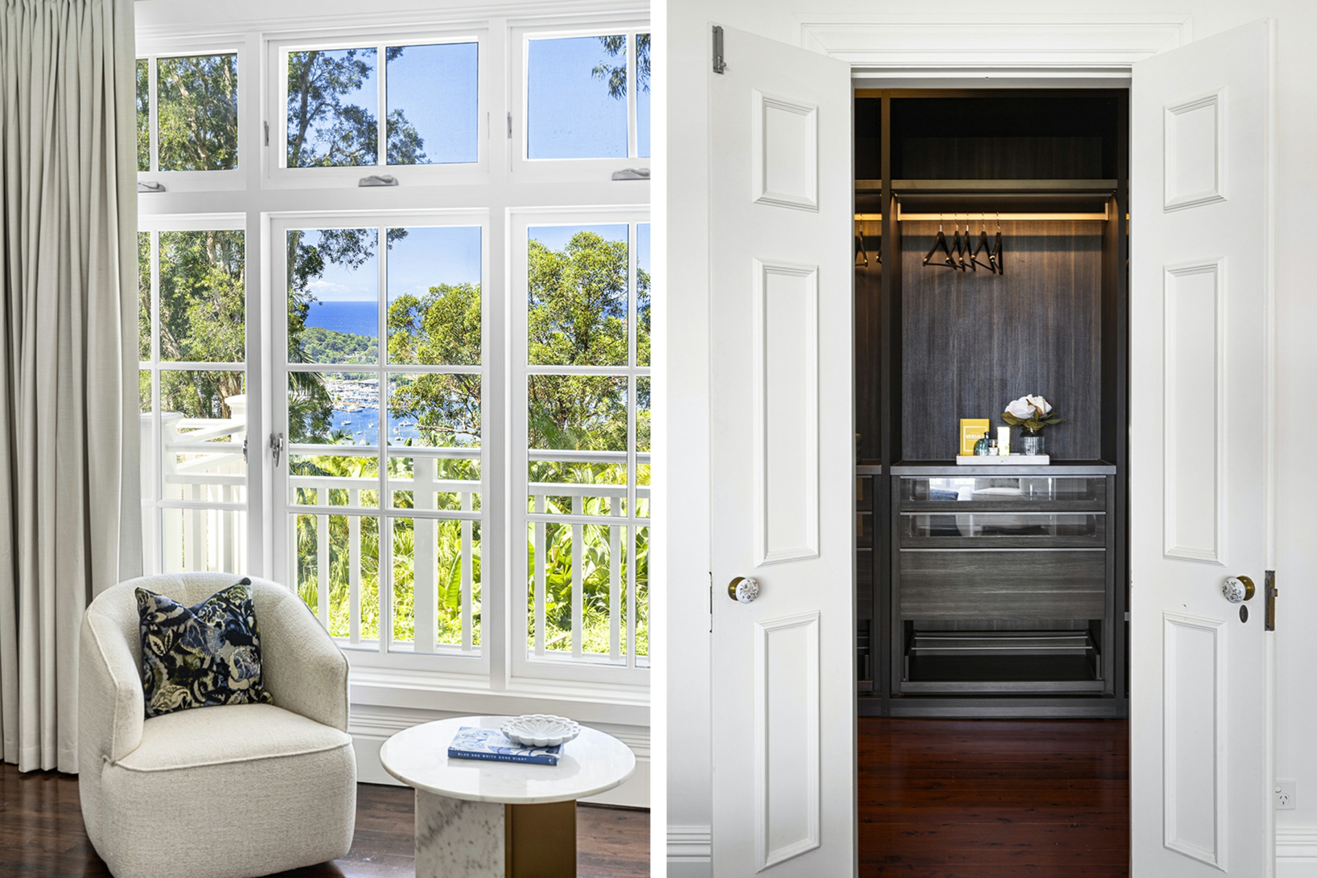 • Timber window pane doors opening toward Pittwater views and the Northerly light on a full length balcony