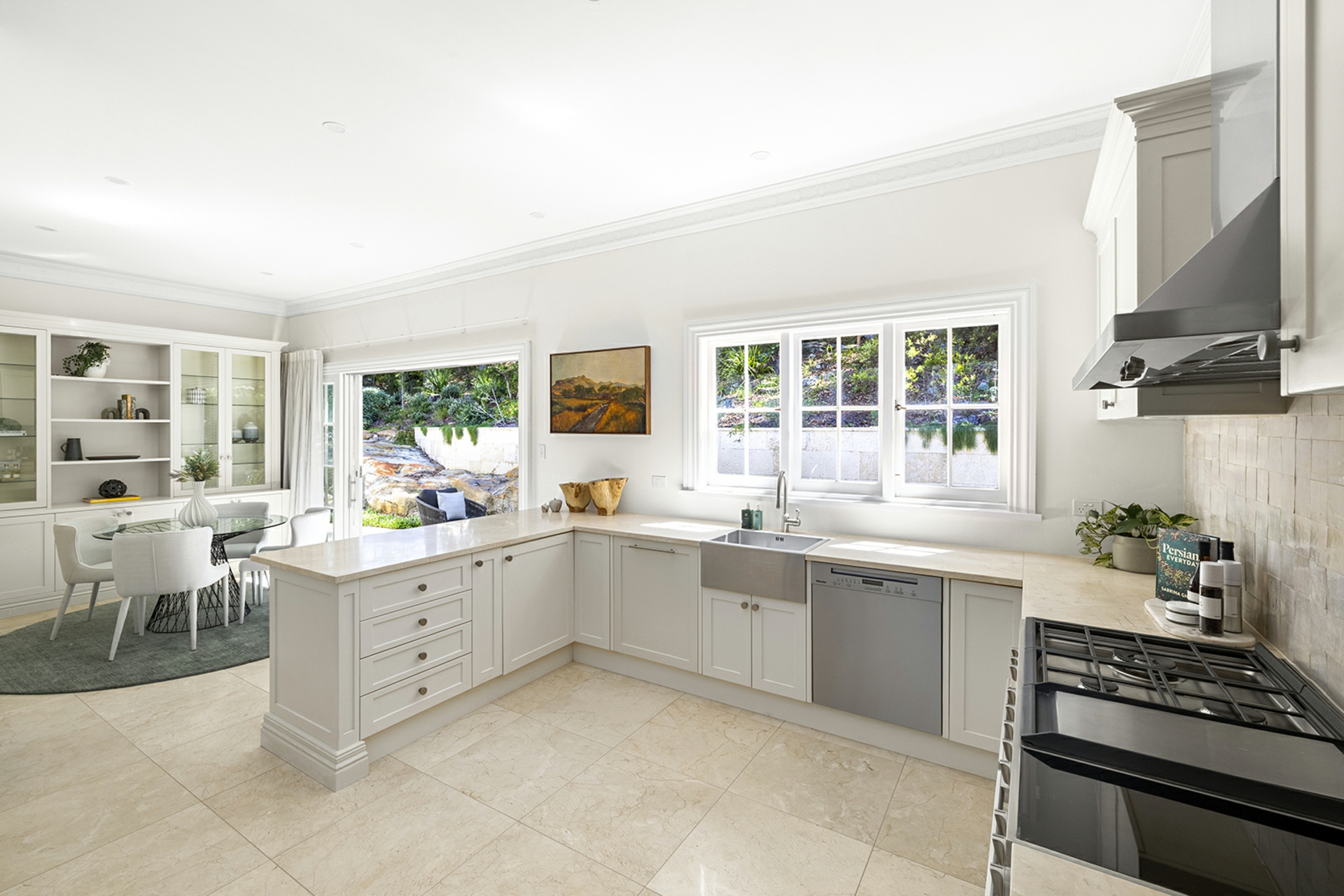 • Shaker style gourmet kitchen with induction and gas cooking combines with causal dining and flows through stacking doors to the limestone clad patio