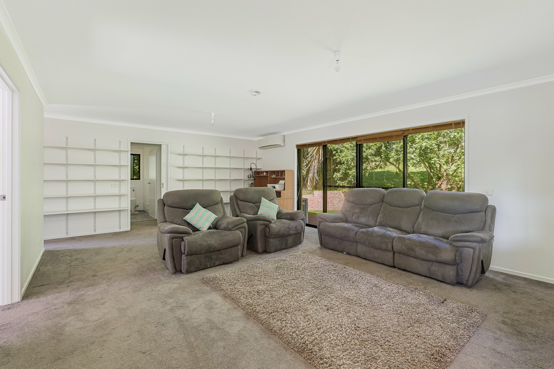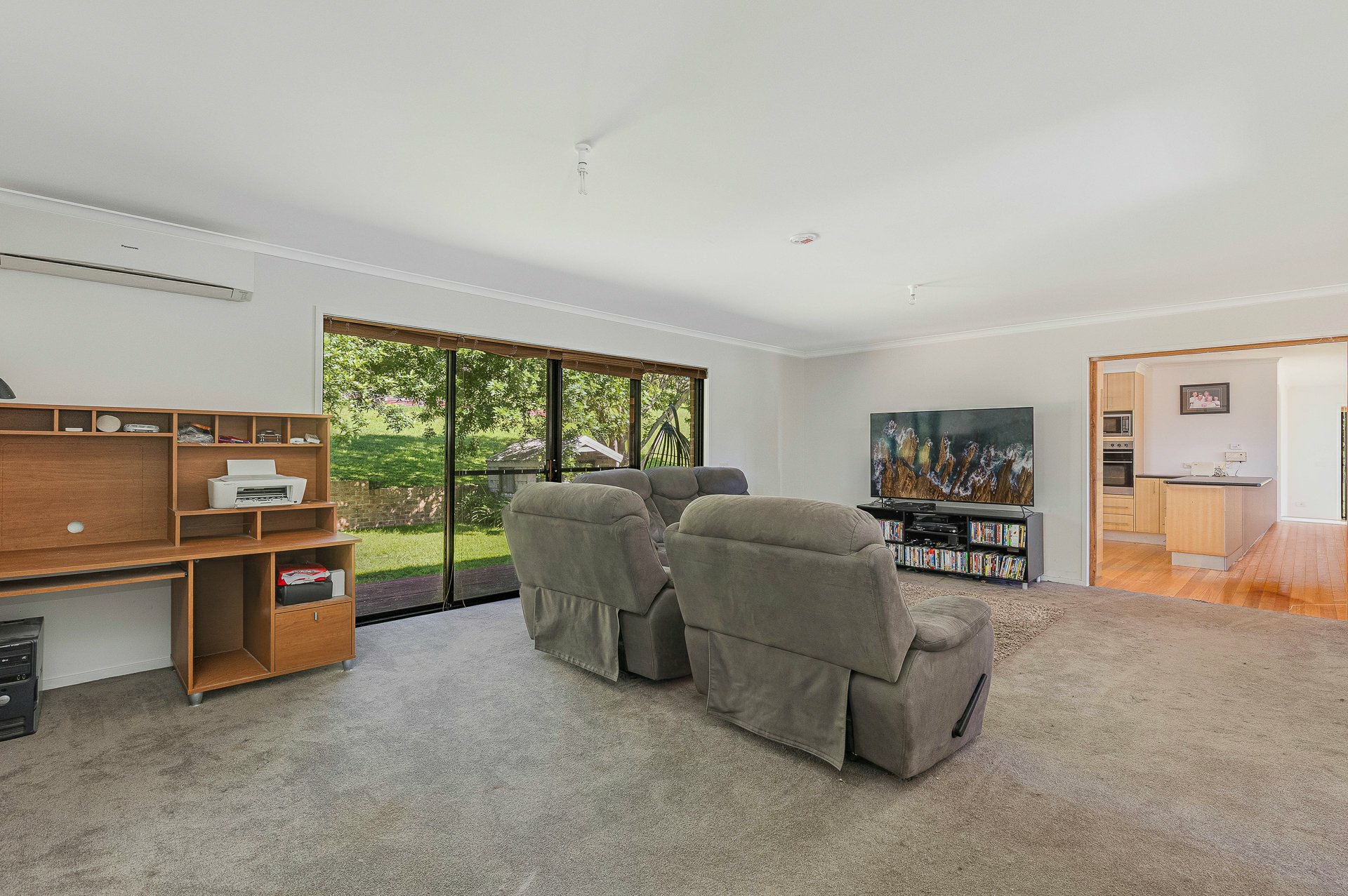Stepping outside, a large deck connected directly to the living area provides an ideal space for outdoor dining, entertaining guests, or simply enjoying the peaceful outlook across the property. Downstairs offers even more versatility with a substantial family room and additional bathroom. With double sliding doors opening to the outside, this area could easily function as a rumpus room, guest retreat, home office, or multi-purpose living space.