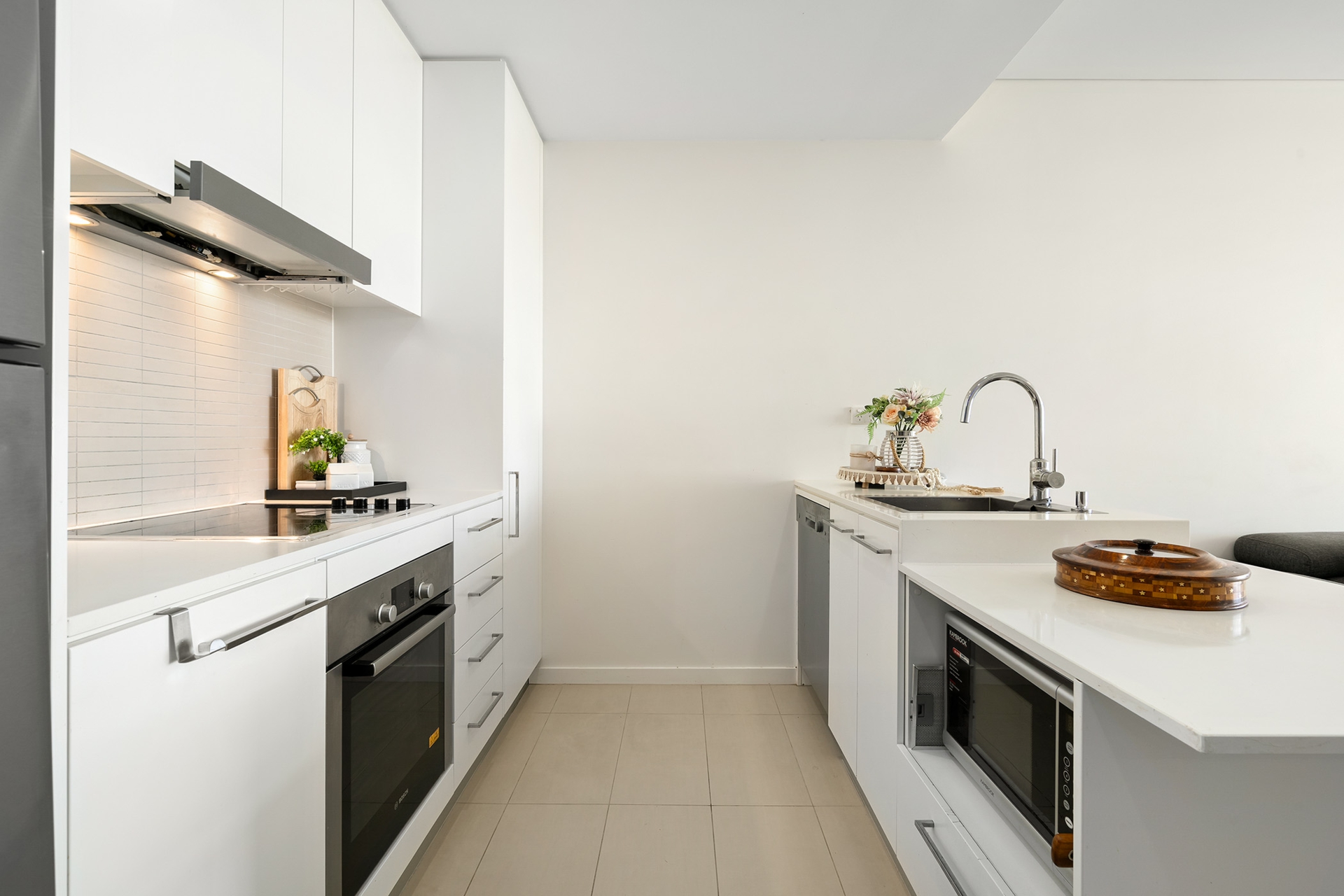 - Kitchen with split-level stone bench tops