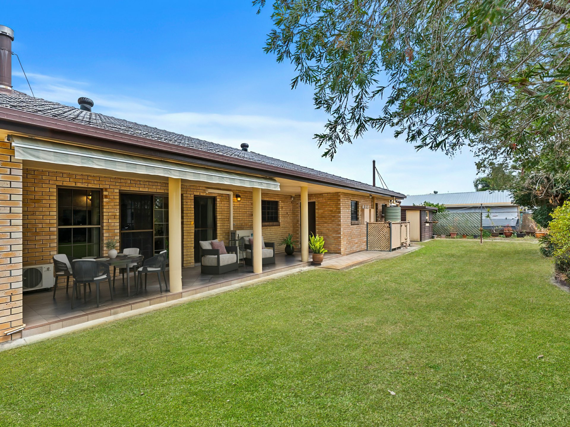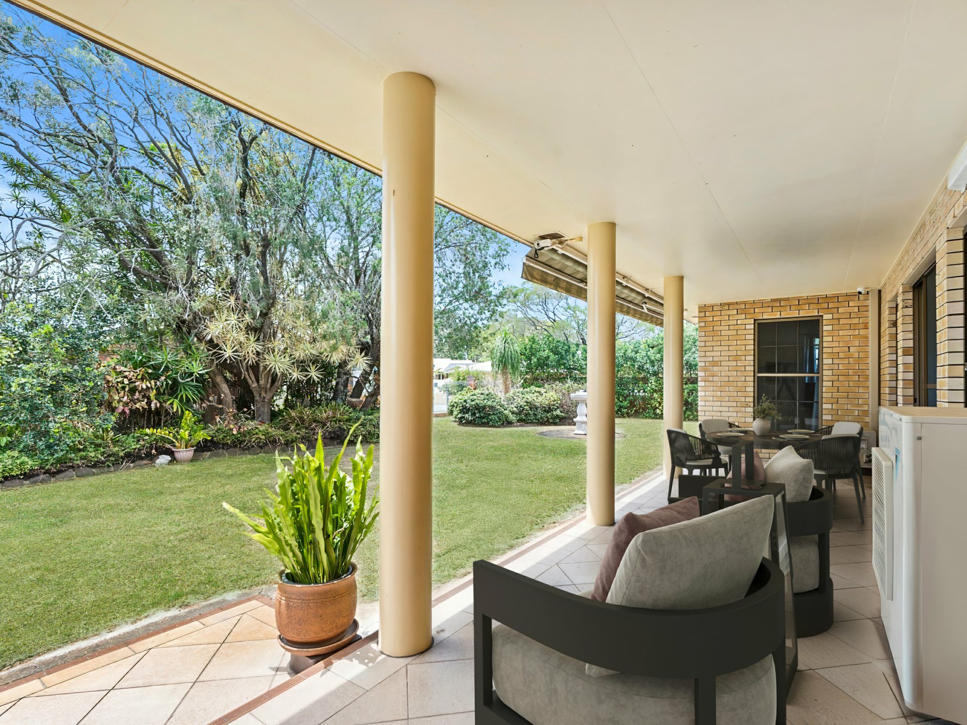 - Covered outdoor entertaining area and welcoming front porch