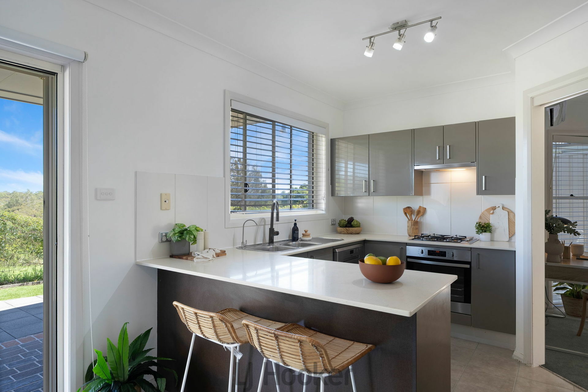 •Modern kitchen with stainless steel appliances, gas cooking, dishwasher and breakfast bar