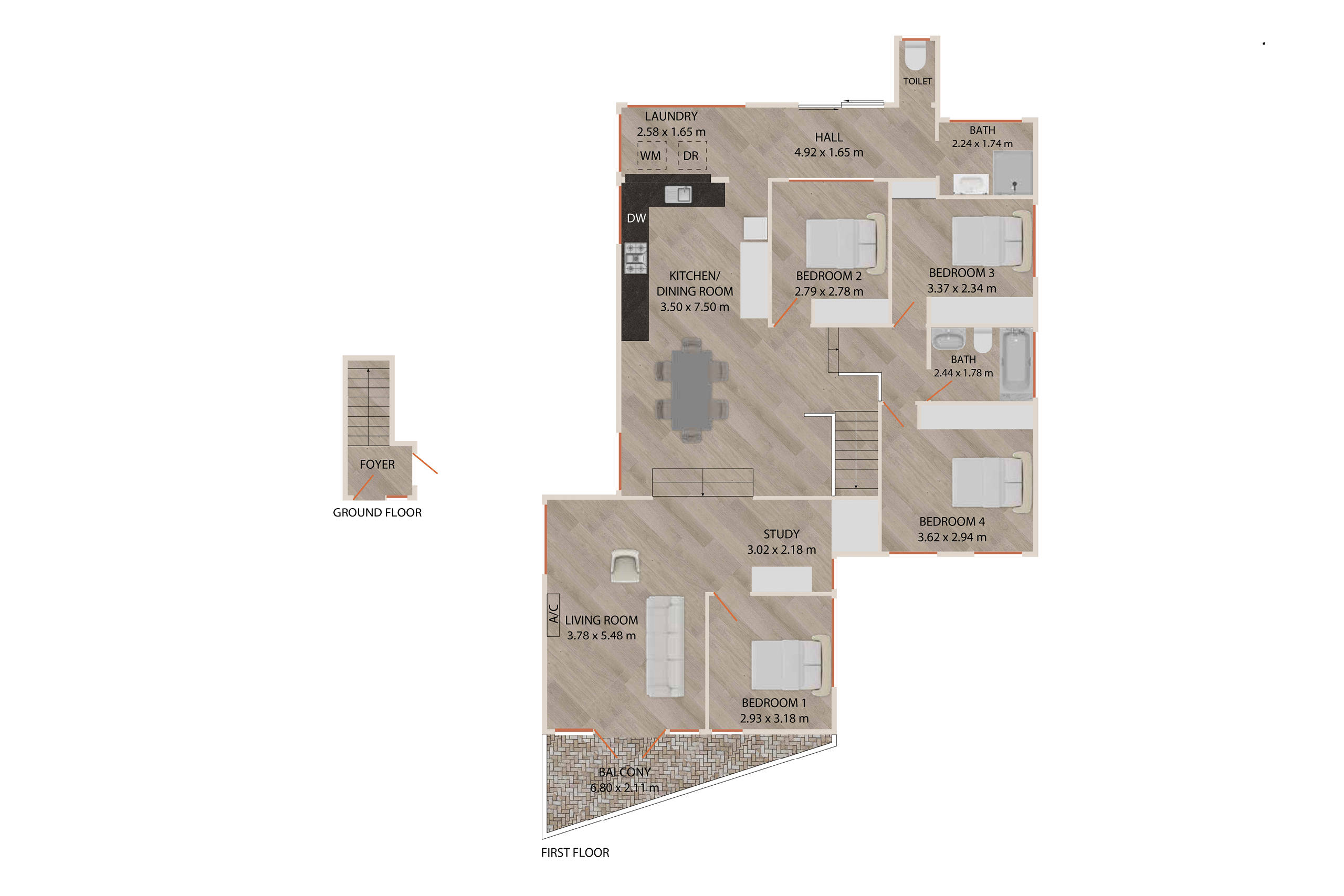 Accommodation is well planned, with 4 bedrooms thoughtfully arranged to provide privacy and flexibility. 3 bedrooms include built-in wardrobes, while the fourth is serviced by its own positioning away from the other rooms, ideal for guests or teenagers. A dedicated study/office space further enhances the layout, catering to modern work-from-home lifestyles without compromising bedroom space.
