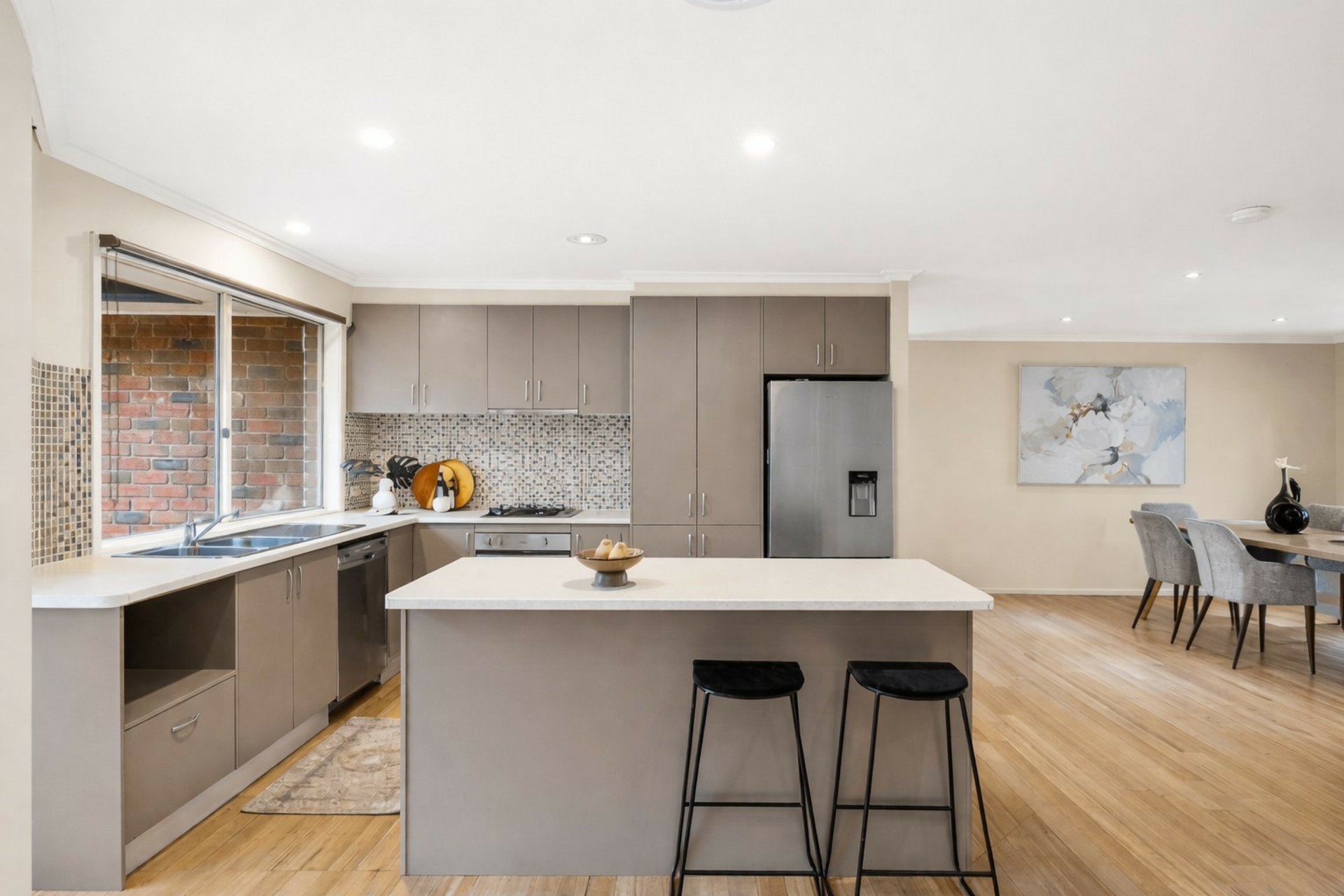 Inside, the home showcases a freshly painted open-plan layout that seamlessly connects the kitchen, dining, and two spacious living zones, creating the perfect environment for both relaxation and entertaining. The well-appointed kitchen features an island bench, gas cooktop, electric oven, dishwasher, and double sink, providing both functionality and style.