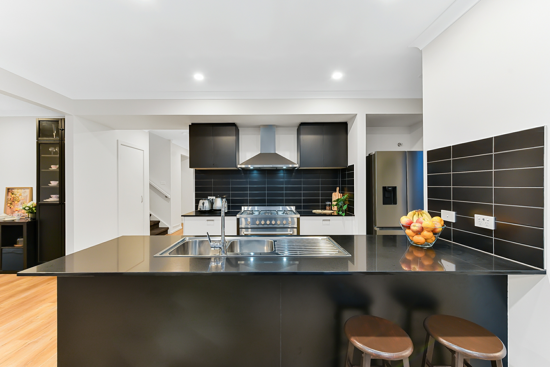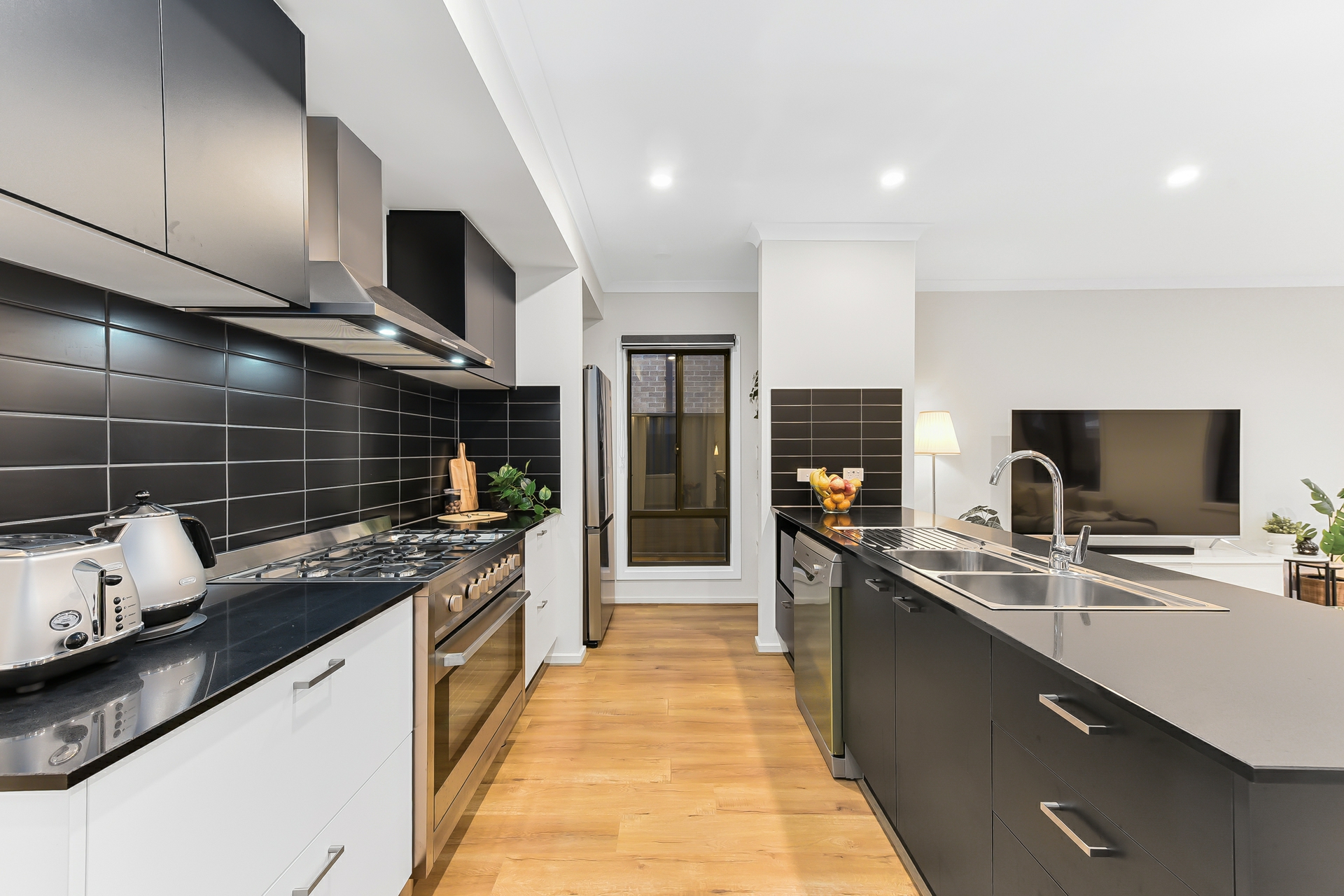 At the heart of the home, the stunning kitchen combines elegance with everyday usability. Featuring sleek stone benchtops, contrasting cabinetry, and a premium 900mm dual-fuel oven, it's a space that will delight any home chef.