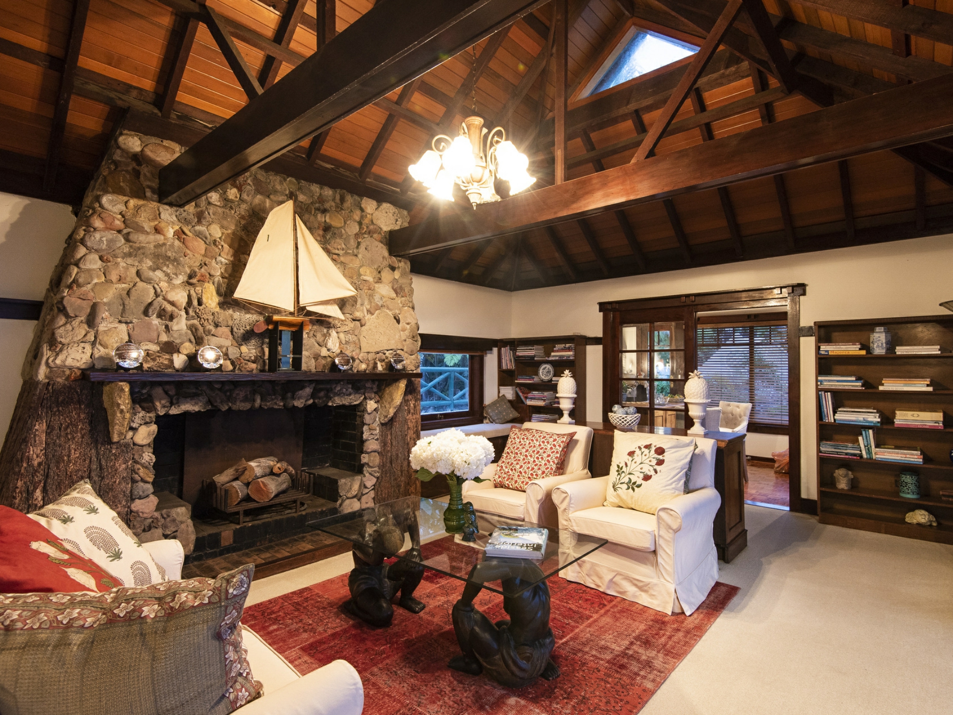 - Enormous stone fireplace anchors free-flowing living and dining spaces
