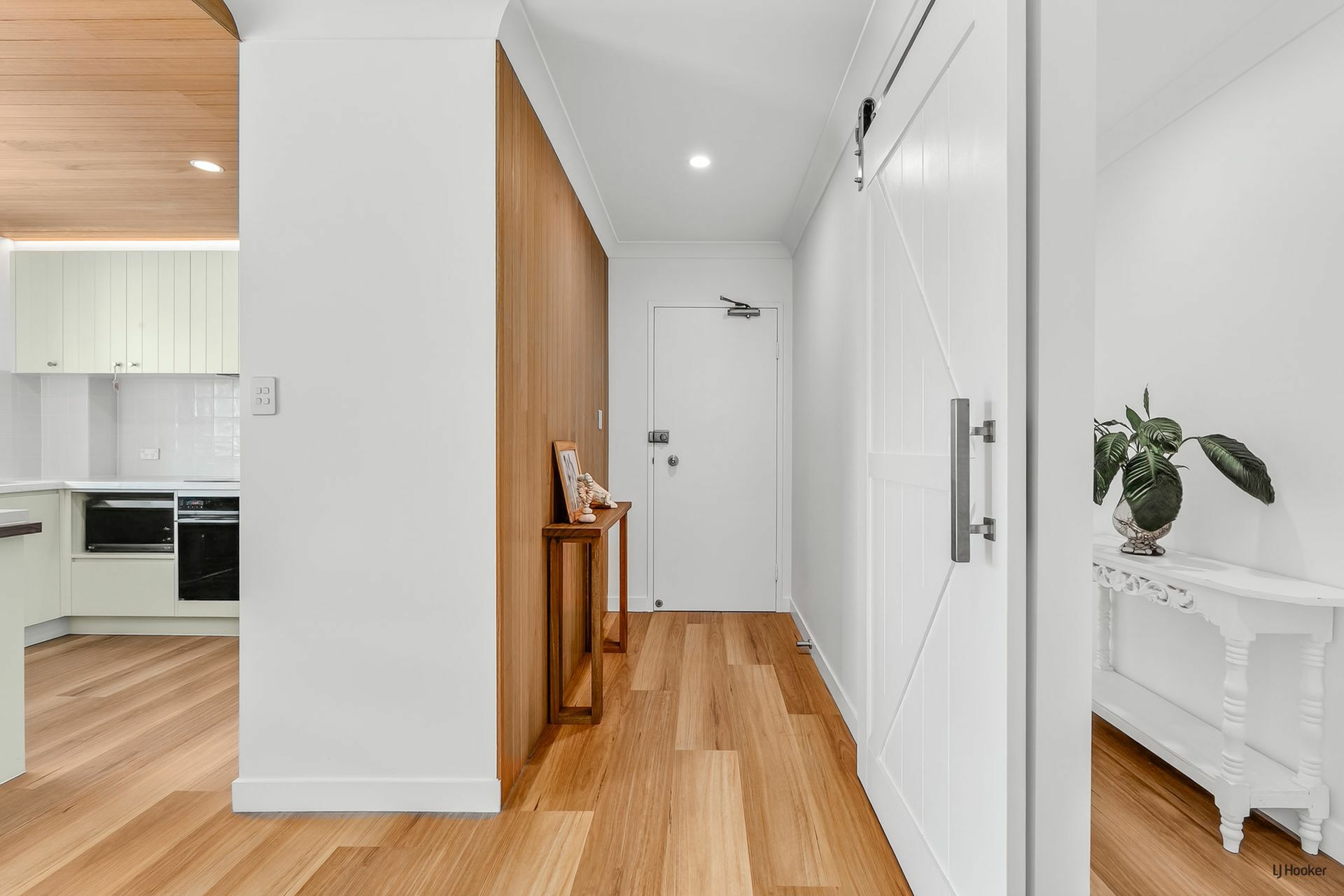 The designer kitchen is a statement in both form and function, featuring bespoke panelled cabinetry, stone benchtops, handmade-look tiled splashback, integrated appliances and a custom blackbutt hardwood dining extension - ideal for entertaining or everyday indulgence.