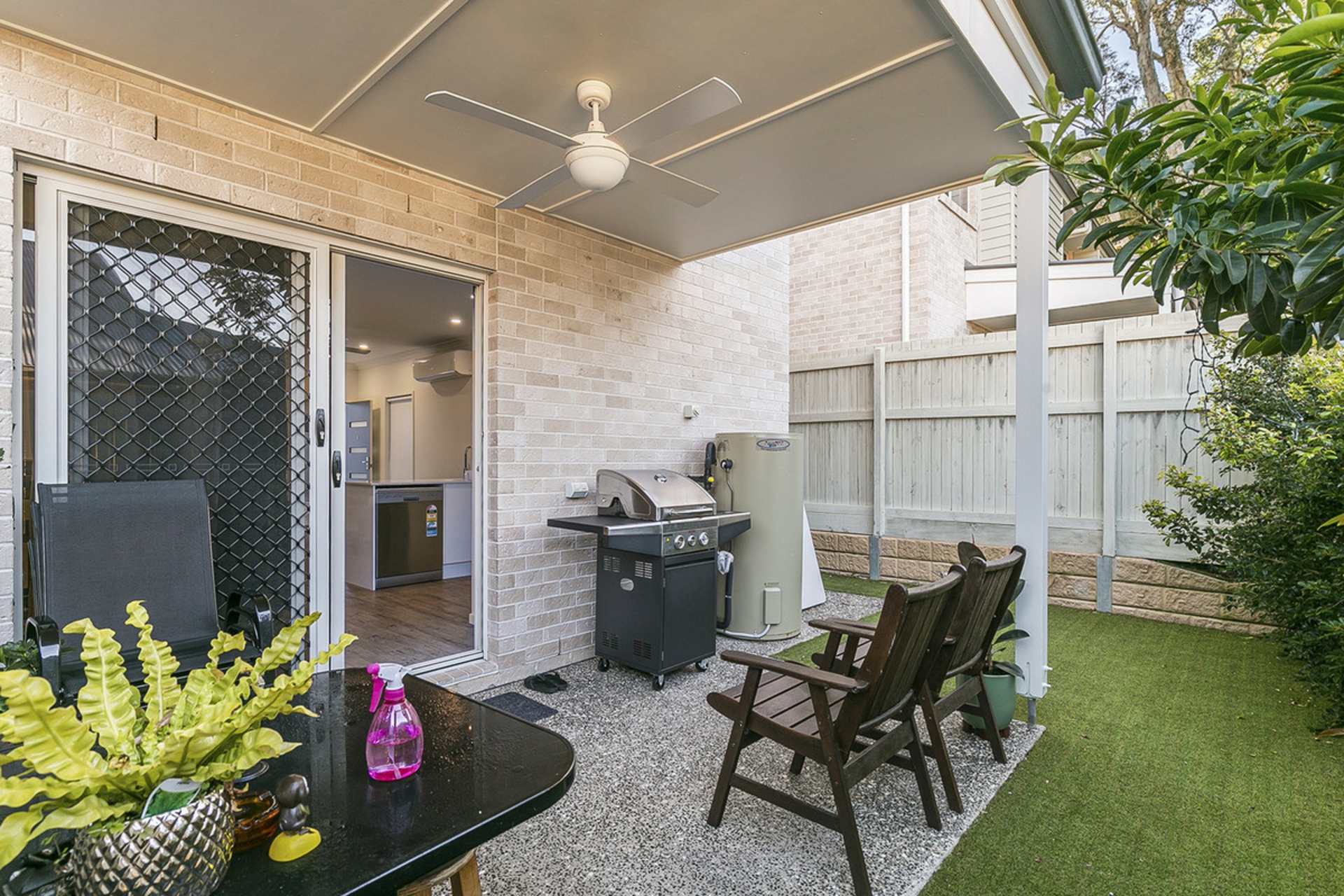 Private, low-maintenance courtyard with artificial grass and a covered patio � ideal for entertaining friends and family. There is even a third loo with powder room on the ground level.