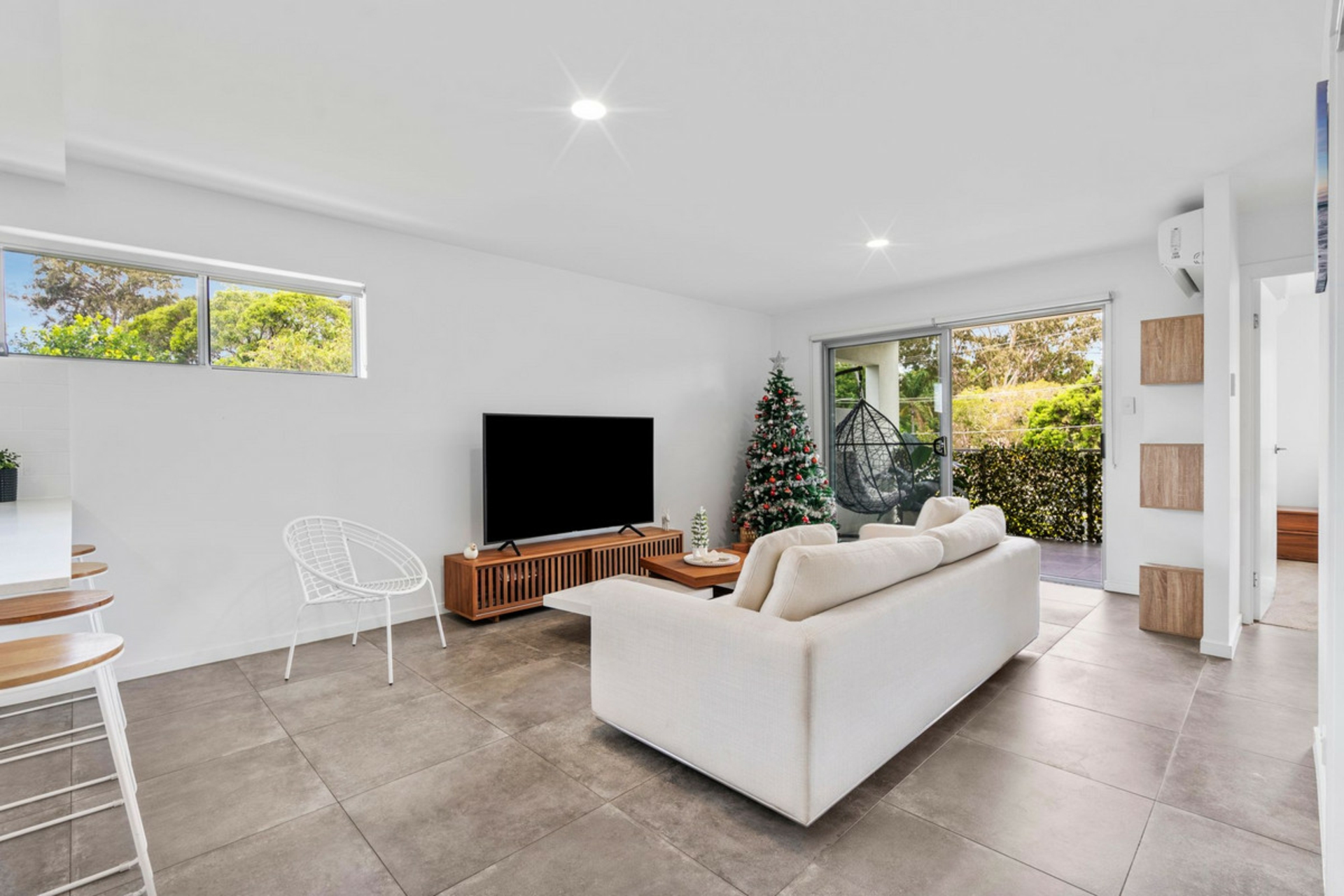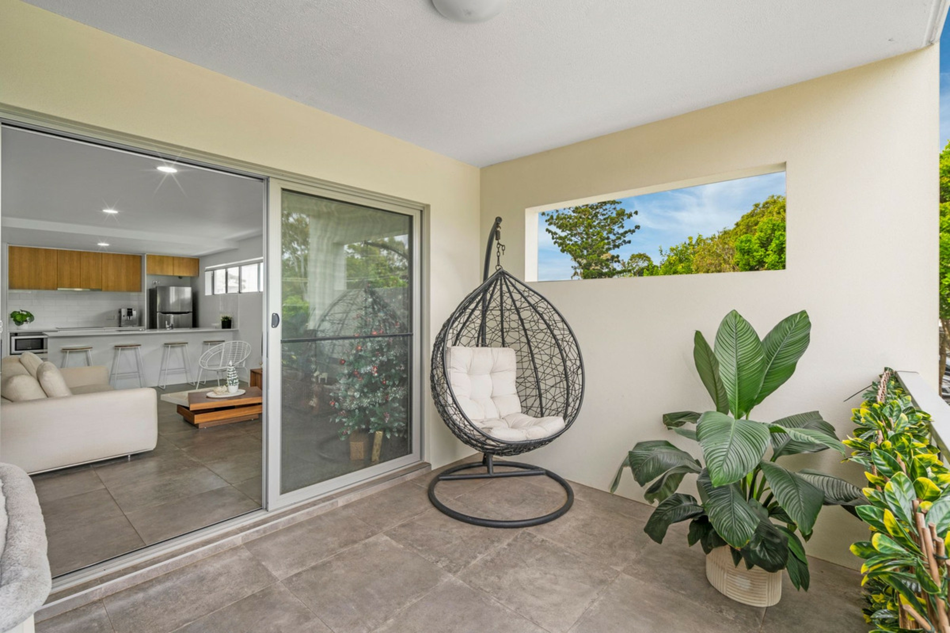 The light-filled open-plan living and dining area flows effortlessly onto a large, south-facing alfresco space. Overlooking beautifully landscaped gardens, this covered outdoor area is ideal for entertaining, enjoying summer breezes, or simply unwinding after a long day.