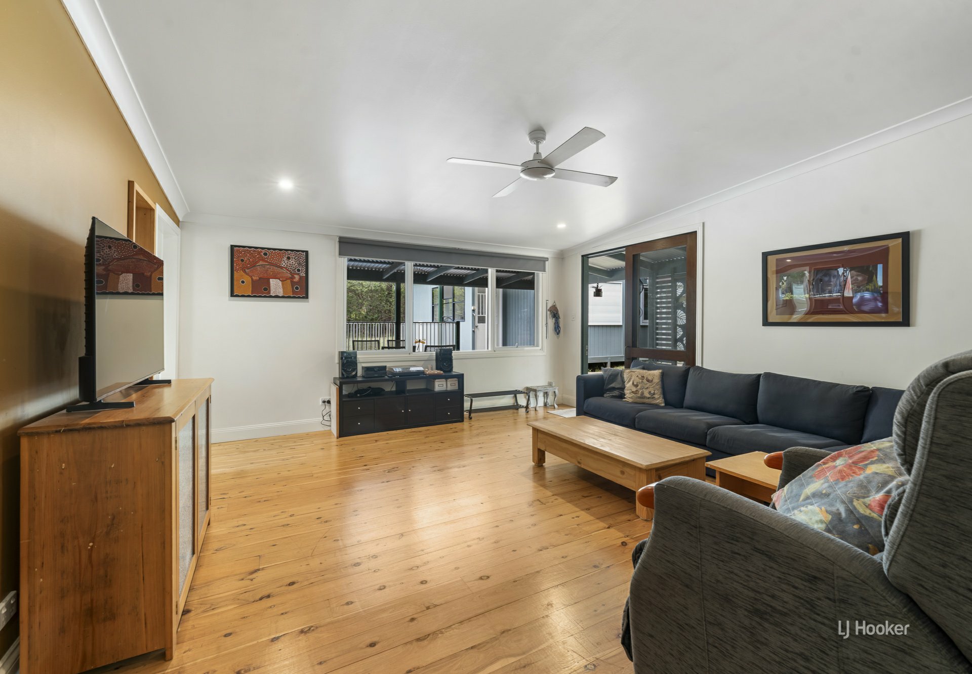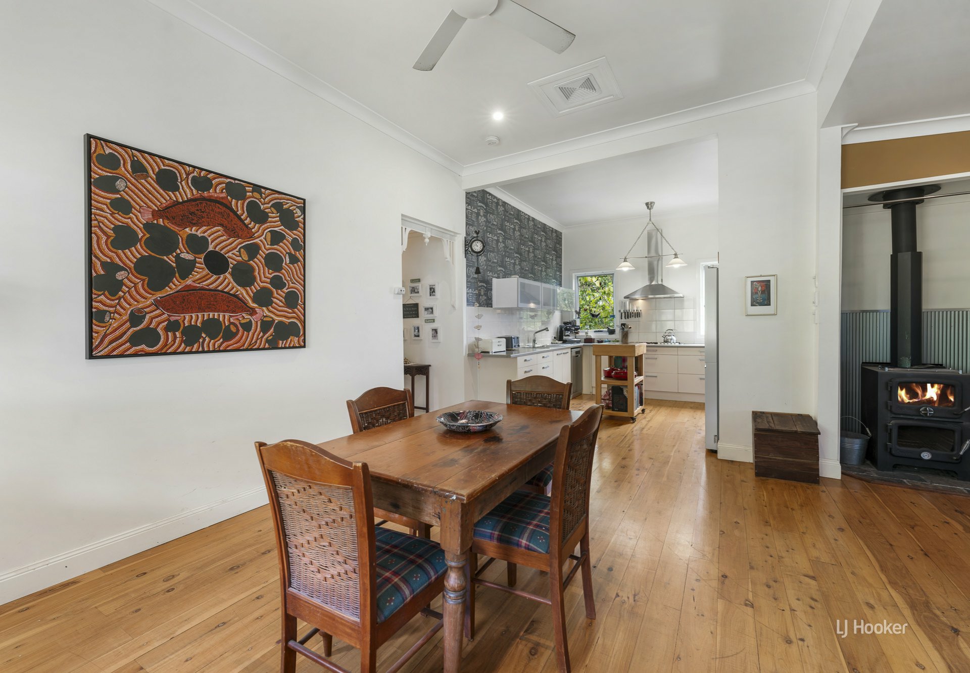 The main residence features a light filled open plan kitchen, dining and lounge, enhanced by polished timber floors throughout. Climate comfort is assured year round with air conditioning, ceiling fans, and a charming wood burning fireplace for cooler months.