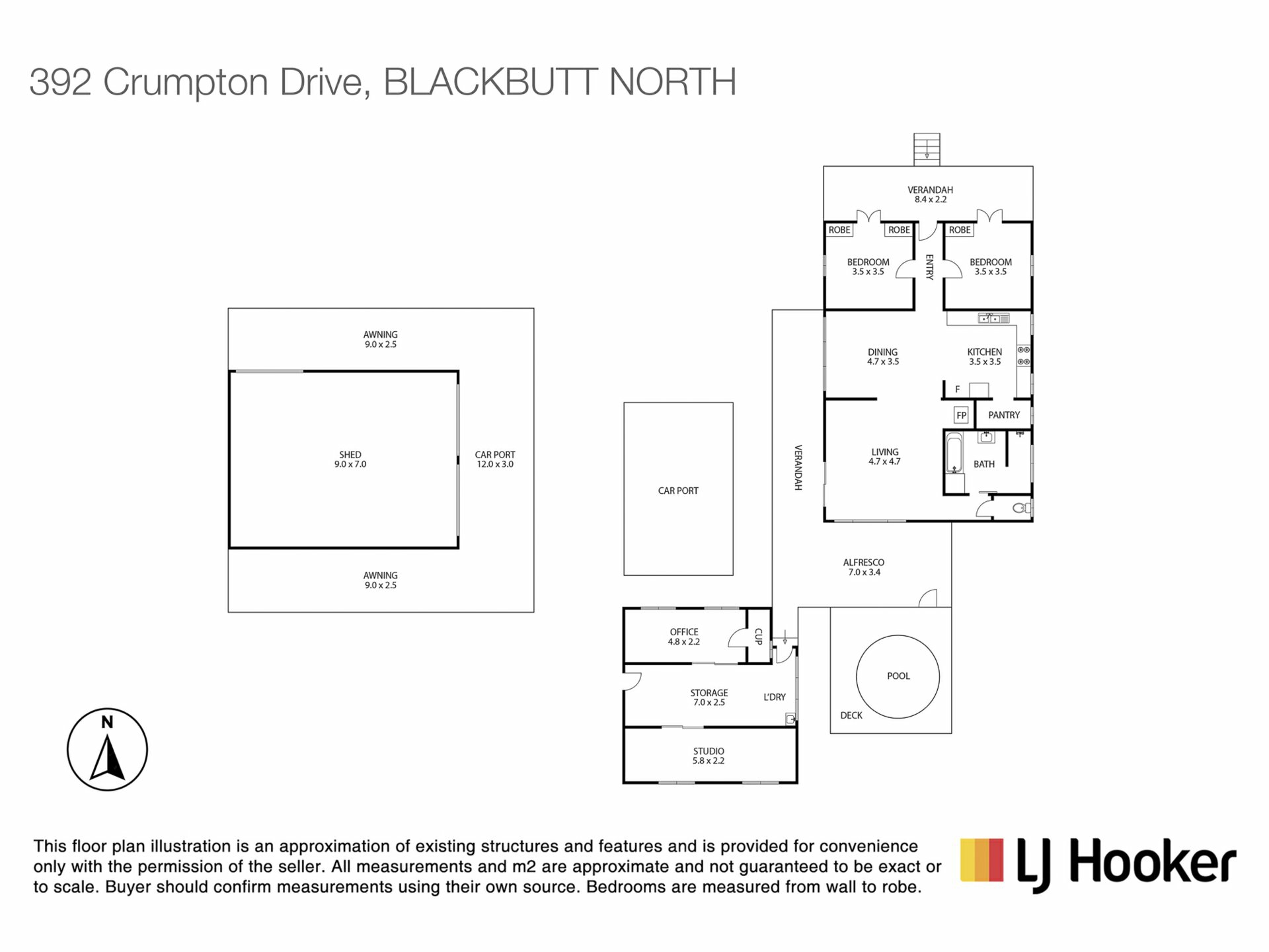 Infrastructure is well catered for with a substantial 9m x 7m three bay shed, featuring three roller doors for convenient front and side access. The shed is complemented by 9m x 2.5m awnings on both sides and a 12m x 3m front carport, plus an additional single carport near the home for easy daily access.