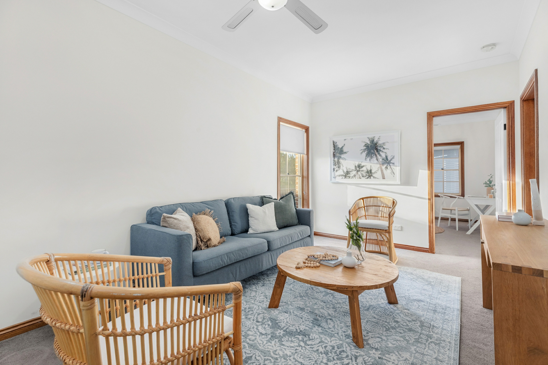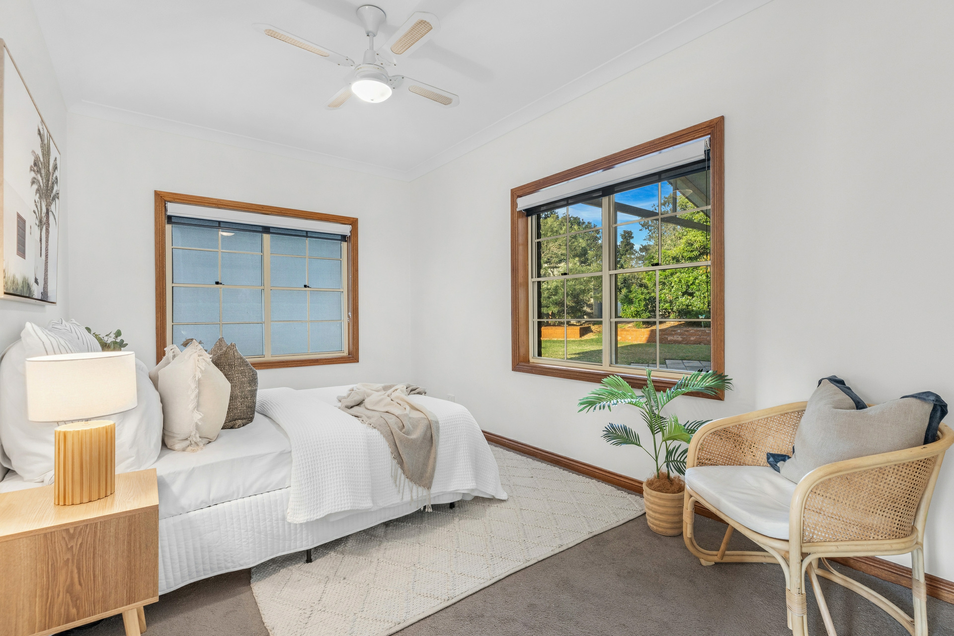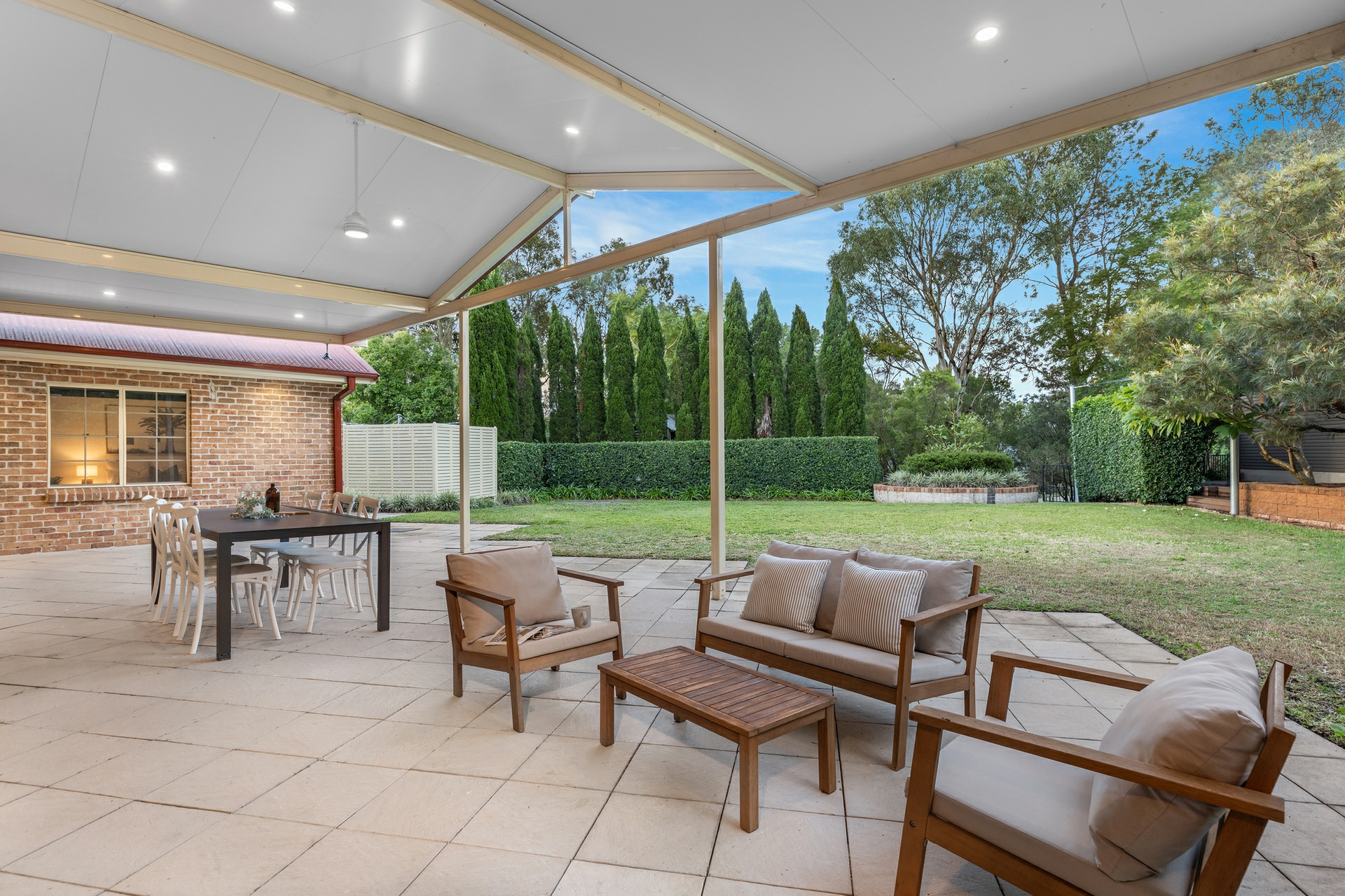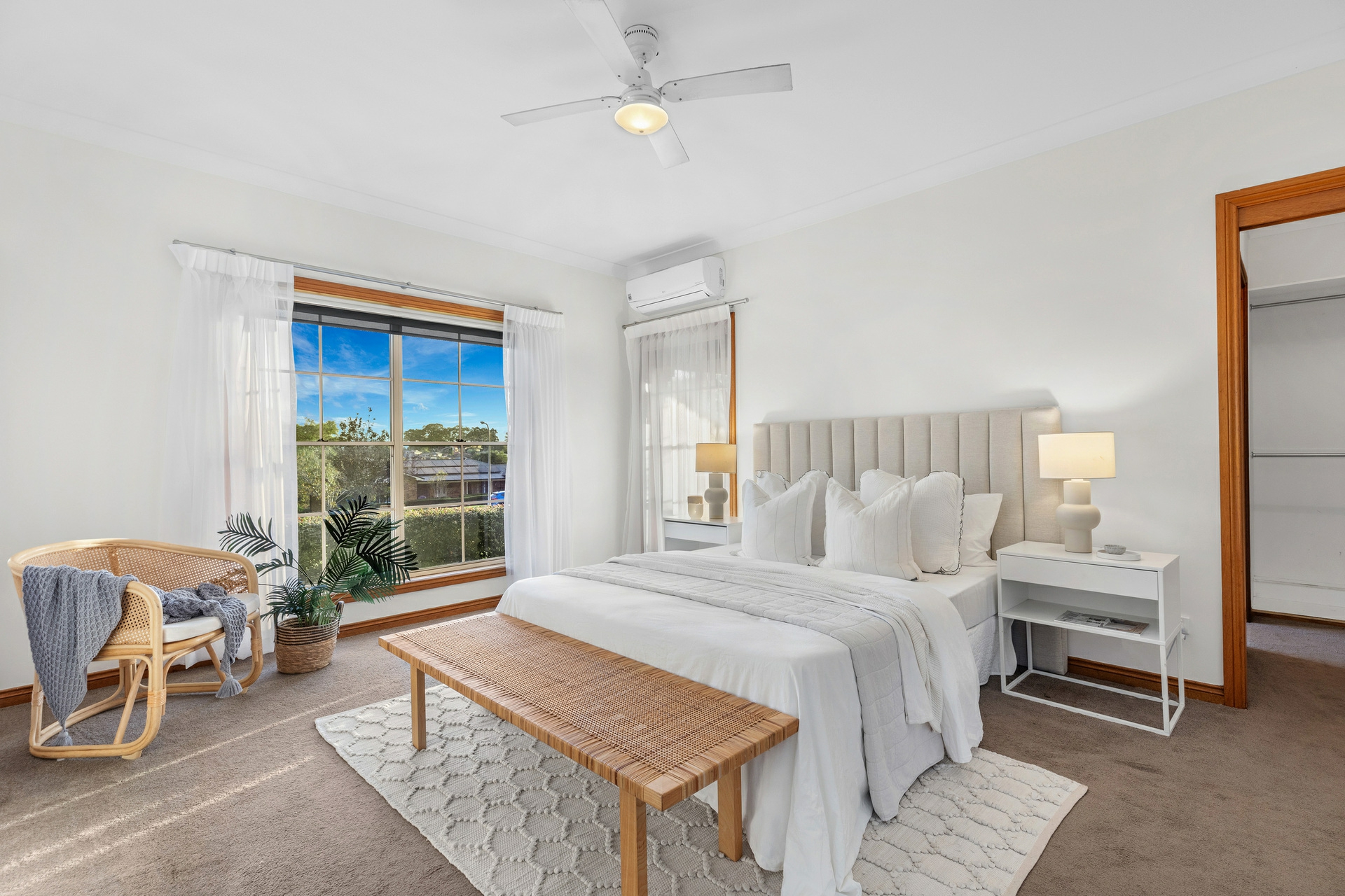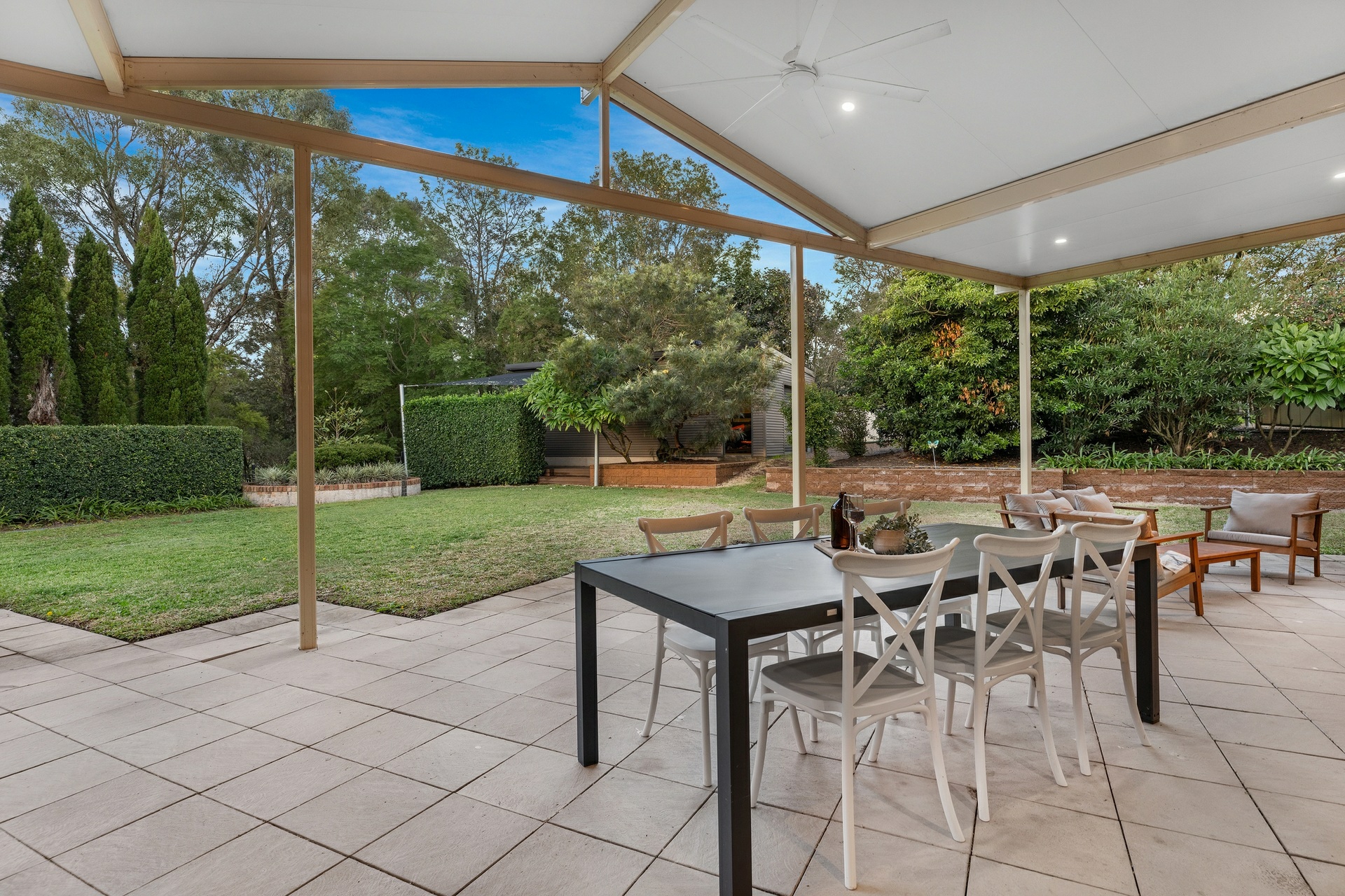 Back inside, the sleeping arrangements are all well-sized with the master bedroom a great retreat, with a walk-in robe and a ensuite. Each of the remaining bedrooms includes built-in robes, ceiling fans, and plush carpeting for added comfort. The renovated main bathroom features a deep soak bath, separate shower, and his and hers vanities.