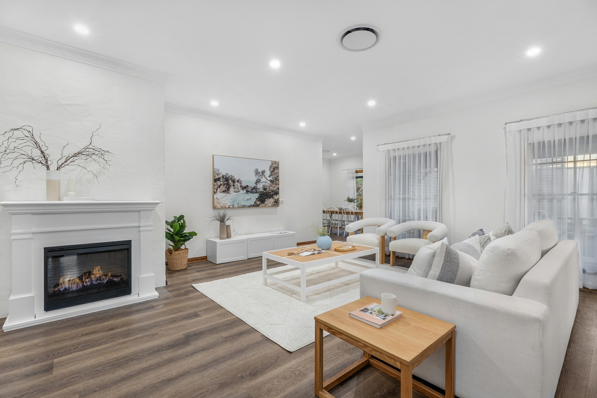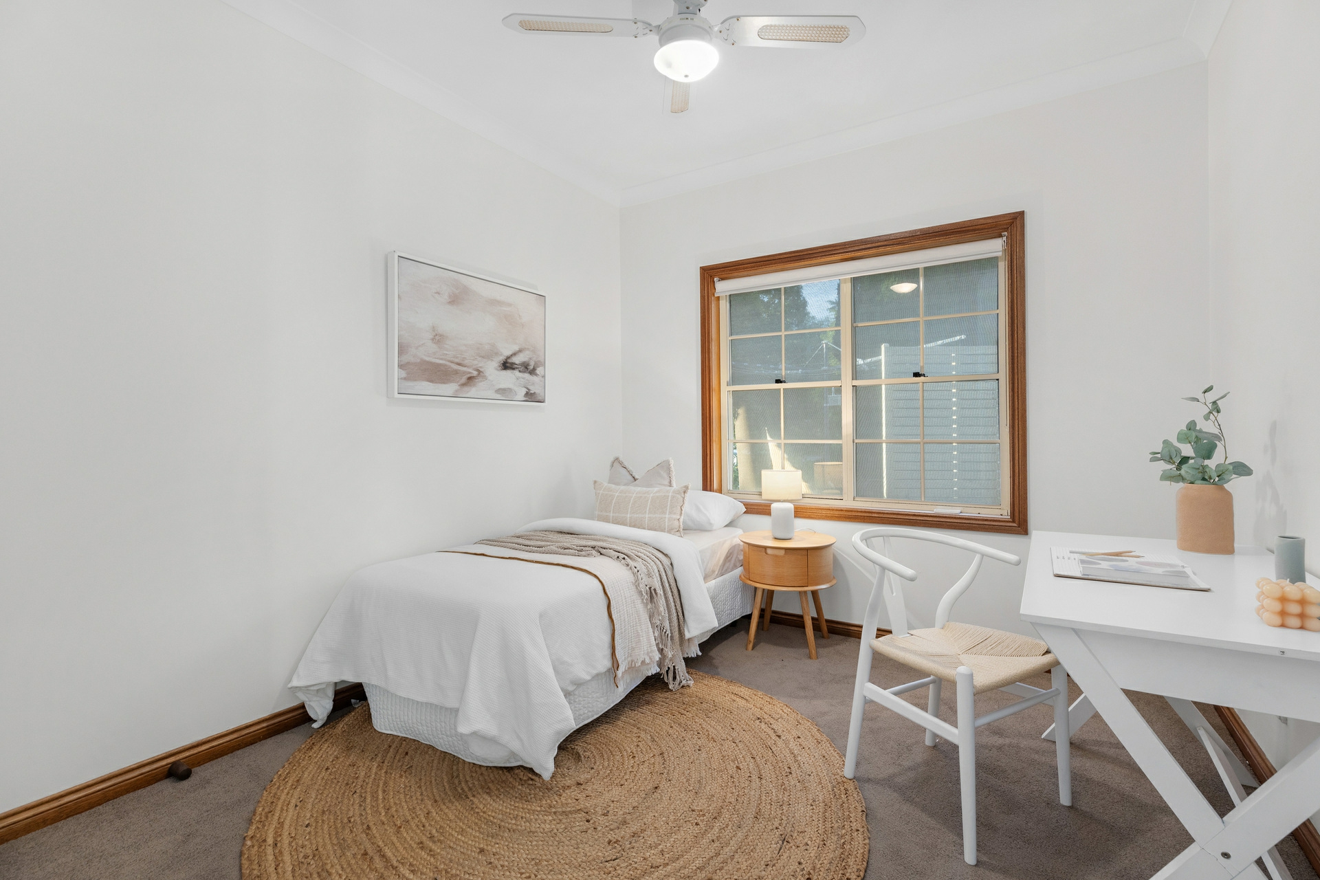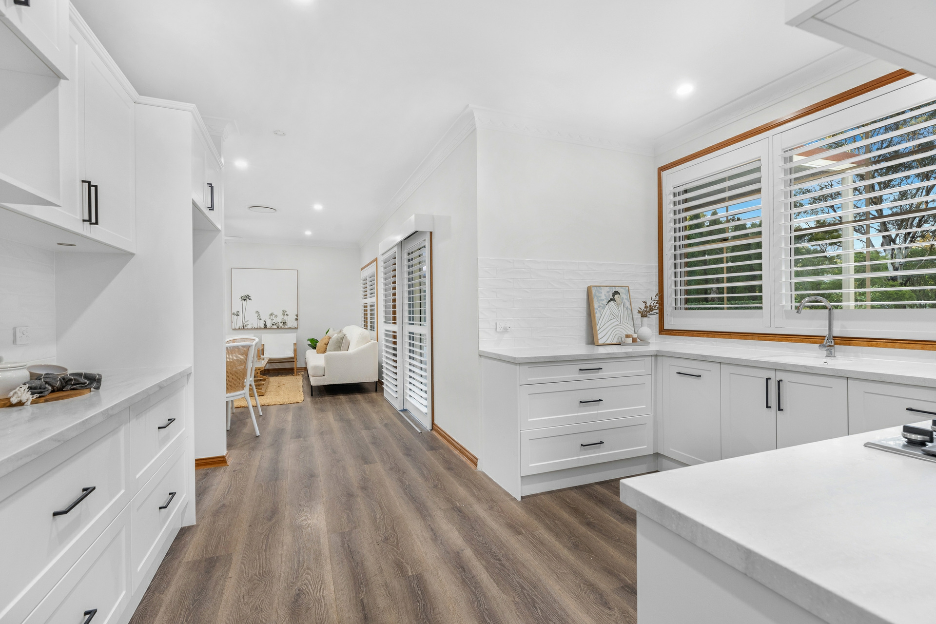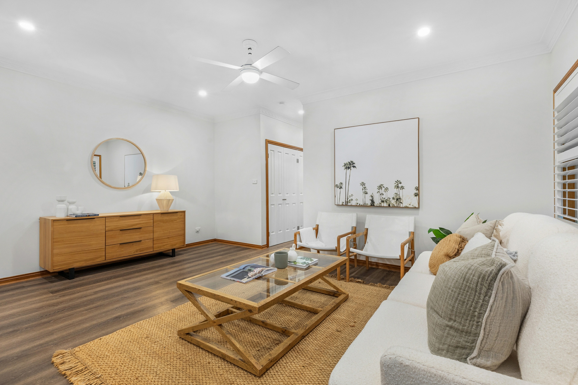 Back inside, the sleeping arrangements are all well-sized with the master bedroom a great retreat, with a walk-in robe and a ensuite. Each of the remaining bedrooms includes built-in robes, ceiling fans, and plush carpeting for added comfort. The renovated main bathroom features a deep soak bath, separate shower, and his and hers vanities.