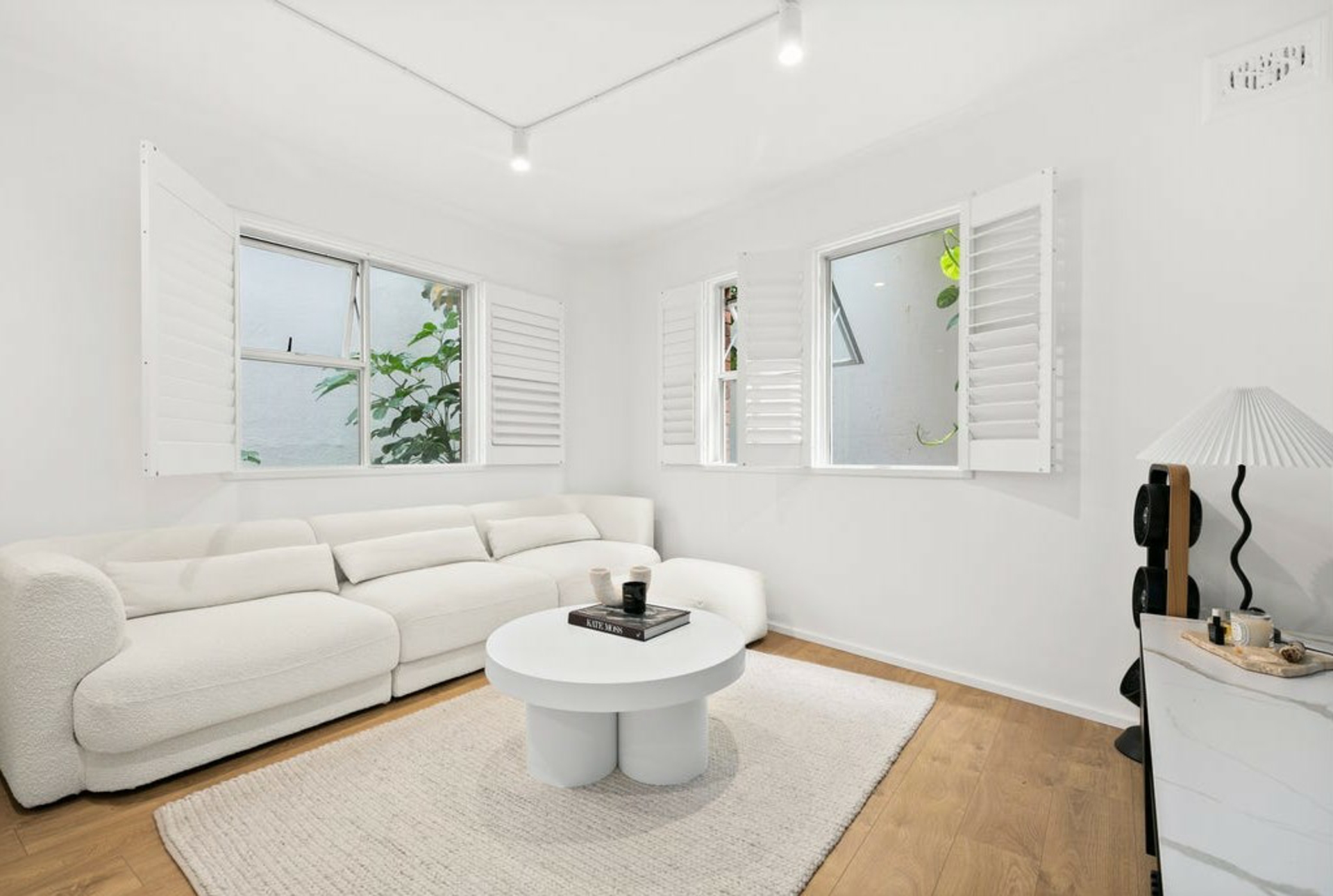 - Bright living area with plantation shutters