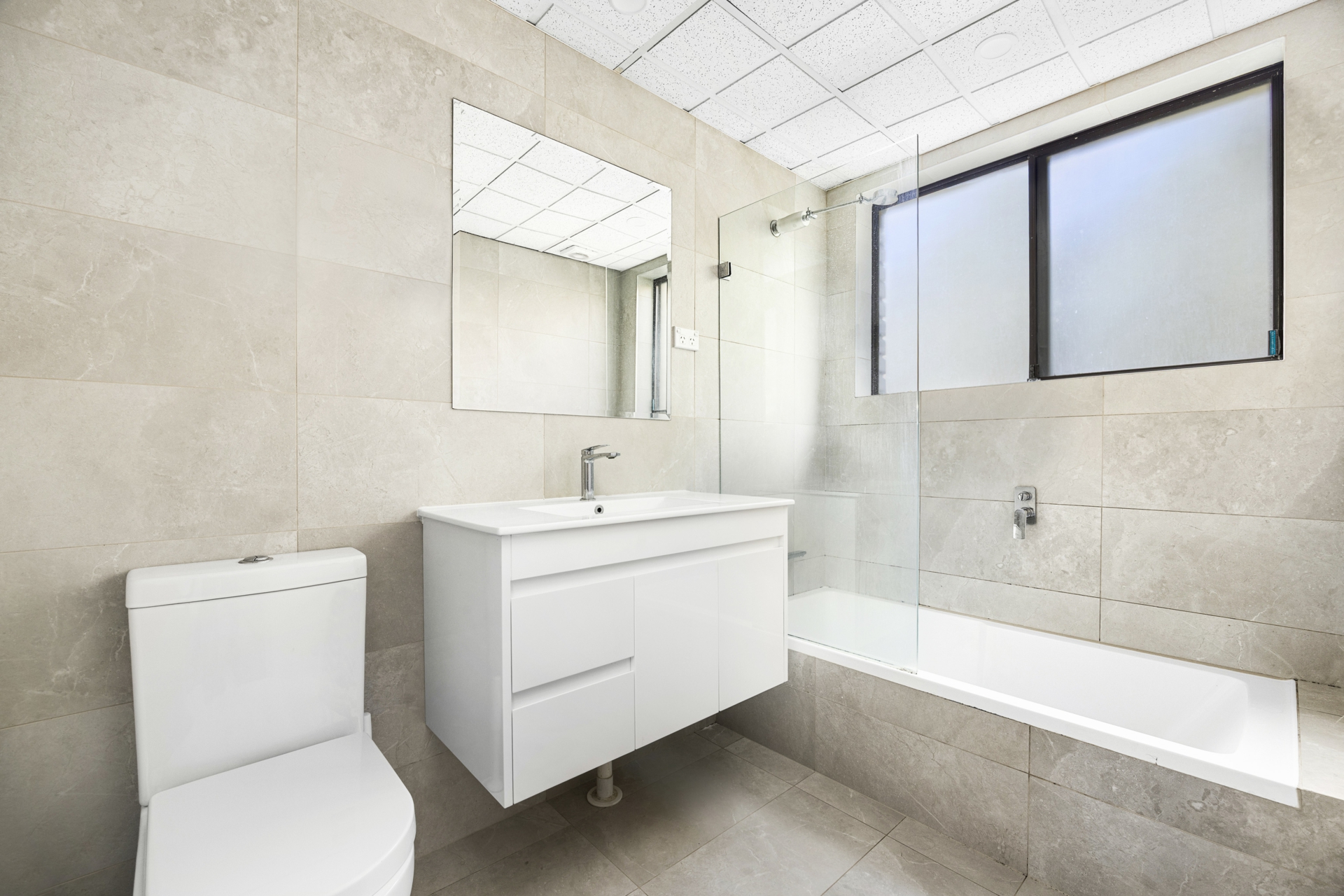- Renovated bathroom with full-sized bathtub