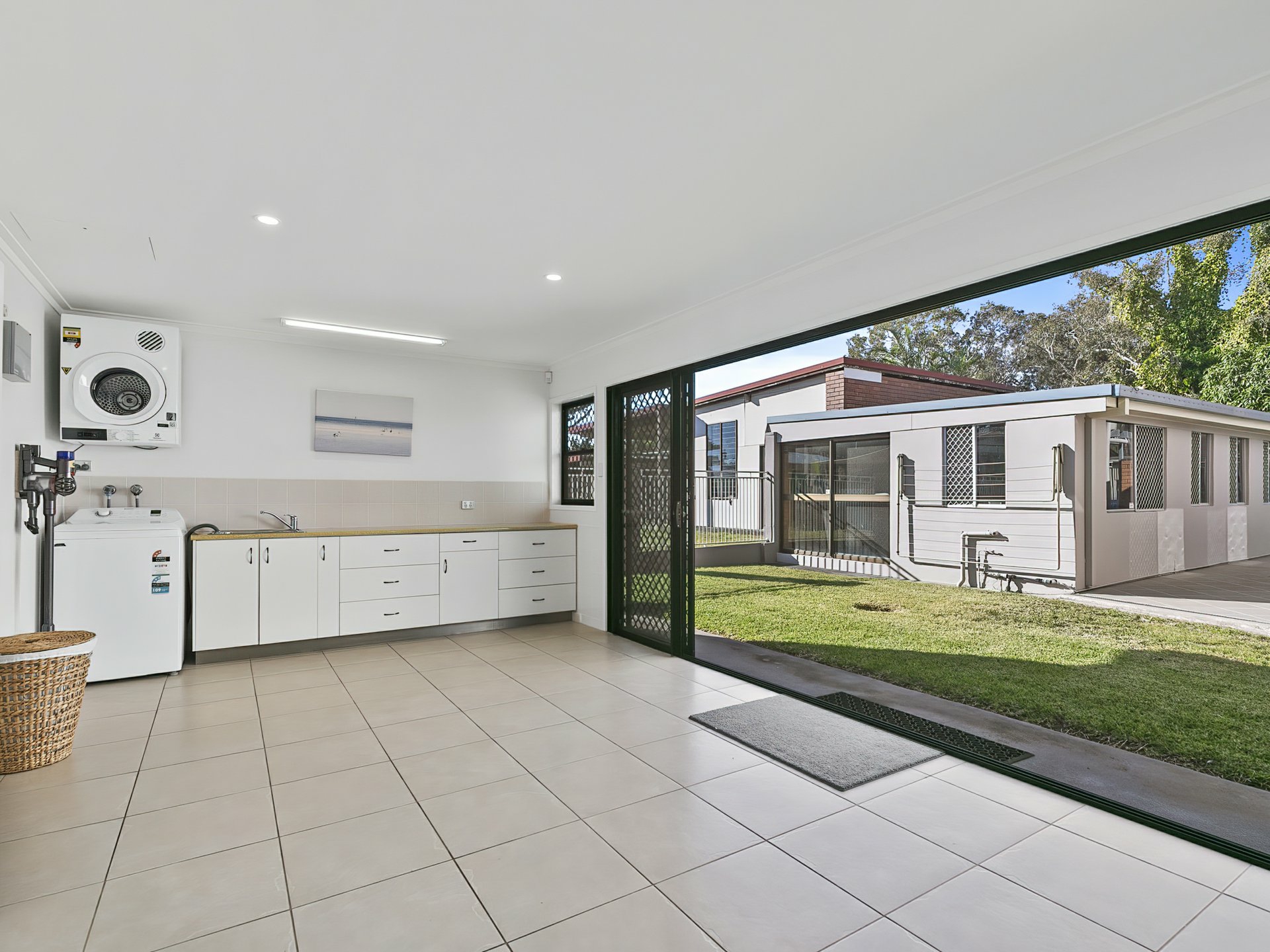 • Large laundry area with full length built-in cupboards.