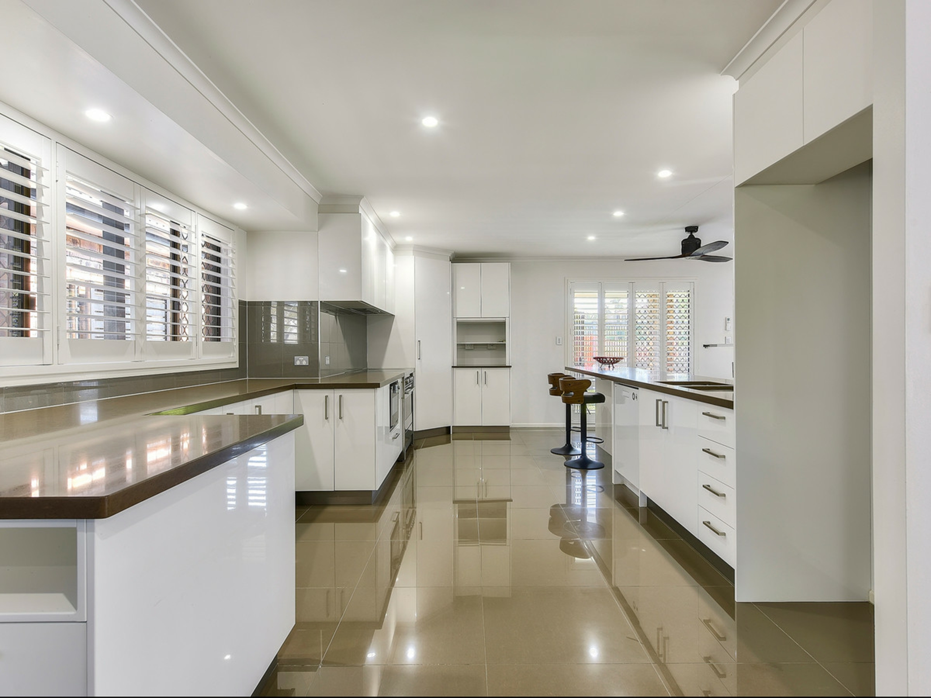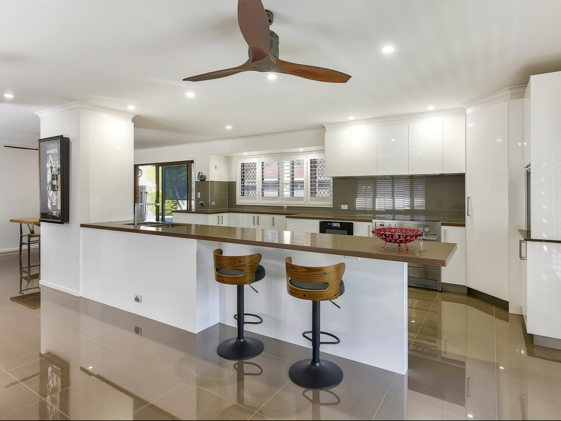 As you step inside, you're welcomed by a spacious foyer that leads to the heart of the home-the open-plan kitchen, living, and dining area. The kitchen is a showstopper, featuring expansive Caesar-stone counter tops, abundant storage, stainless steel appliances, and sleek 2-pack cabinetry. Toward the rear of the home, you'll find a generous laundry with direct access to the alfresco space, as well as a convenient powder room. The home's three bedrooms are well-appointed, two with built-ins and ceiling fans, while the primary bedroom, located at the back of the home, serves as a private retreat. It features ceiling fans, an expansive walk-in robe, and a serene view of the backyard.