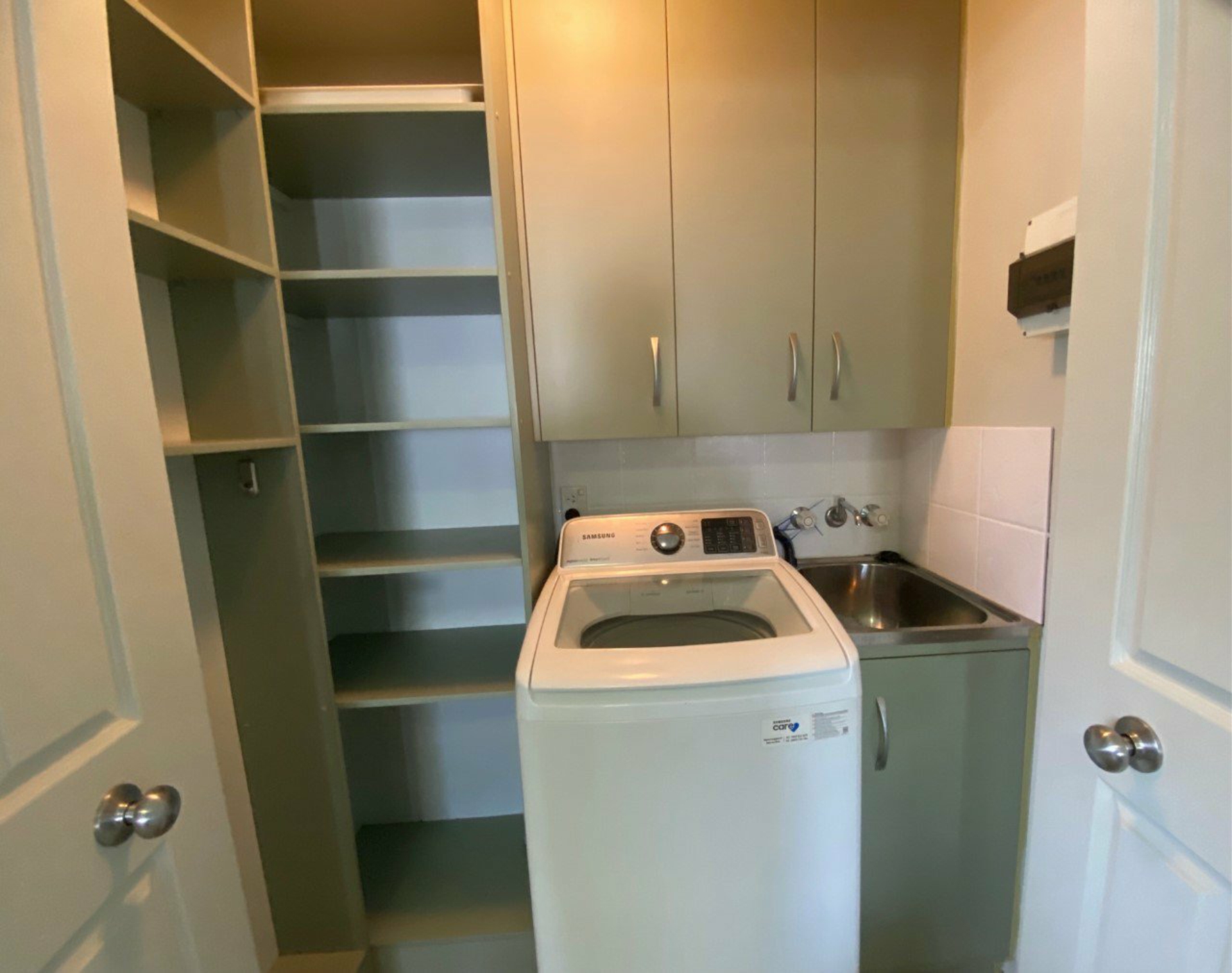 - European laundry cleverly hidden behind bi-fold doors in the living room
