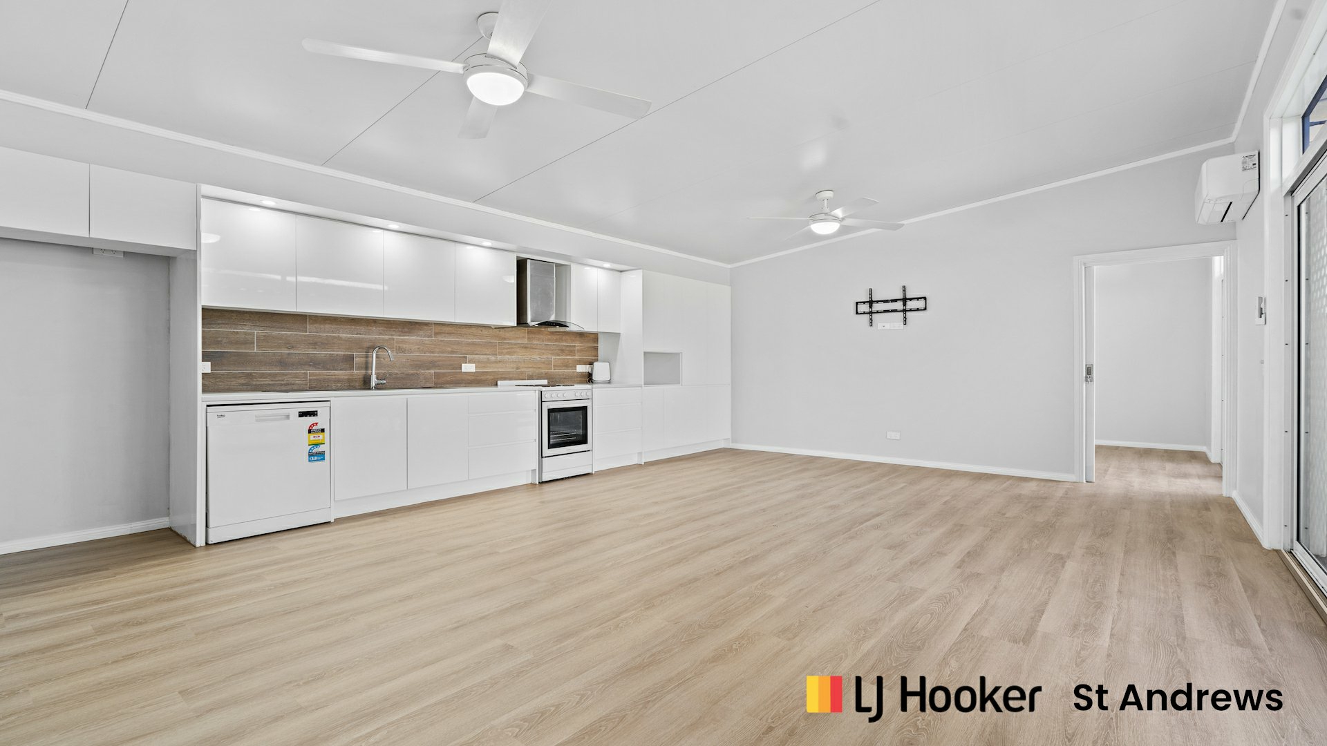 - The open plan living and dining area flows effortlessly with a modern kitchen featuring a cooktop over oven design and dishwasher. Raked ceilings add architectural charm and enhance the sense of light and space, while fresh paint and brand new flooring throughout ensure a contemporary finish. All this whilst the split system air conditioner enables a comfortable environment all year round