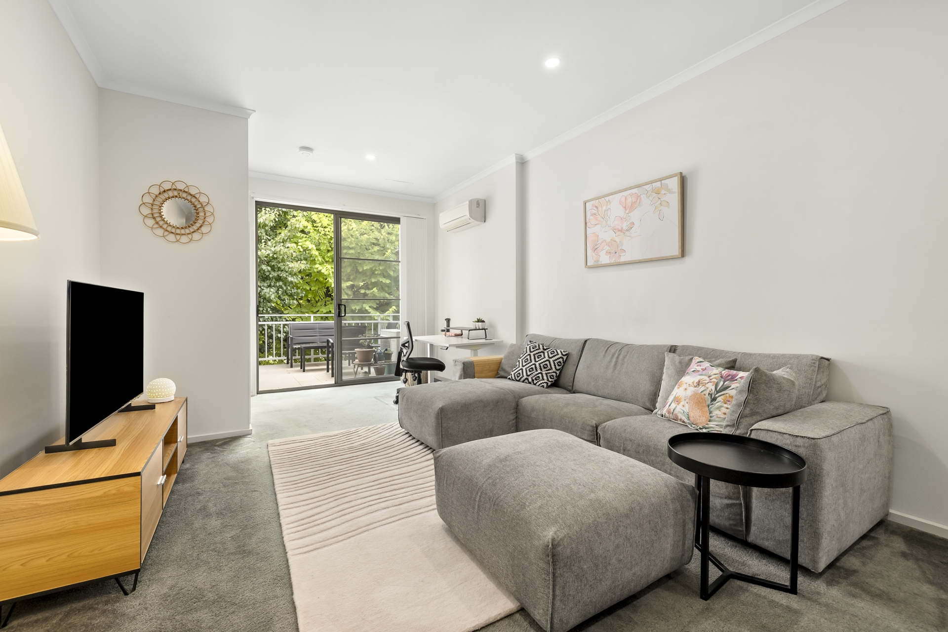 The kitchen is open plan, and features ample bench and storage space. It looks out towards the light-filled lounge and balcony. The large deciduous tree to the rear provides perfect cover, colour and shade during the summer, whilst allowing light to pour through in winter. The bedroom also takes advantage of this, and also features a walk-through robe for extra storage and convenience.