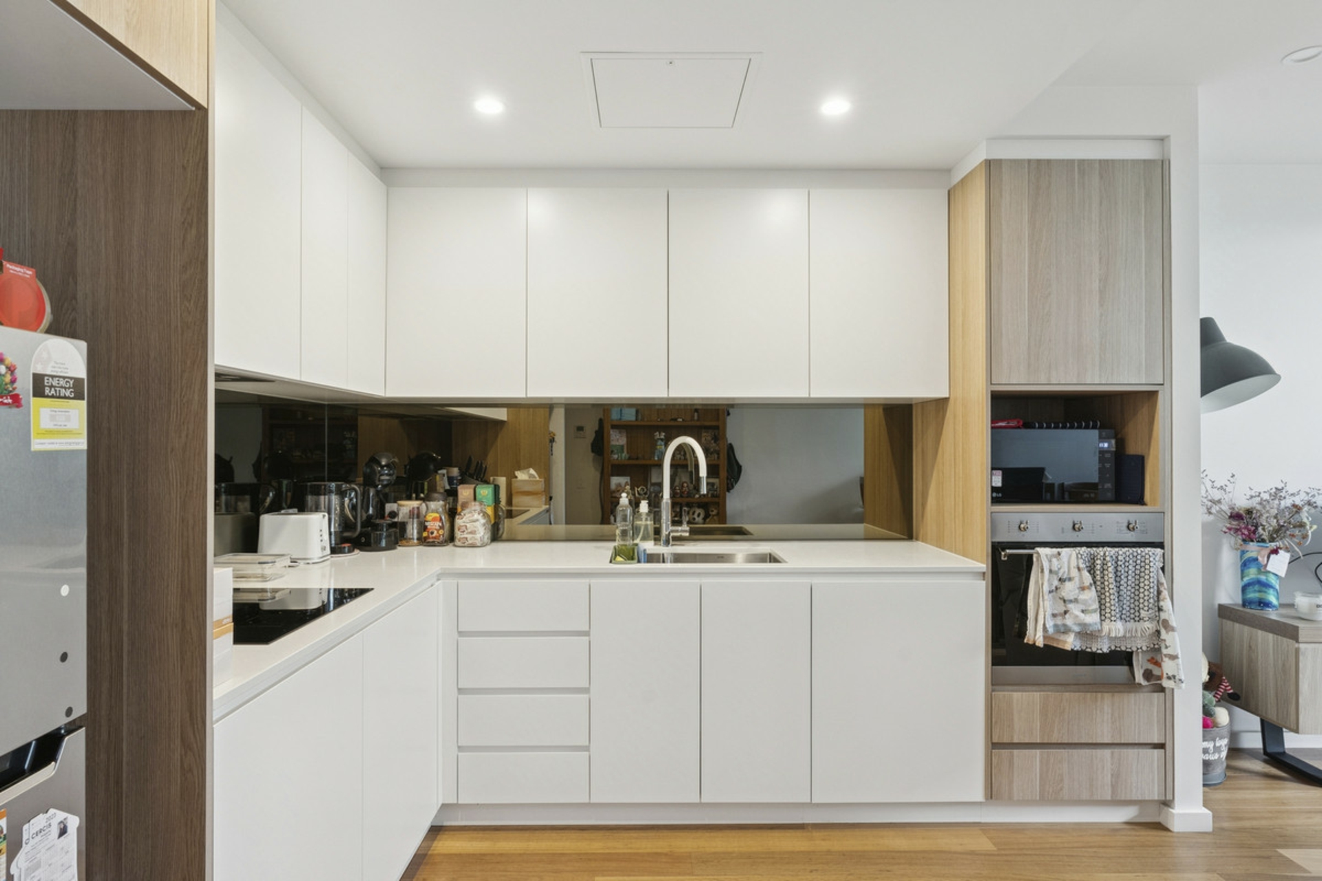 The L-shaped corner kitchen features dark smoke grey splashback, slimline stone benchtops and premium SMEG appliances, delivering both style and functionality. The spacious bedroom includes a built-in wardrobe, while the modern bathroom showcases sleek floor-to-ceiling tiles, chrome fittings and a European-style laundry with dryer.