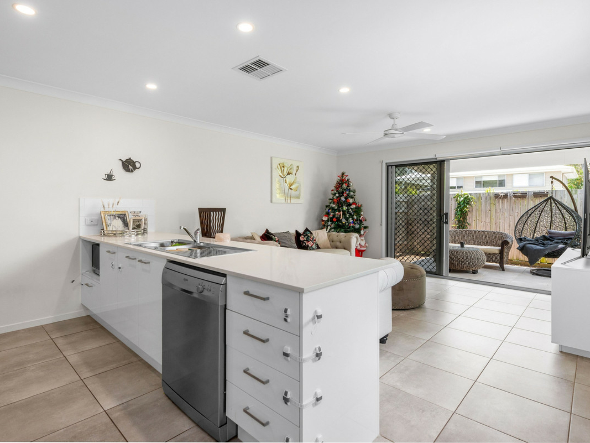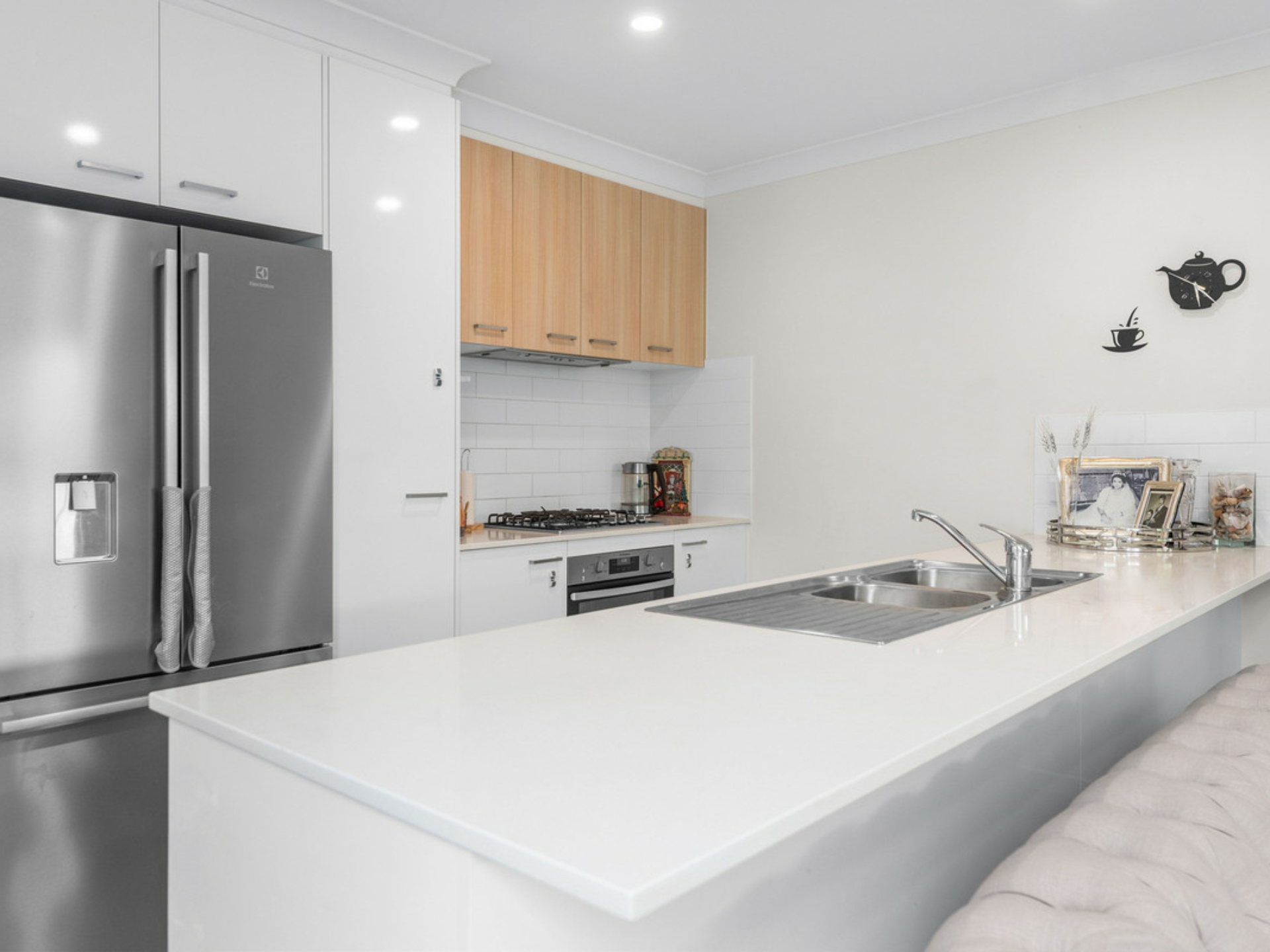 - The Caesarstone kitchen works perfectly with the living space and features an island bench, tiled splash back, quality cabinetry, gas cooktop and stainless steel oven and dishwasher