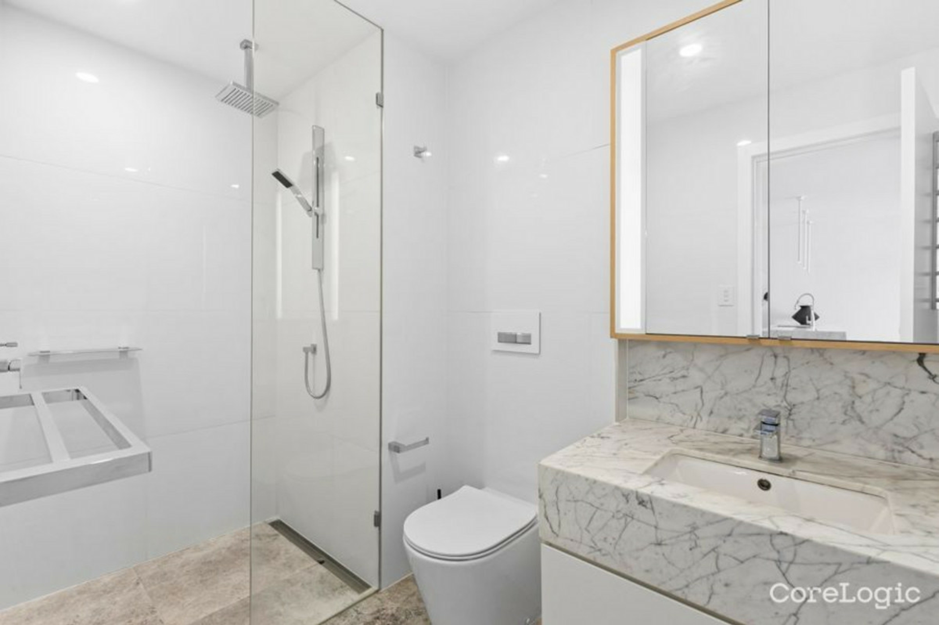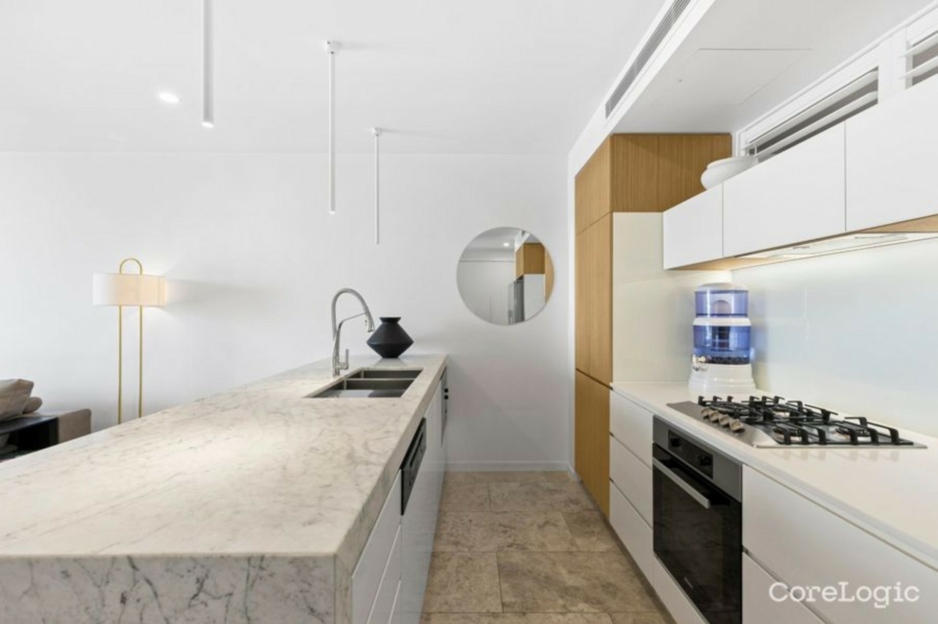 High-end finishes throughout include limestone floor tiles, timber accents, and luxurious marble benchtops, adding to the apartment's refined appeal.