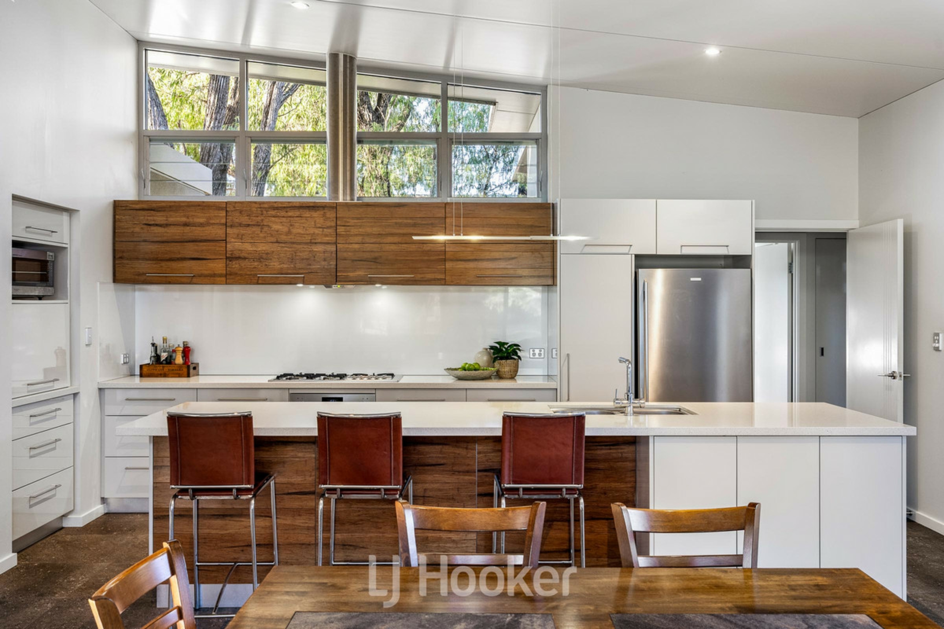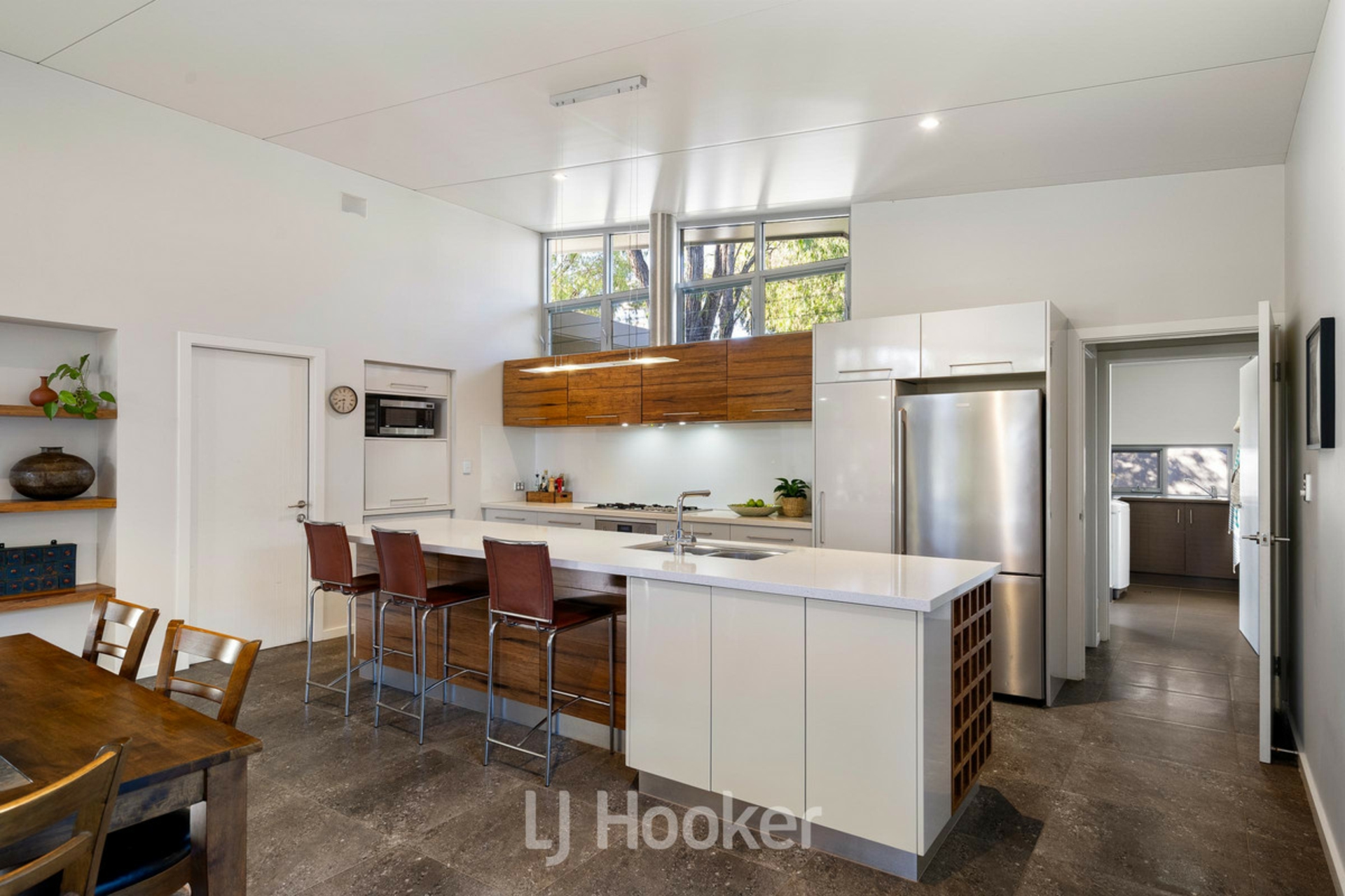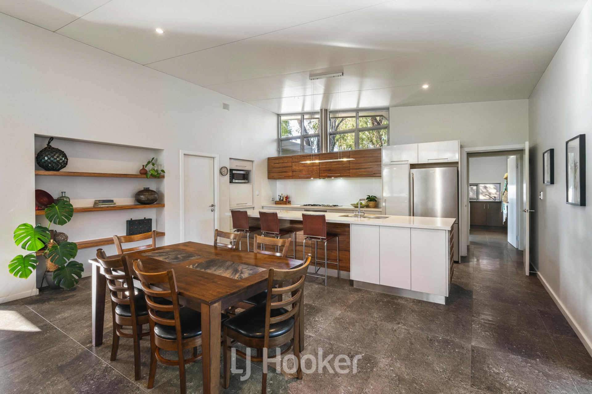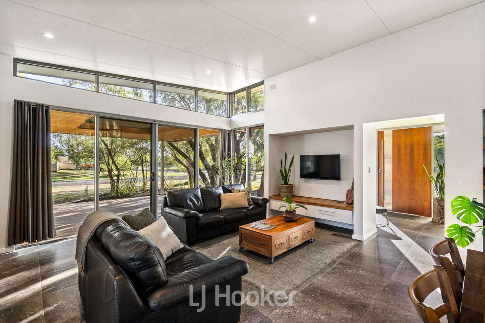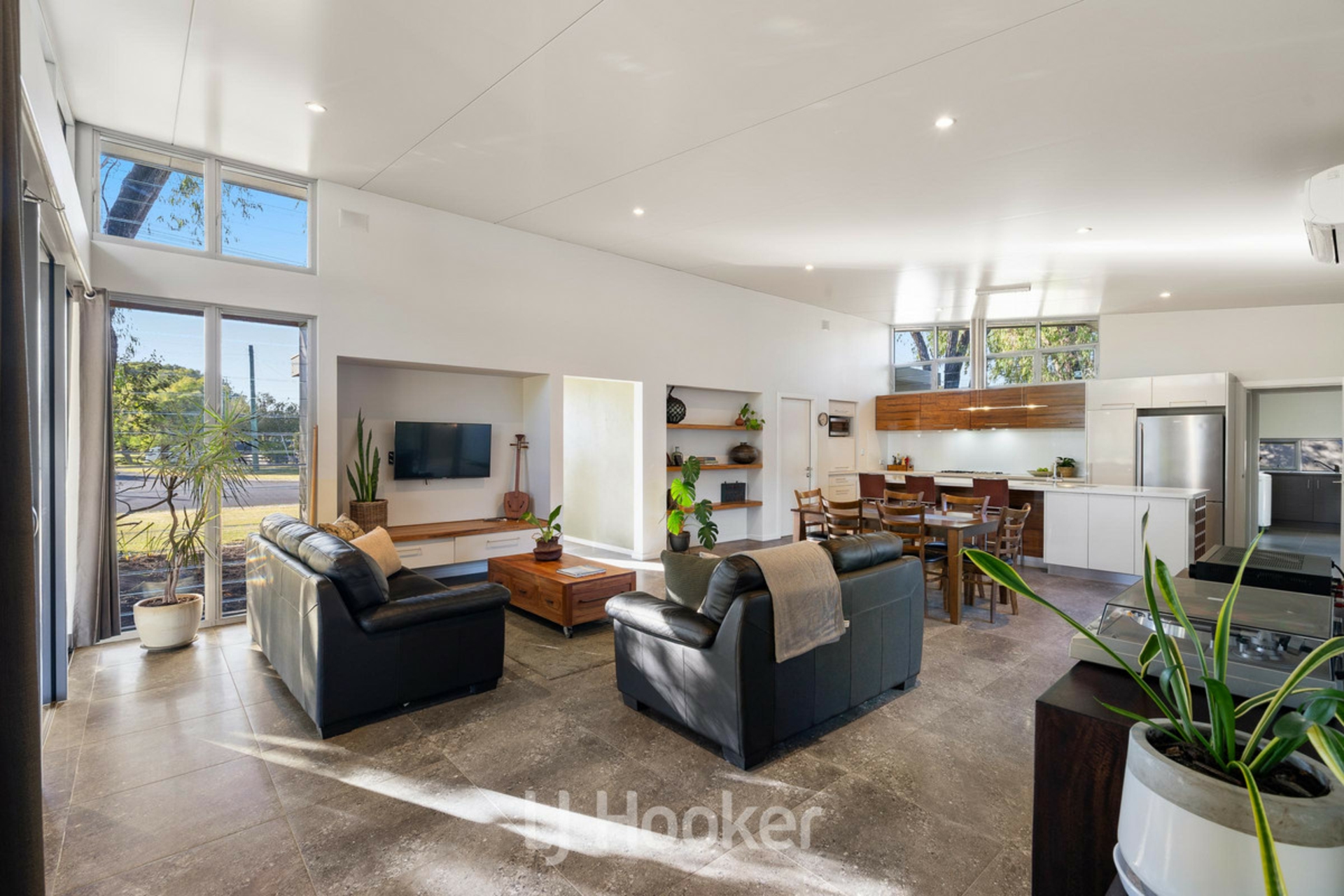 Large central open plan living /dining area with soaring ceilings, clean lines and louvered windows lets in natural light and naturally ventilates room.