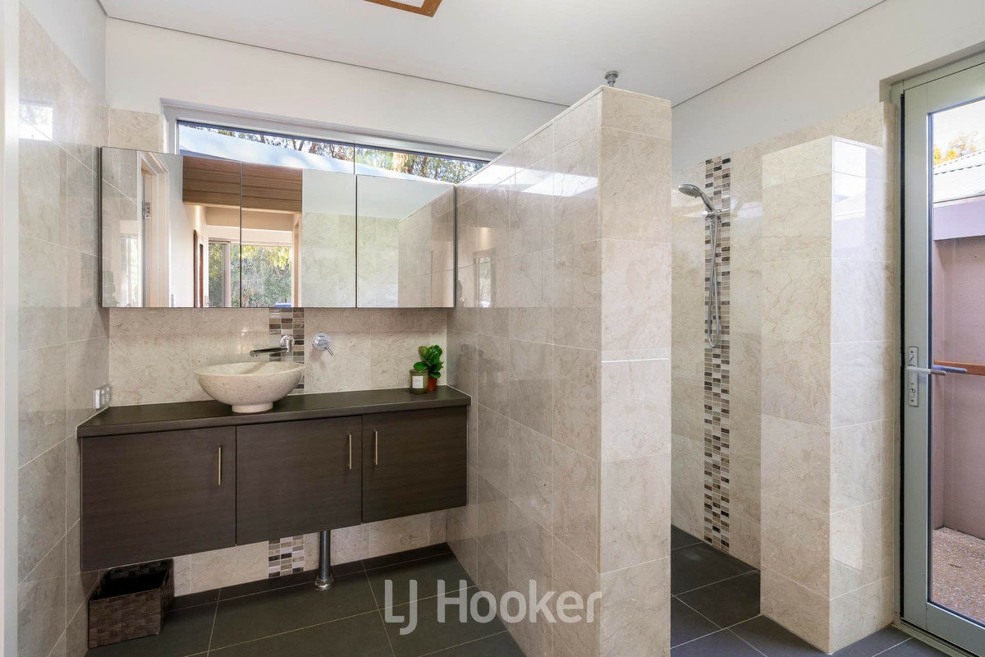 Glass door leads from ensuite to outside private courtyard shower ideal for when coming back from the beach