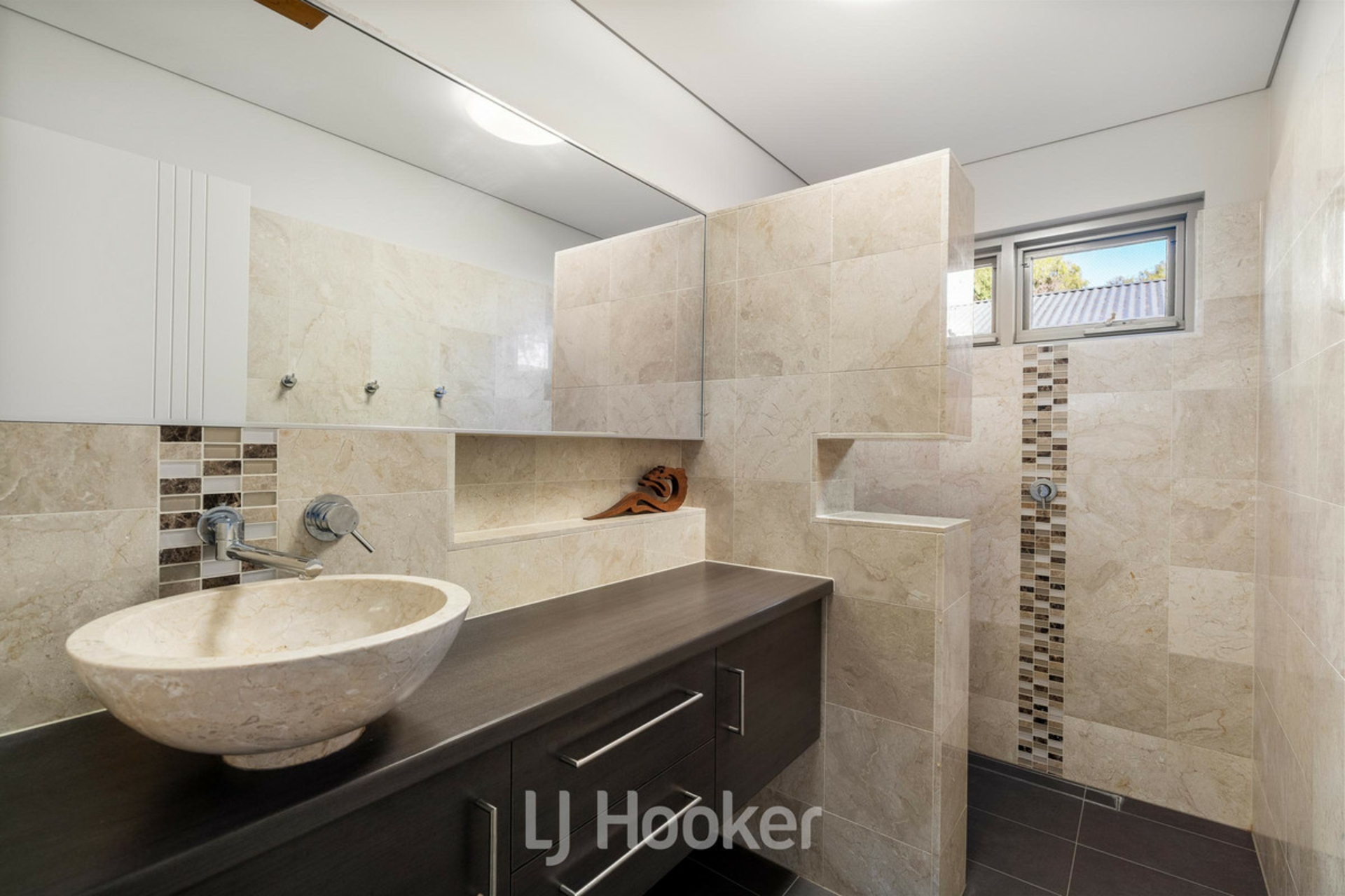 2 spacious minor bedrooms with double door robes and bathroom in between again with marble floor and wall tiles and marble bowl on suspended vanity.