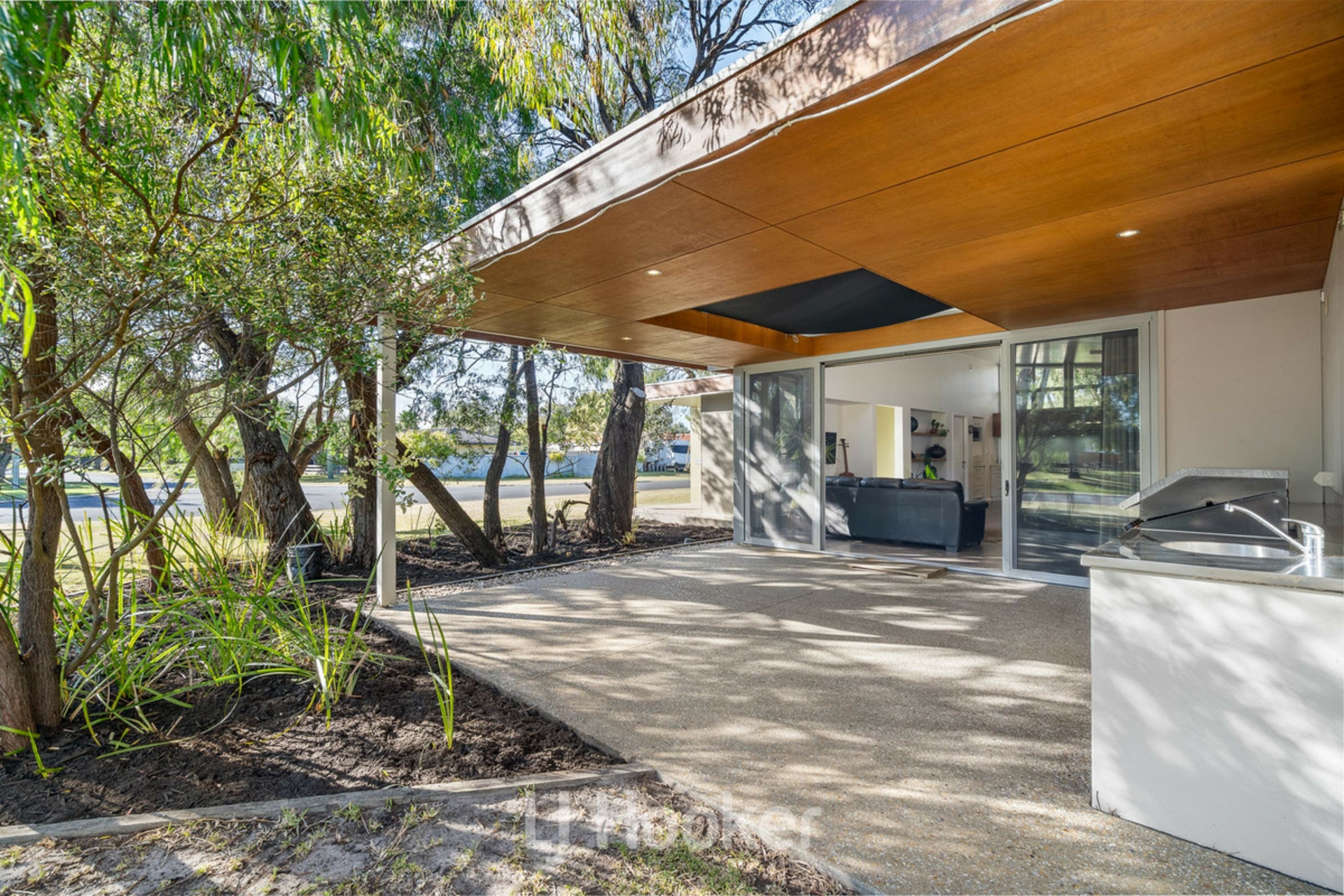 Commercial grade glass sliding door leads out to north facing Alfresco area with Built in Outdoor BBQ area complete with S/S bench top with sink