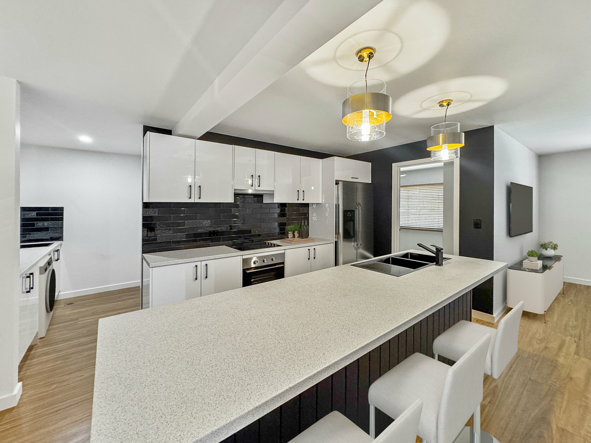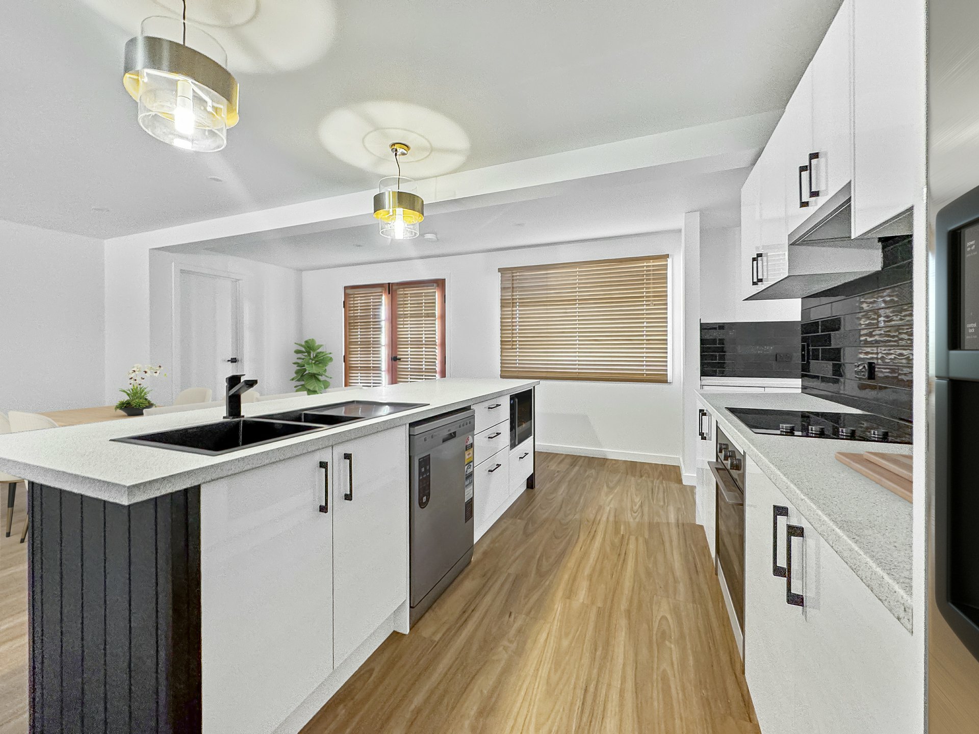 - Kitchen features a large island bench with breakfast bar, dishwasher, double sink, microwave cavity, electric cooking and complemented by the twin pendant lights