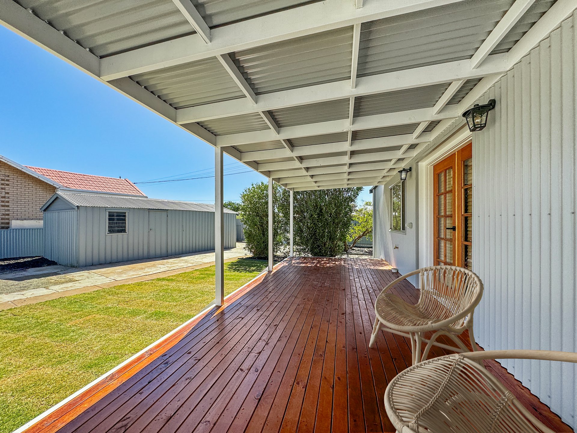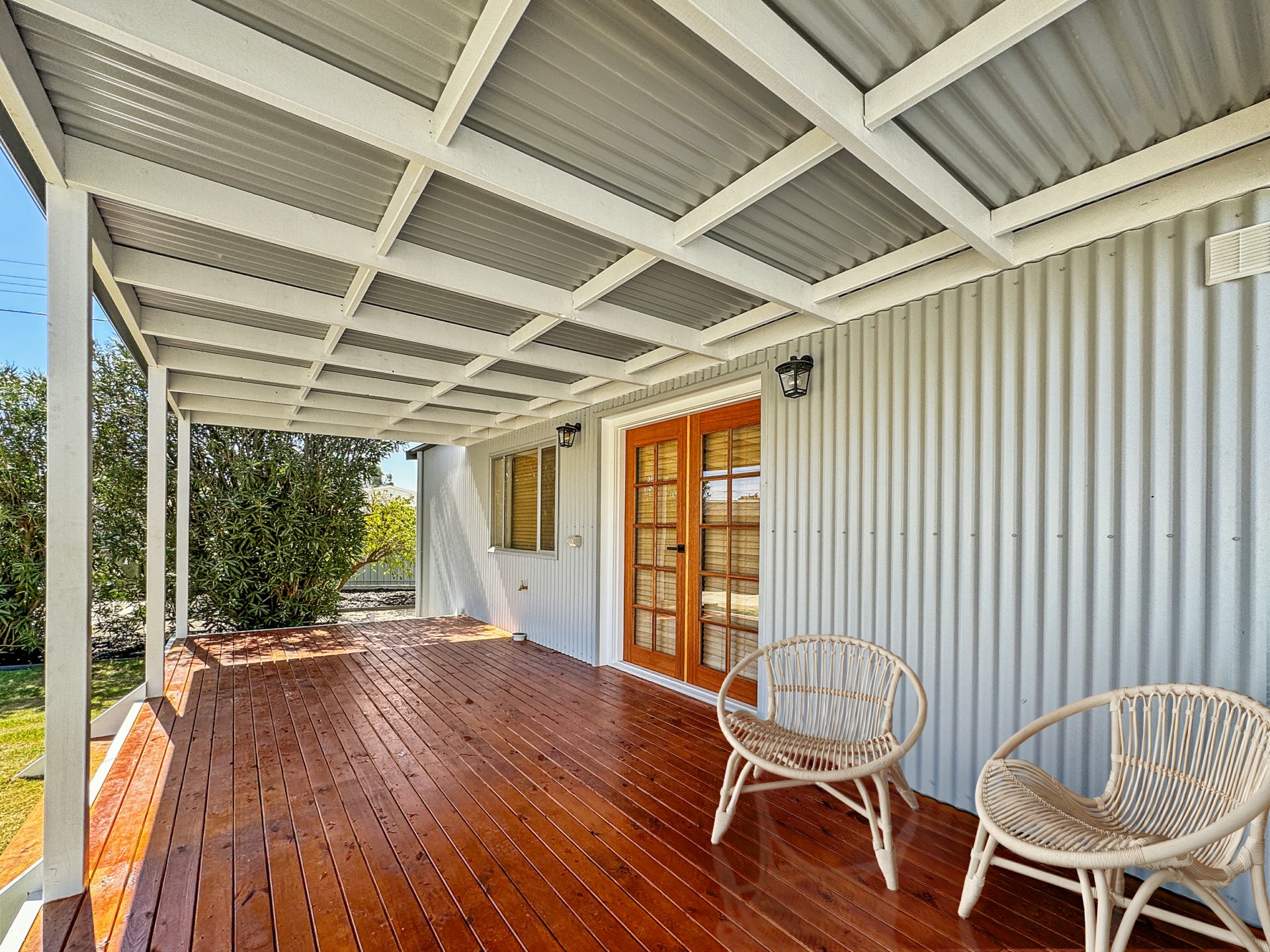- Timber French doors lead onto the undercover decking with coach lights and large shrubs for afternoon shade