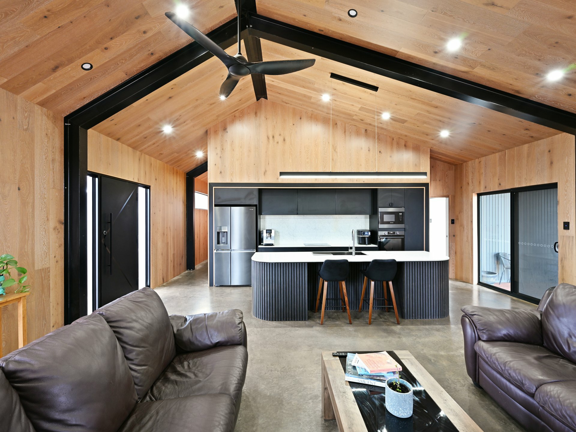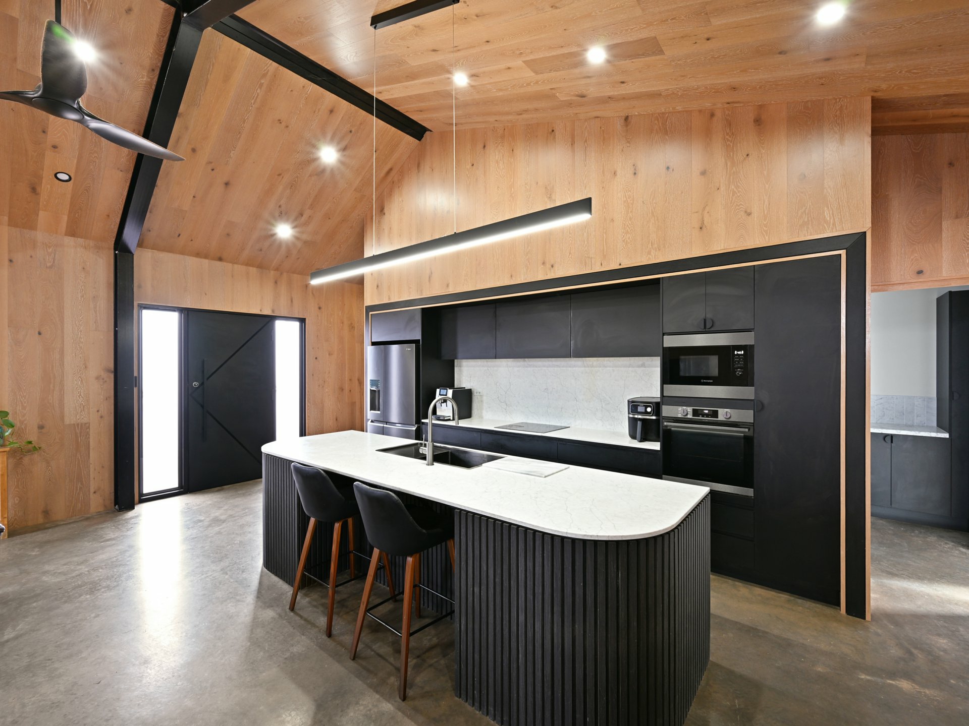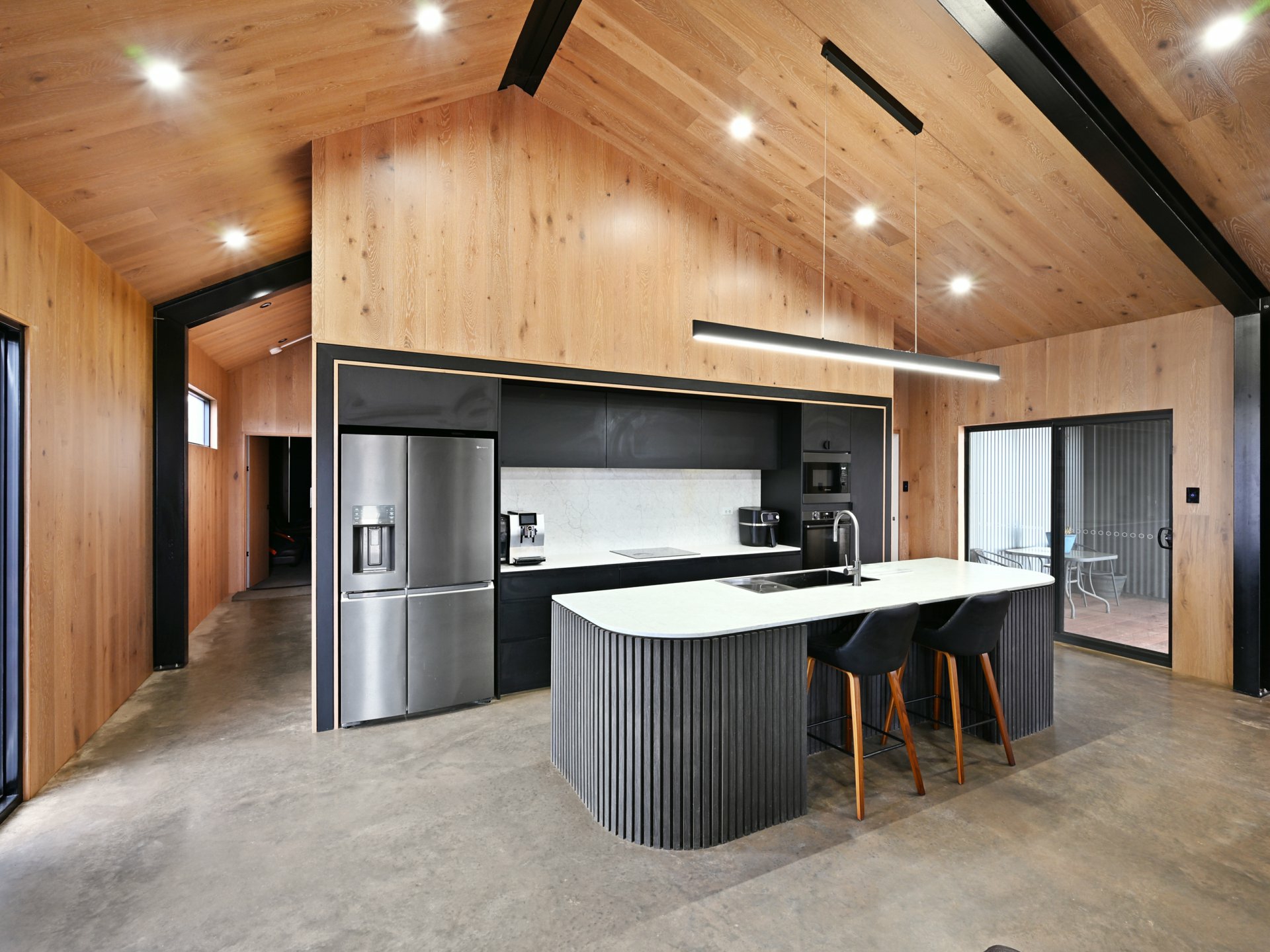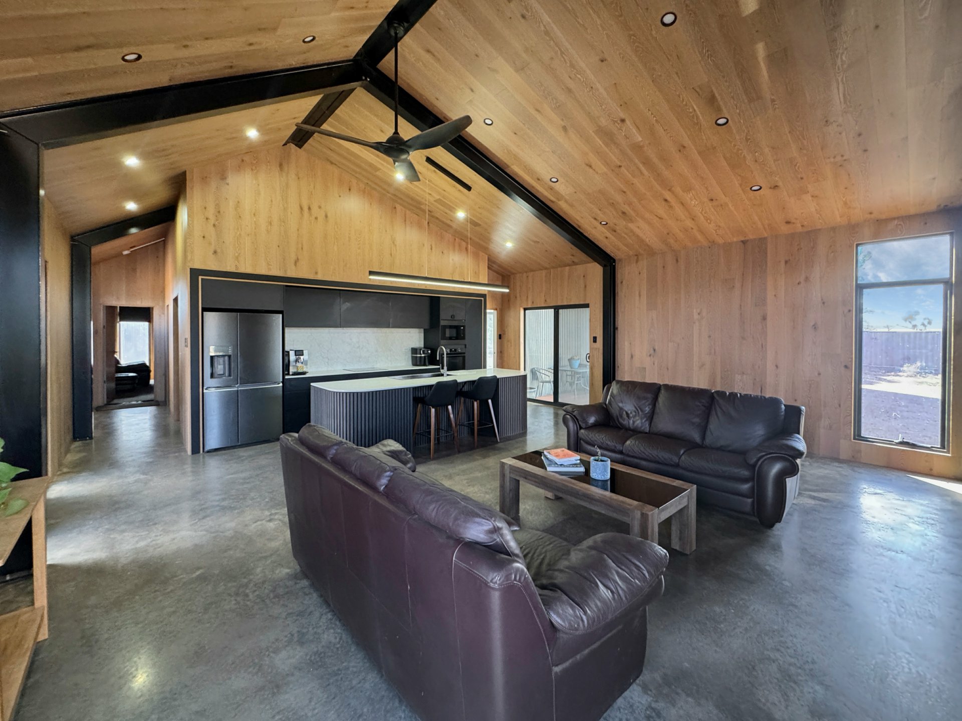 A striking open-plan design creates the perfect environment for modern family living, enhanced by soaring ceilings and expansive polished concrete floors. At the heart of the home, the designer kitchen balances form and function—featuring sleek marble benchtops and splashback, integrated dishwasher, pull-out pantry, statement feature lighting that elevates both style and practicality. A bold black timber surround defines the kitchen zone, offering a stunning visual contrast to the warm hardwood and creates strong, design forward statement.