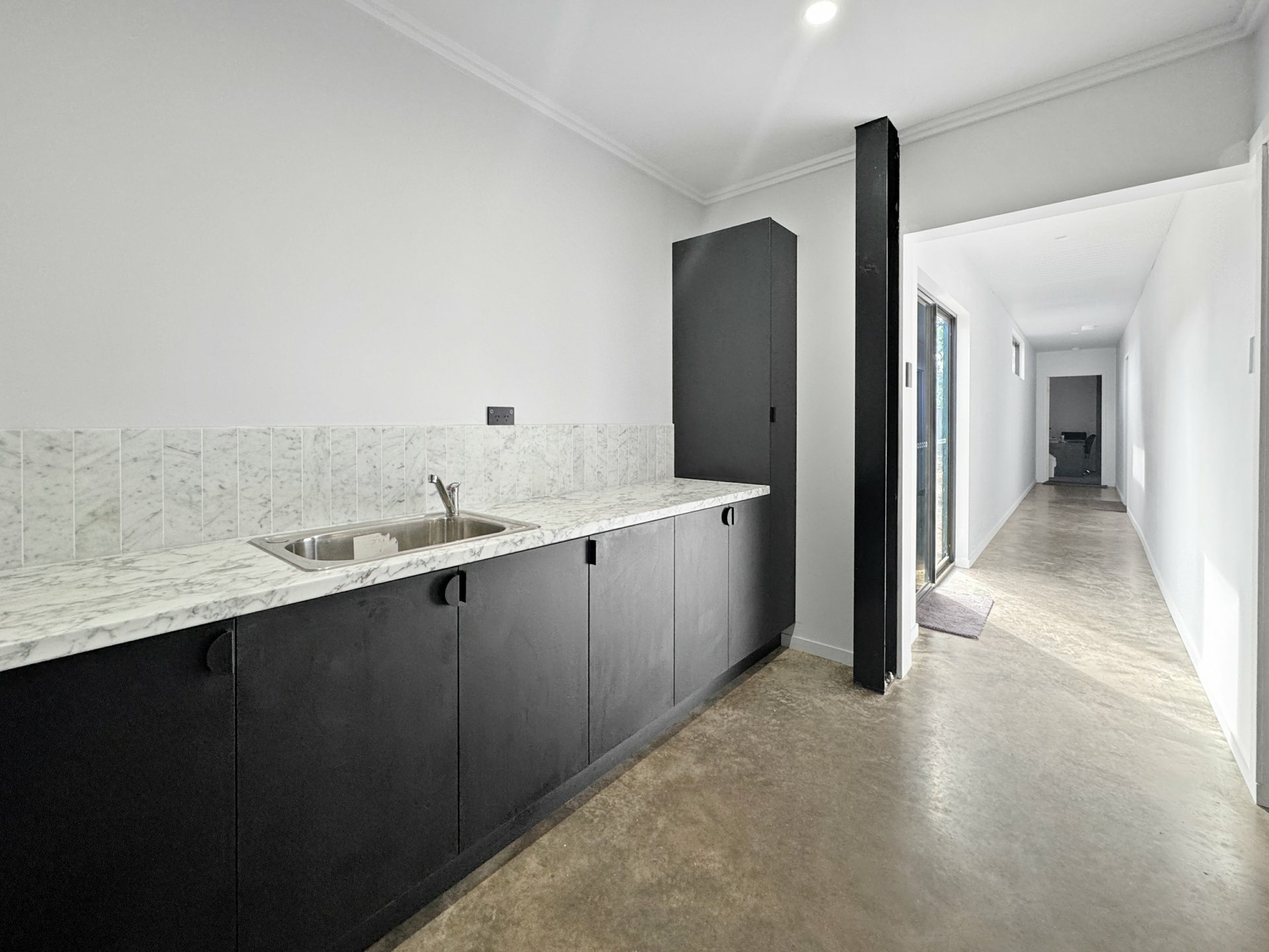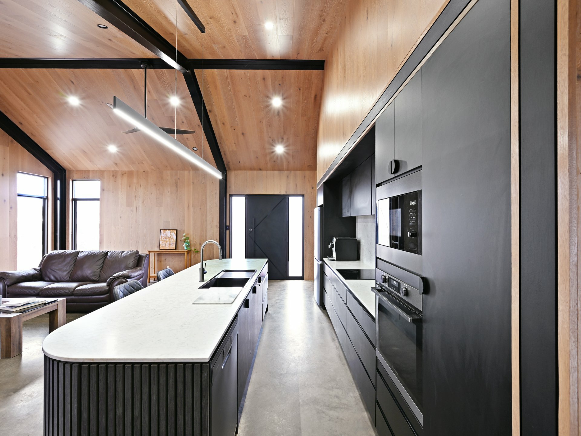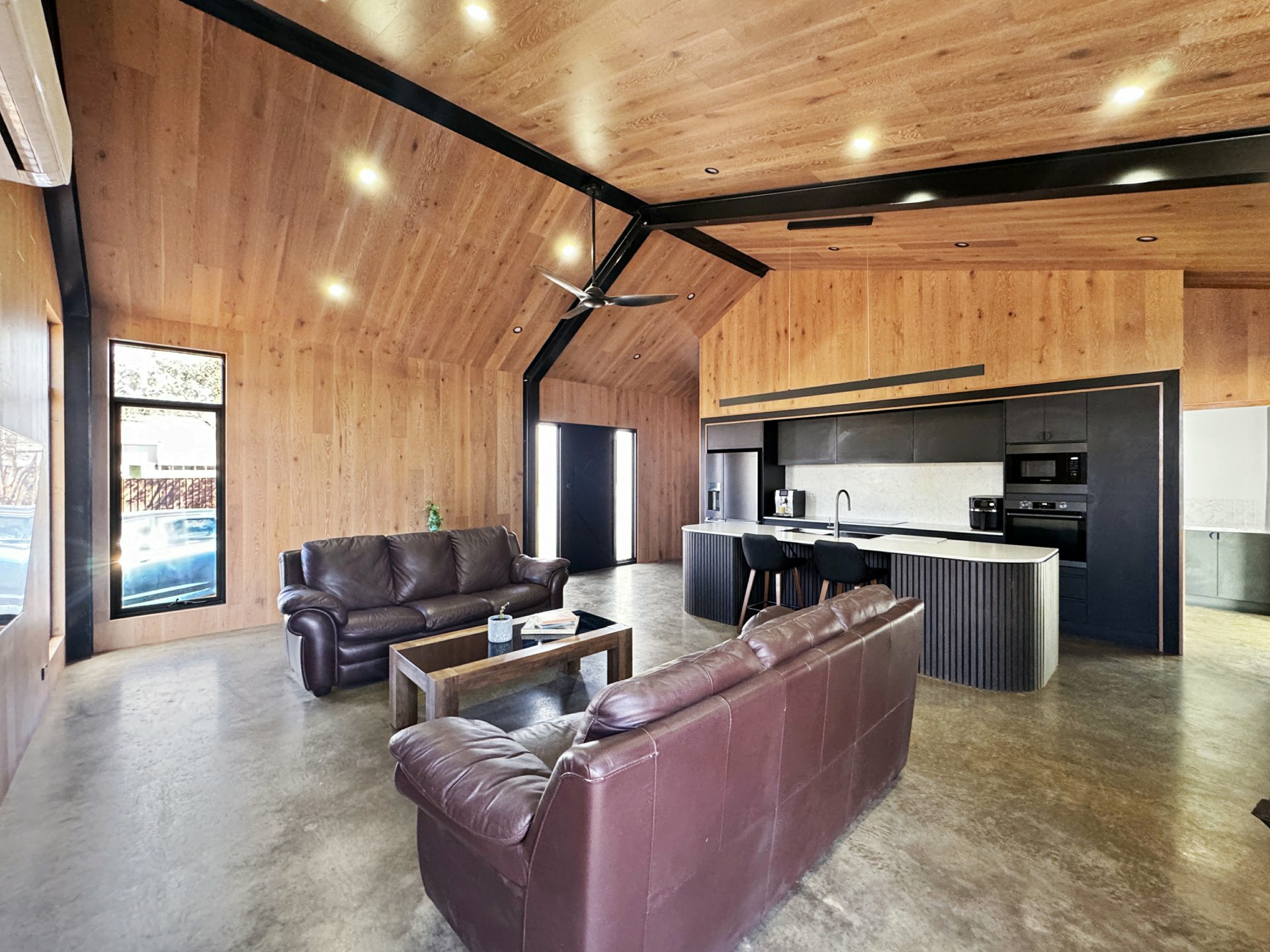 A striking open-plan design creates the perfect environment for modern family living, enhanced by soaring ceilings and expansive polished concrete floors. At the heart of the home, the designer kitchen balances form and function—featuring sleek marble benchtops and splashback, integrated dishwasher, pull-out pantry, statement feature lighting that elevates both style and practicality. A bold black timber surround defines the kitchen zone, offering a stunning visual contrast to the warm hardwood and creates strong, design forward statement.