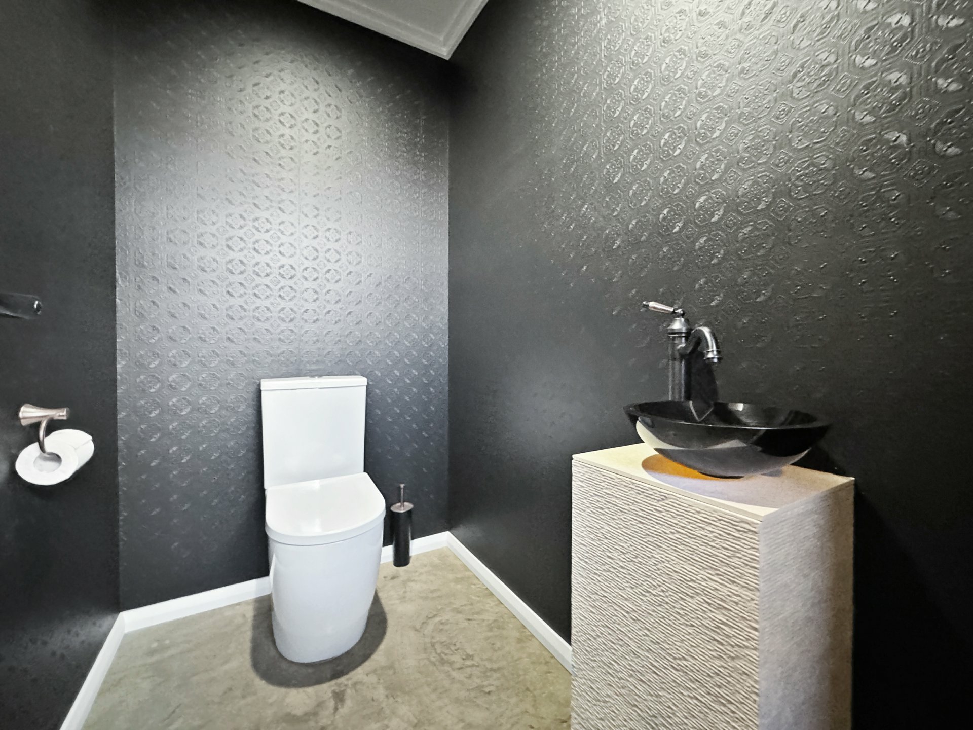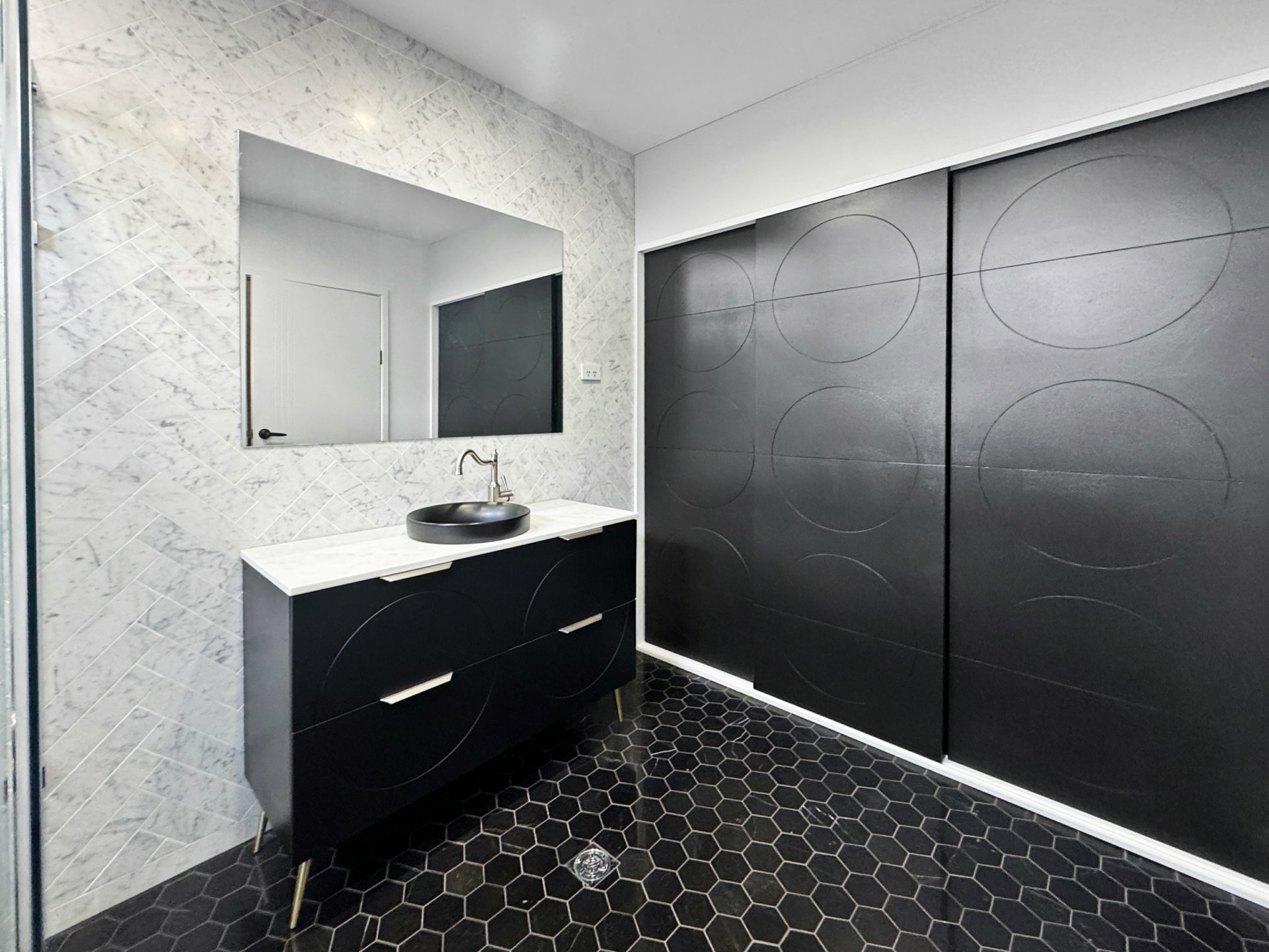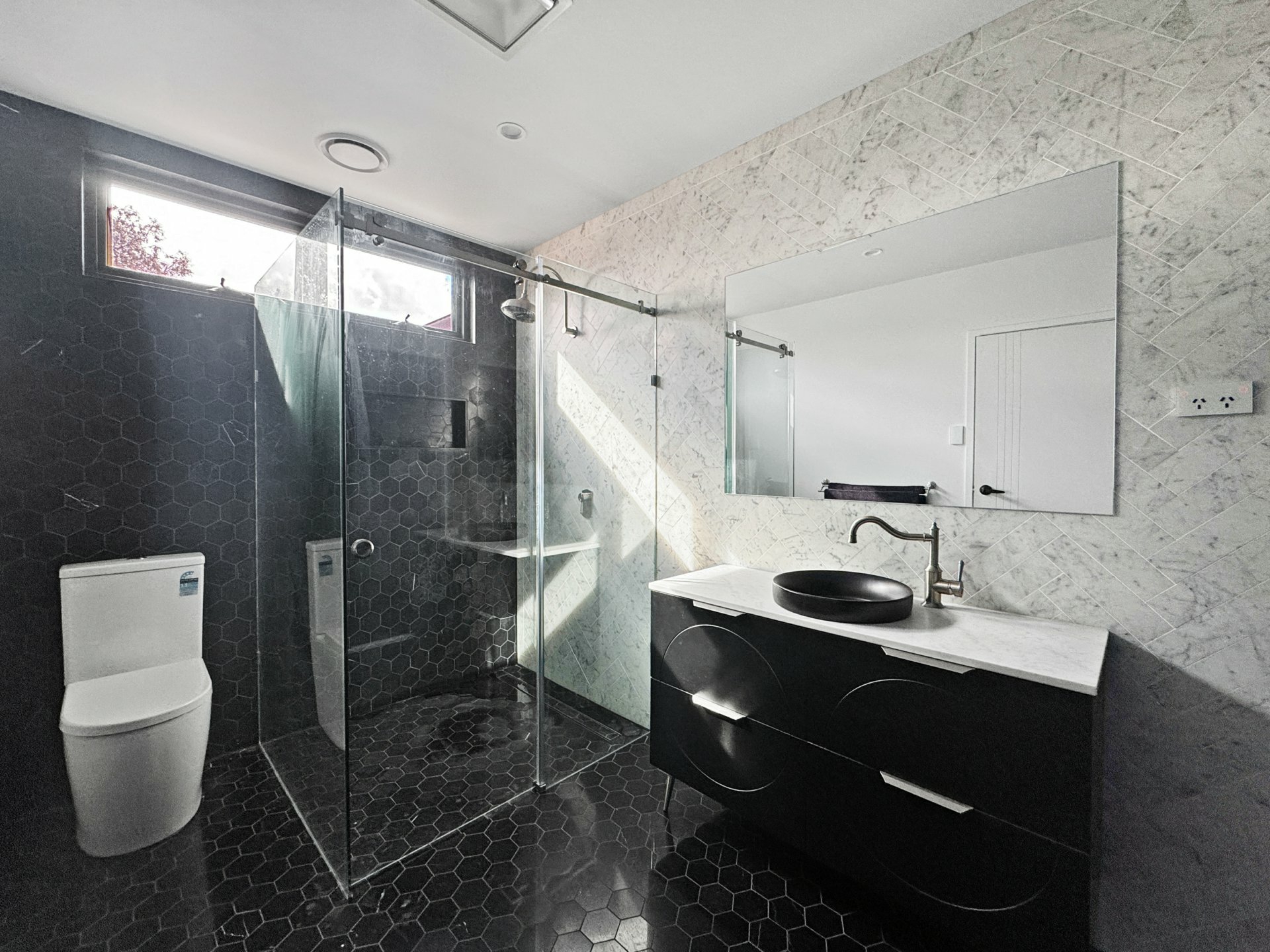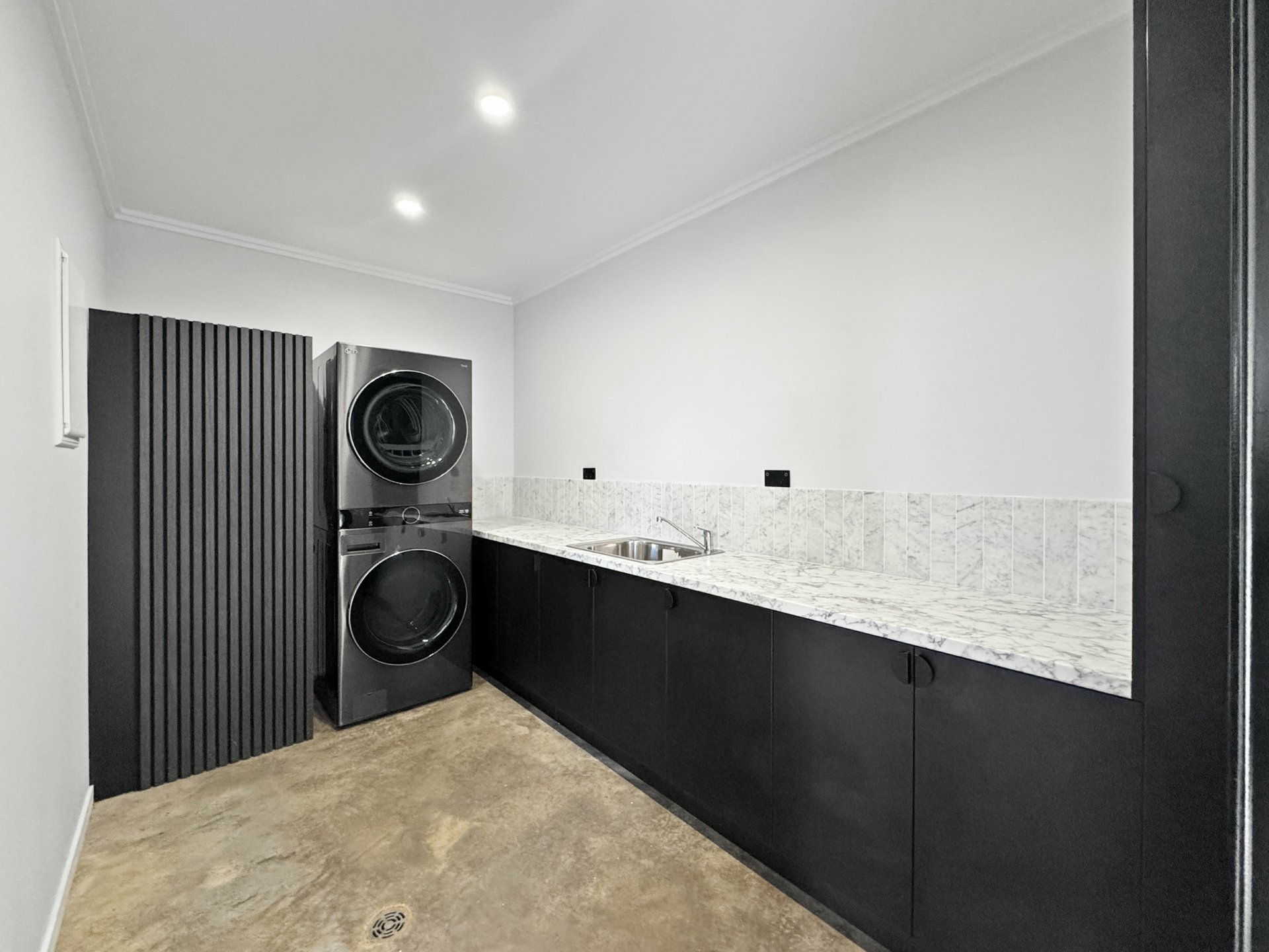 A striking open-plan design creates the perfect environment for modern family living, enhanced by soaring ceilings and expansive polished concrete floors. At the heart of the home, the designer kitchen balances form and function—featuring sleek marble benchtops and splashback, integrated dishwasher, pull-out pantry, statement feature lighting that elevates both style and practicality. A bold black timber surround defines the kitchen zone, offering a stunning visual contrast to the warm hardwood and creates strong, design forward statement.