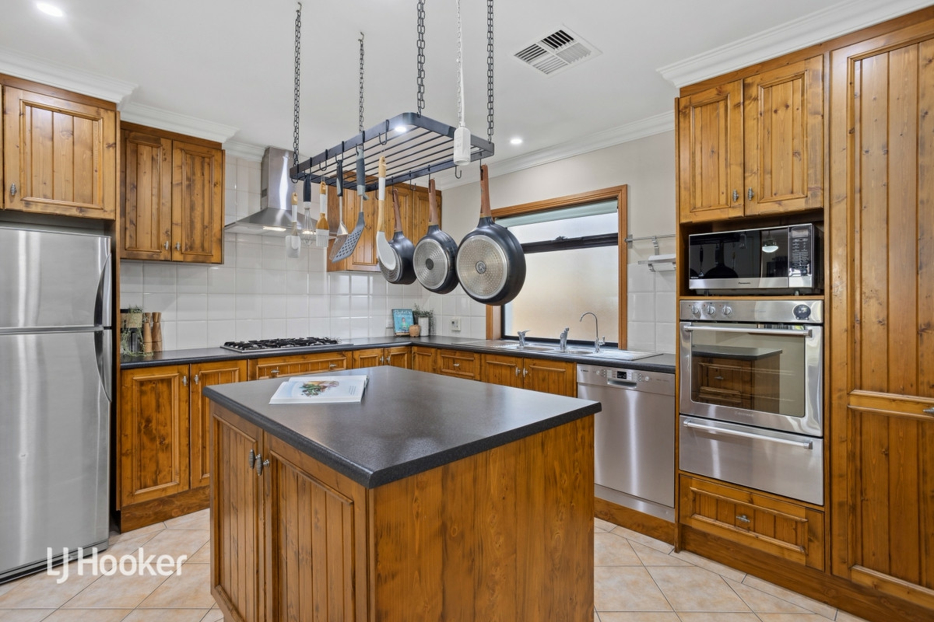 The timber kitchen is traditional, gas hotplates, stainless steel extractor with granite look, laminate benchtops and a central island. It has loads of clever storage, a pantry pull out as well as a corner pantry. Cooks will appreciate the space and storage with a servery which could be modified to open up the kitchen creating a breakfast bar to the family area. The large modern laundry with floor to ceiling cupboards and room for a second fridge/freezer ensures this home will cater for the busiest family