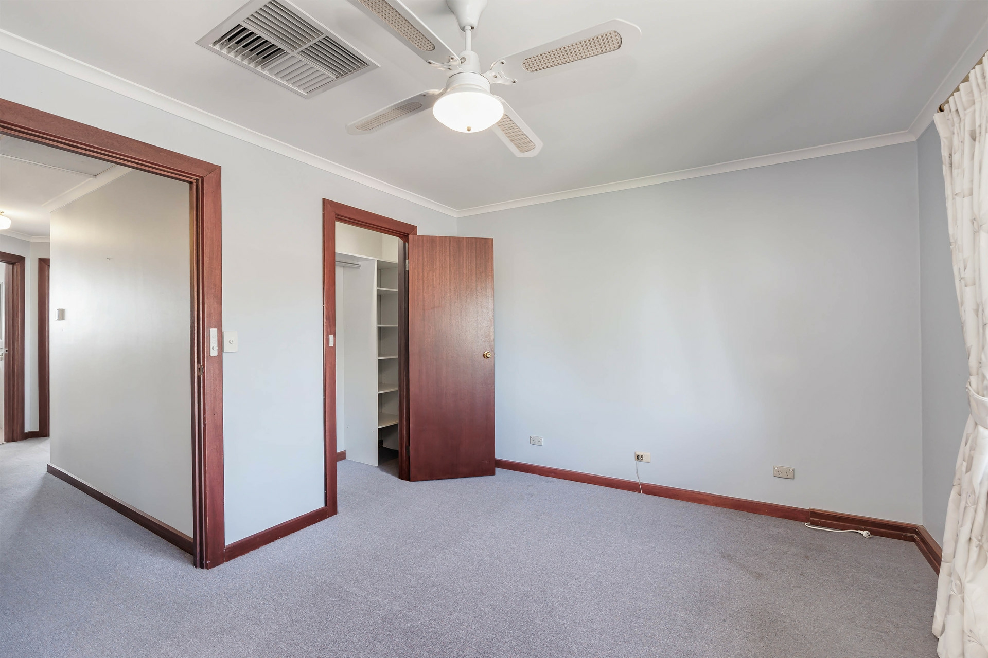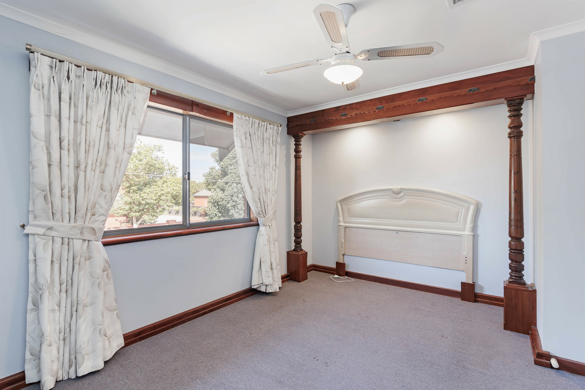 Upstairs comprises three spacious bedrooms, all with built-in wardrobes and window furnishings. The master bedroom features a walk-in robe, ceiling fan, and a unique art-deco style built-in timber bedframe. The main bathroom is also located upstairs and includes a bath, separate shower alcove, vanity, and WC.