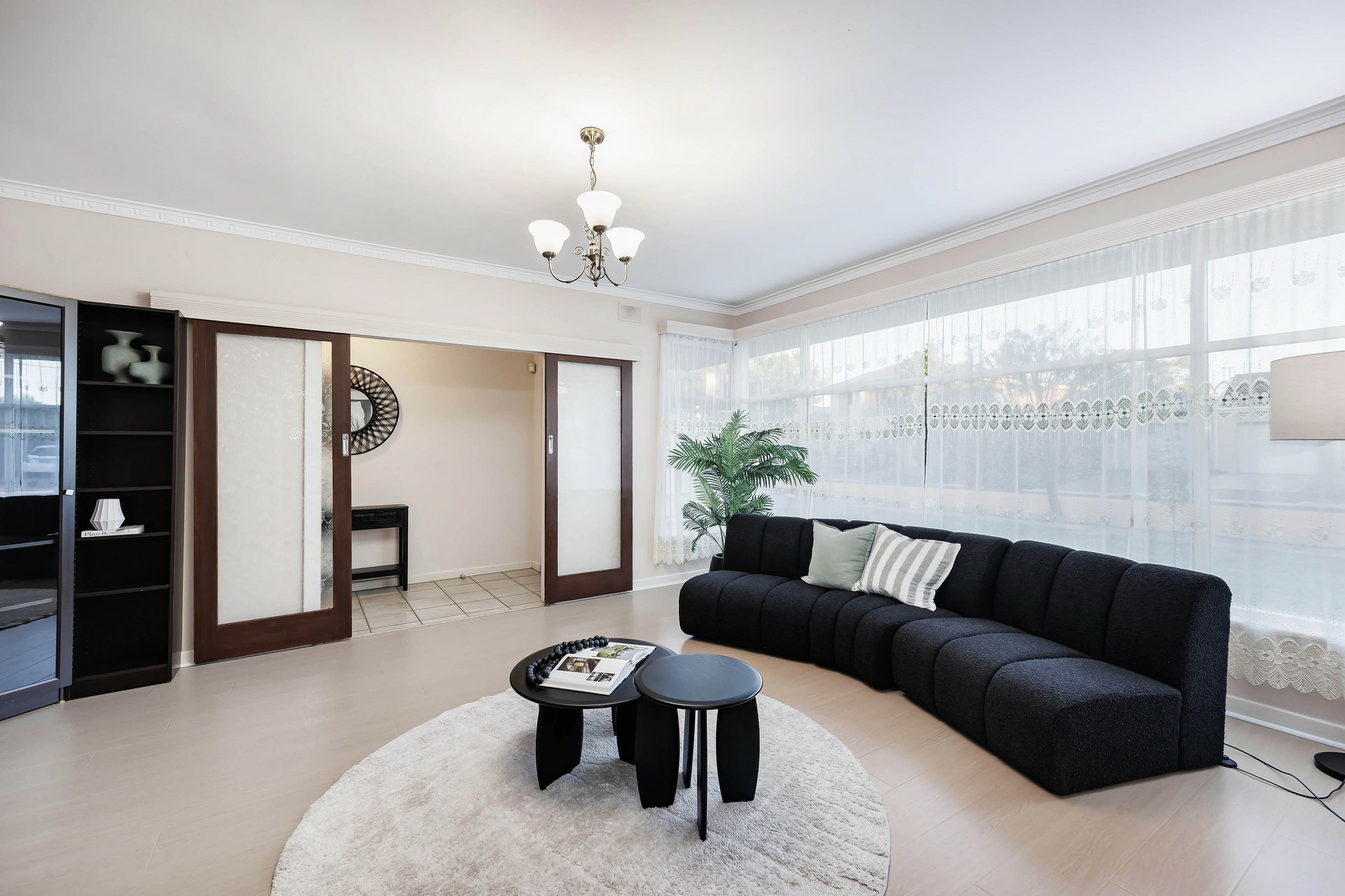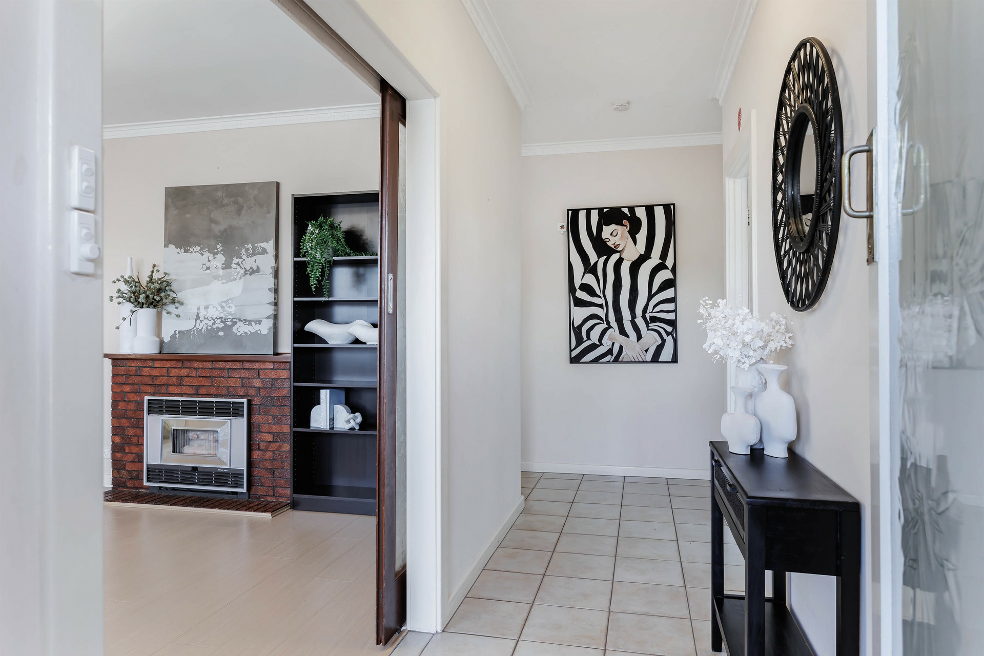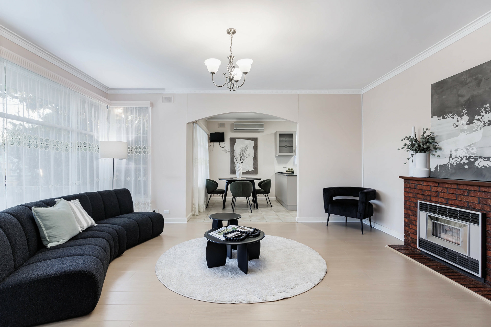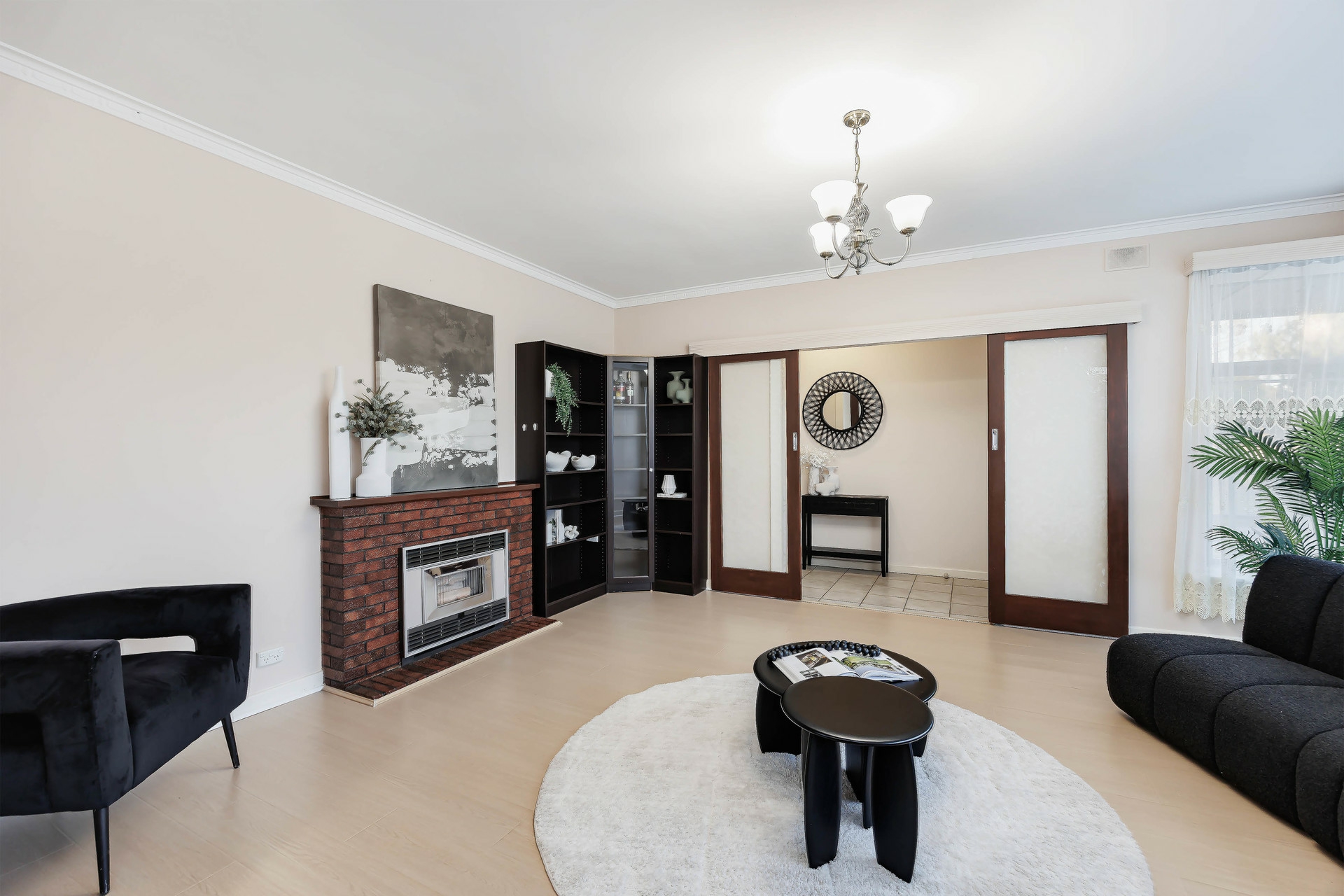 Spacious light-filled lounge with feature fireplace