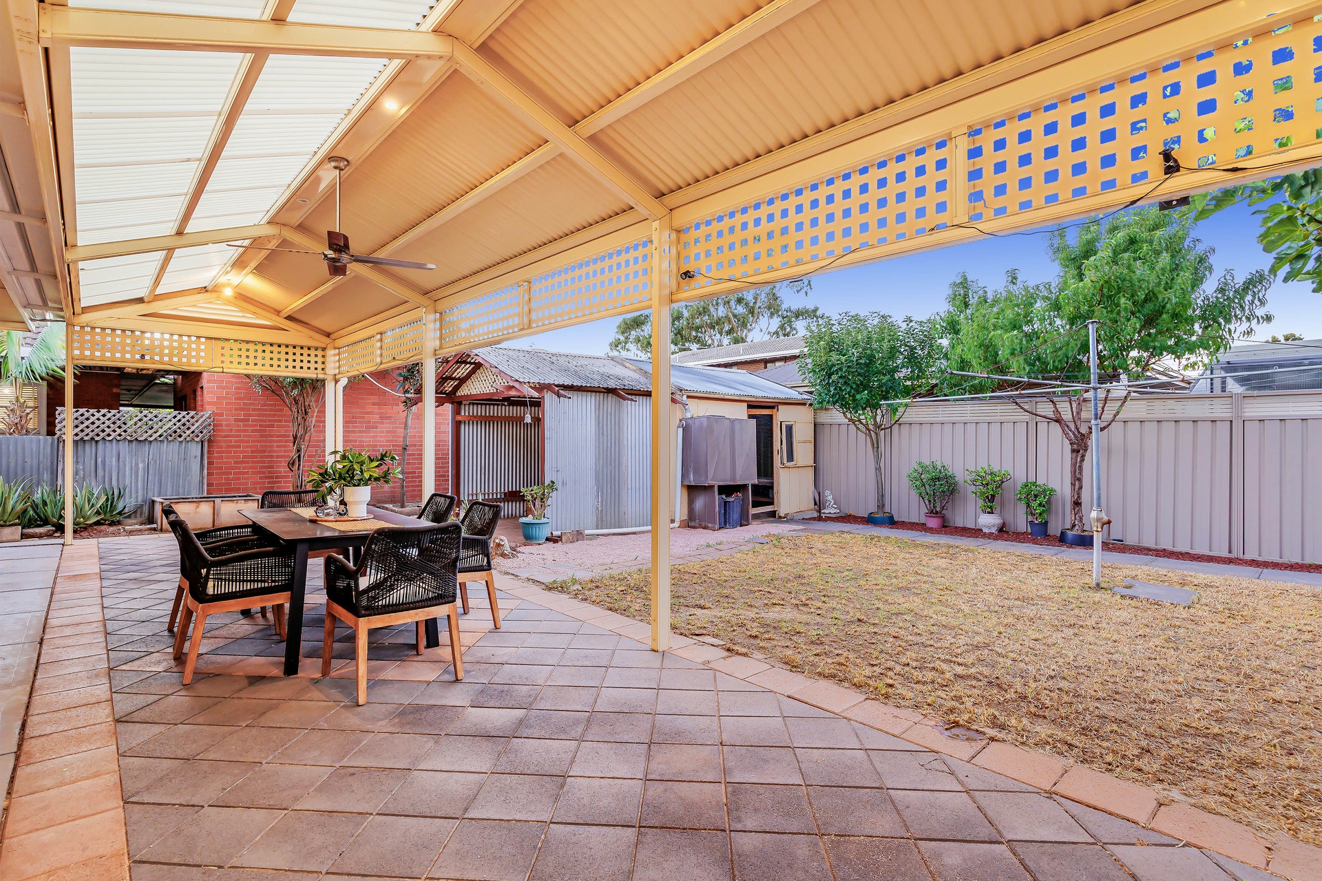 Stepping outside, the property continues to impress with expansive outdoor space, including a large pergola entertaining area, lawn for children and pets, and a substantial garage/shed plus long carport providing excellent storage and vehicle accommodation. The wide frontage and generous allotment further highlight the future development possibilities (subject to planning consent).