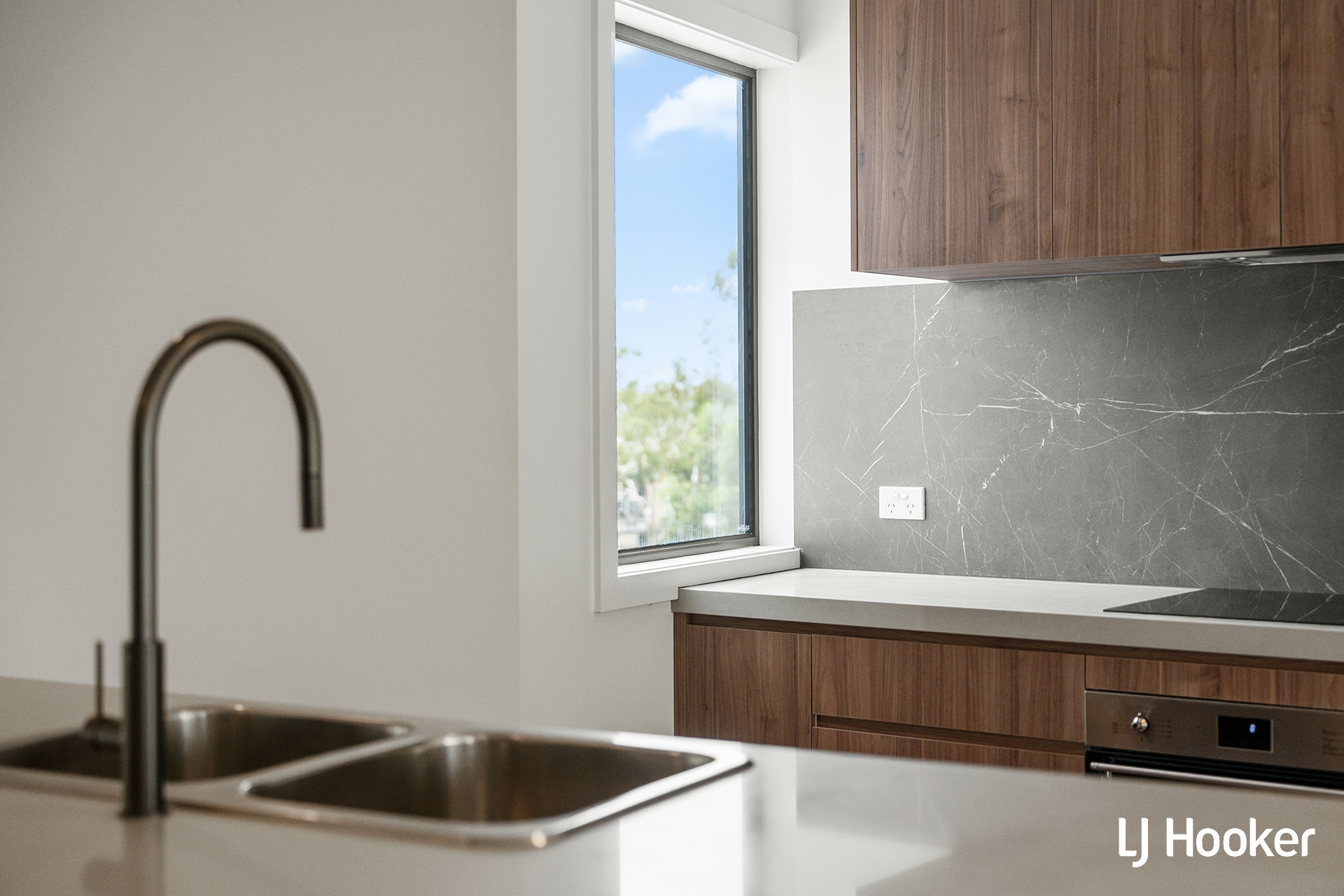 •Kitchen with island bench and stone benchtops