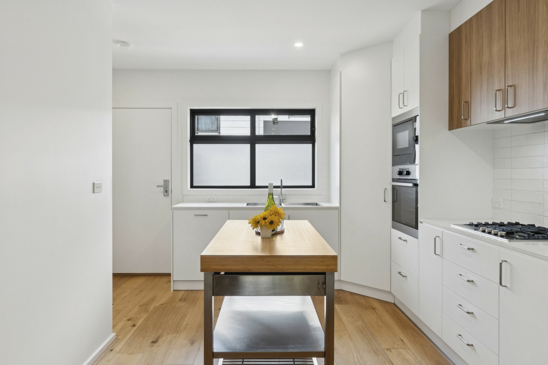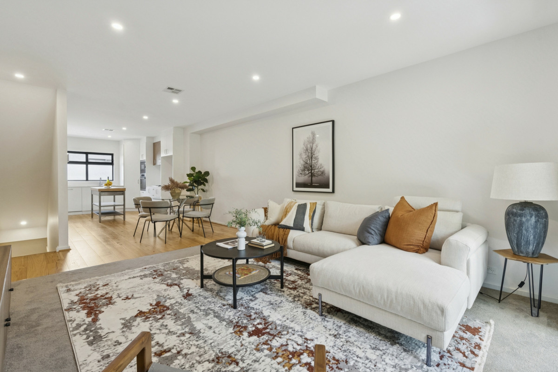 The heart of the home is located on the ground level, featuring an expansive open-plan living and dining area. The designer kitchen is a chef's dream, appointed with premium AEG appliances, built-in dishwasher and microwave, sleek stone benchtops, soft-close cabinetry, and a versatile island bench.